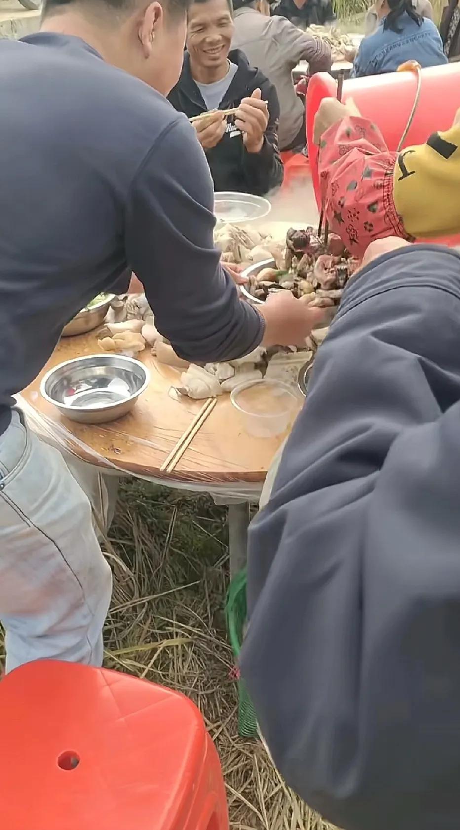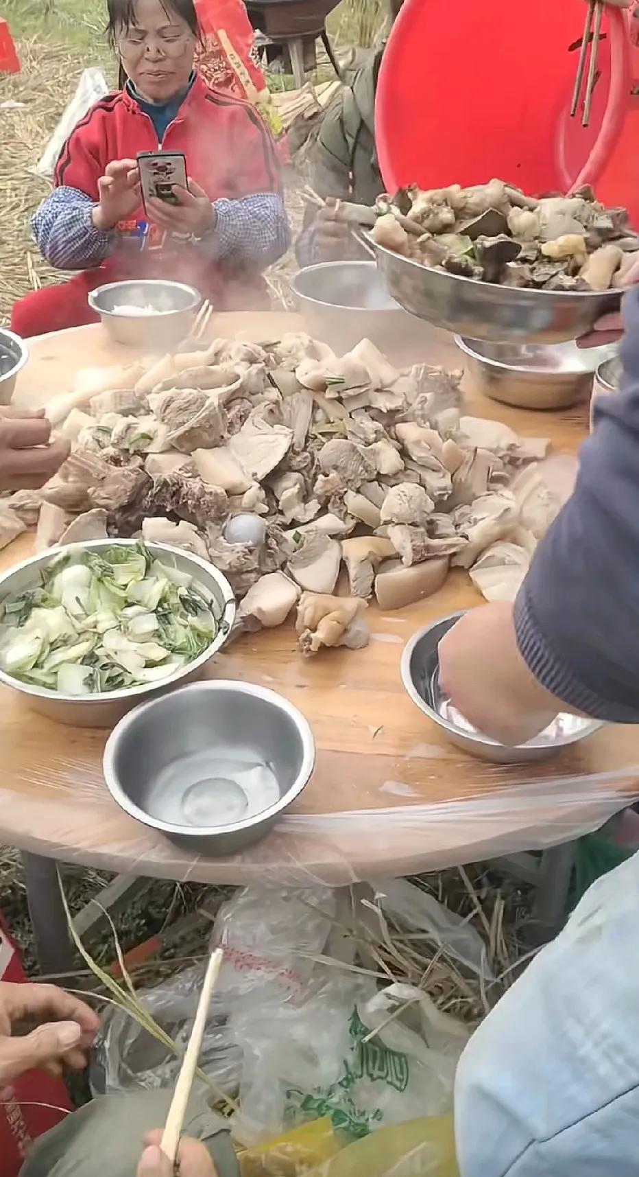 猜猜这是哪里的吃法?这么豪横!直接一桶洒桌上。这样也省了洗碗洗盘子了吧。第一次见这样直接把菜,肉没装盘子里上菜的。长见识了。[赞]