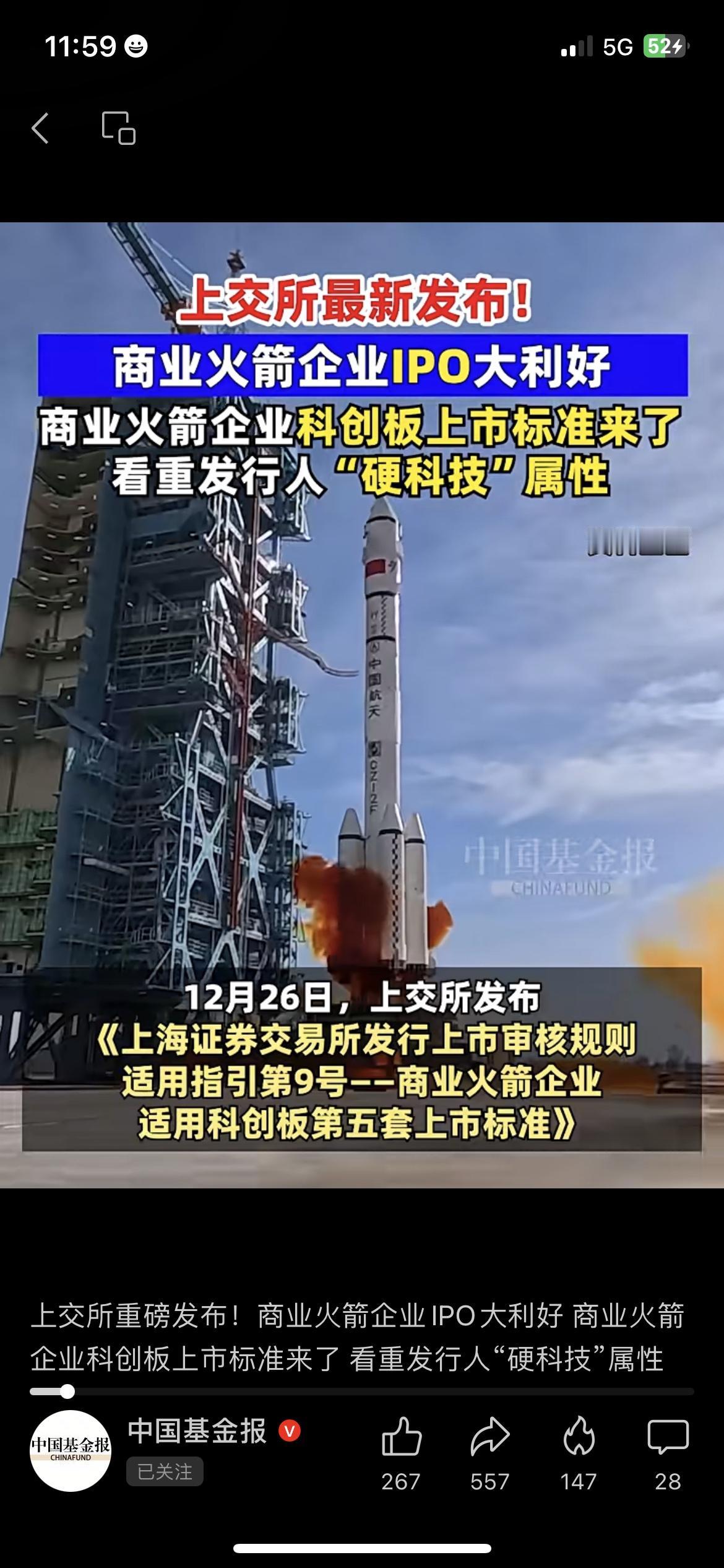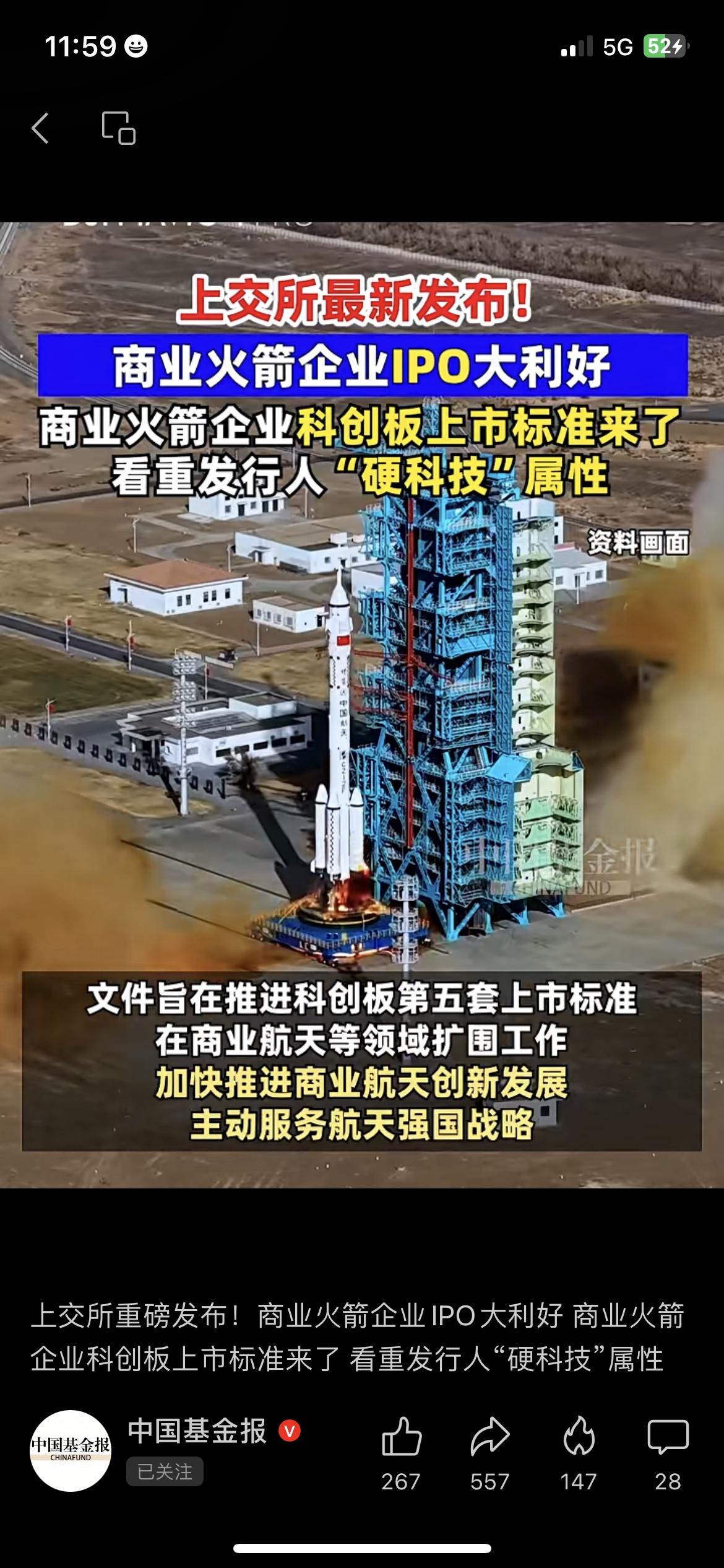 民营航天人终于等来了!科创板给商业火箭企业定上市规矩商业航天 浙江航天工程师老周,对着实验室里的火箭发动机样机,揉了揉熬红的眼睛,今天总算笑了。 他所在的民营火箭公司,三年砸光数亿研发硬科技,却一直摸不清科创板上市的门路。 上交所刚发14条细则,把商业火箭企业的硬科技属性列为上市核心,甚至细化了阶段性成果的认定标准。 老周说,这下公司的IPO计划终于有了清晰的时间表,民营航天不用再“摸着石头过河”。 新规还明确要对接航天强国战略,民营火箭也能扛起来国家航天事业的担子了。 你觉得民营航天企业上市后,会给商业航天赛道带来哪些变化?你最看好哪家民营航天公司的技术实力?中国商业航天 航天发展股票 航天科技控股 中科航天实业