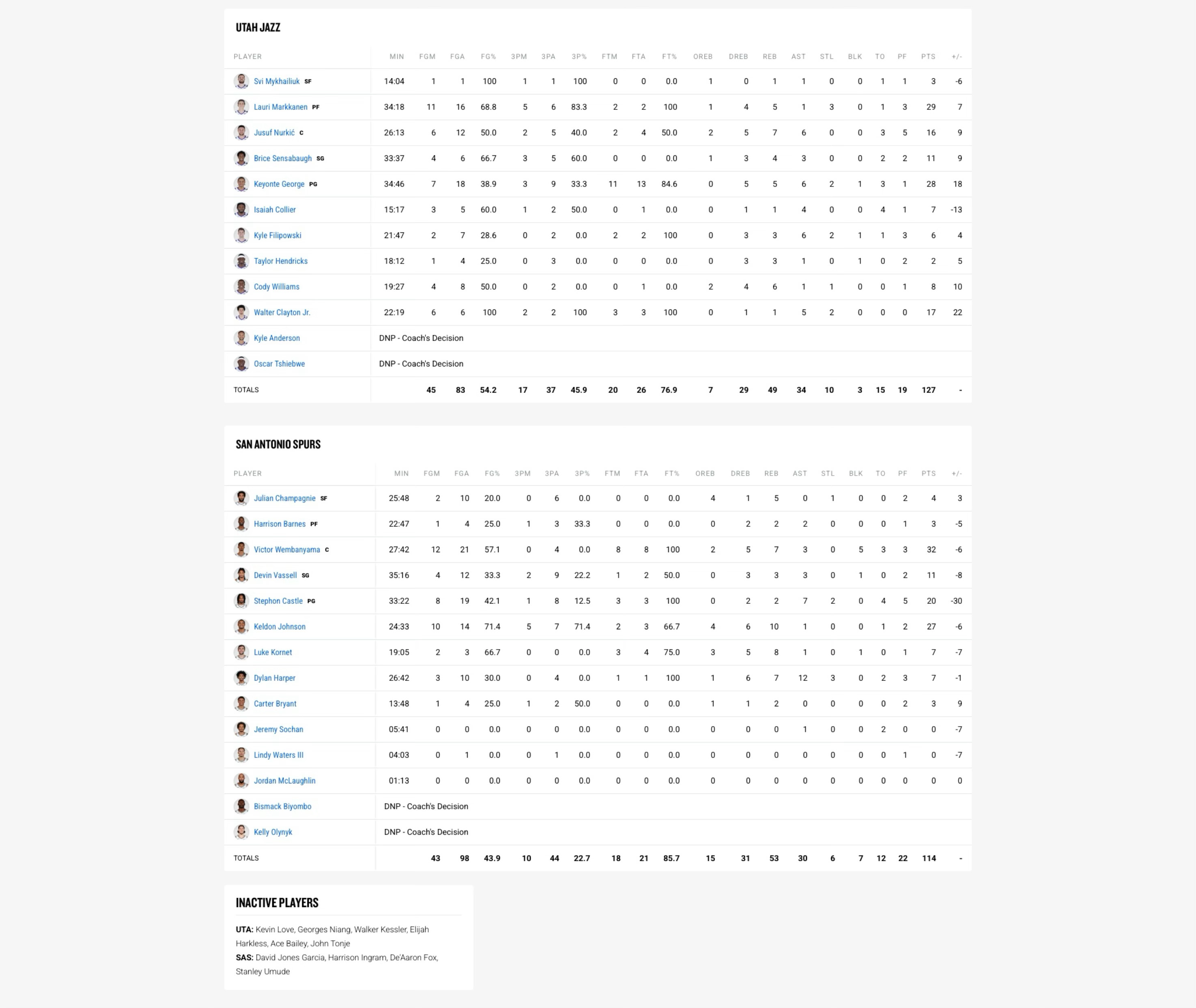 全场比赛结束!马刺114-127不敌爵士,结束8连胜马刺(23-8):文班亚马32分7板3助5帽、凯尔登27分10板1助、卡斯尔20分2板7助2断、瓦塞尔11分3板3助、科内特7分8板1助、哈珀7分7板12助3断、尚帕尼4分5板、巴恩斯3分2板2助、布莱恩特3分2板、索汉1助爵士(12-19):马尔卡宁29分5板1助3断、乔治28分5板6助2断、克莱顿17分1板5助2断、努尔基奇16分7板6助、森萨博11分4板3助、威廉姆斯8分6板1助、科利尔7分1板4助、菲利波夫斯基6分3板6助2断、米哈伊柳克3分1板1助、亨德里克斯2分3板1助马刺下一场将在12月30日主场迎战骑士超话创作官 |篮球年末狂欢季 |爵士vs马刺