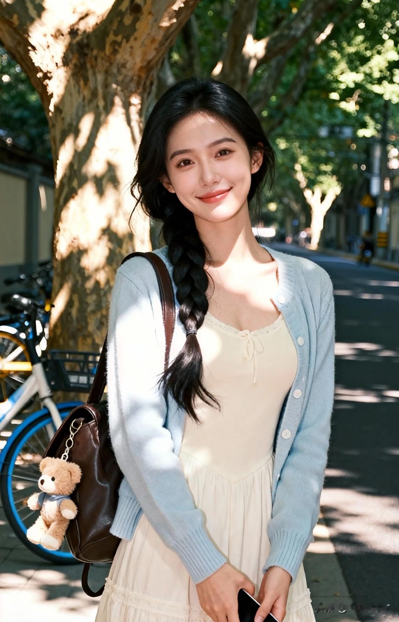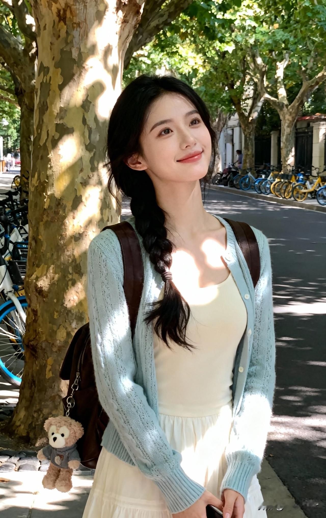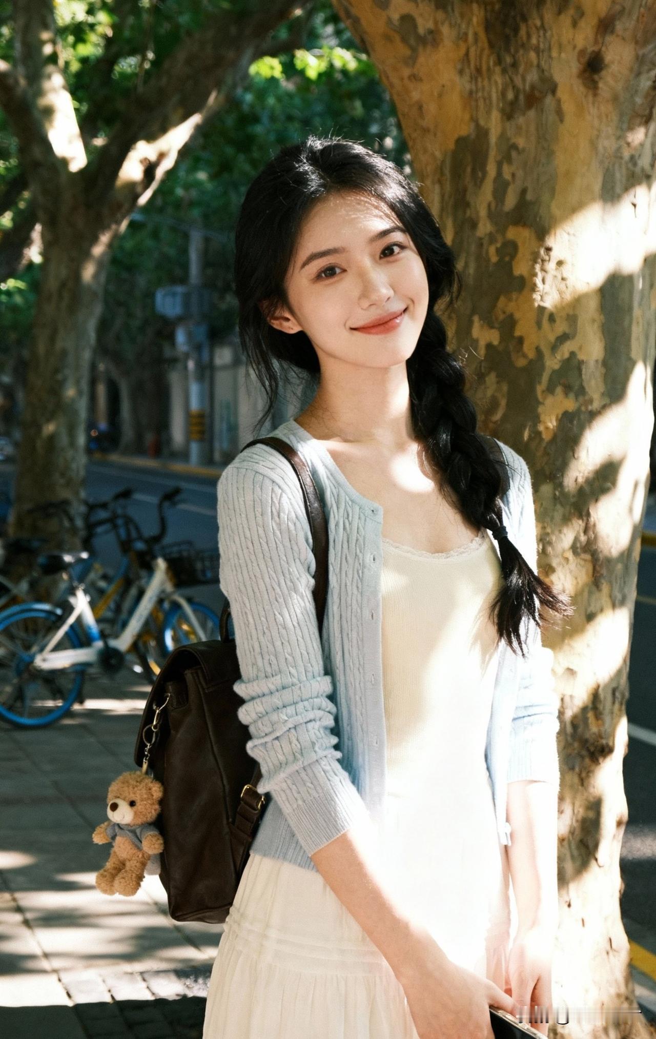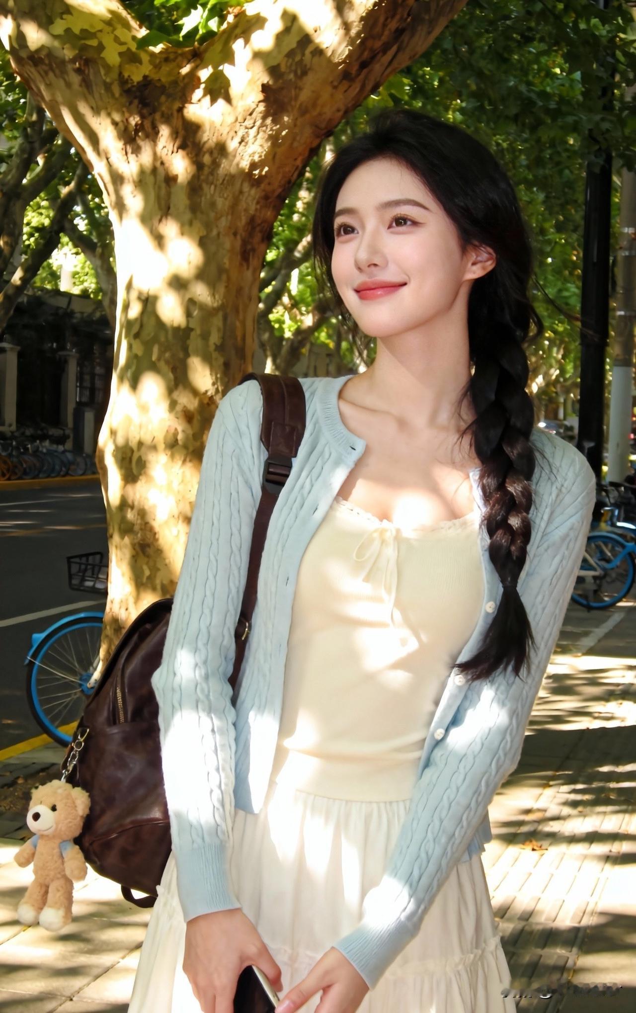 秋日暖阳下,温柔少女与毛绒外套的完美搭配