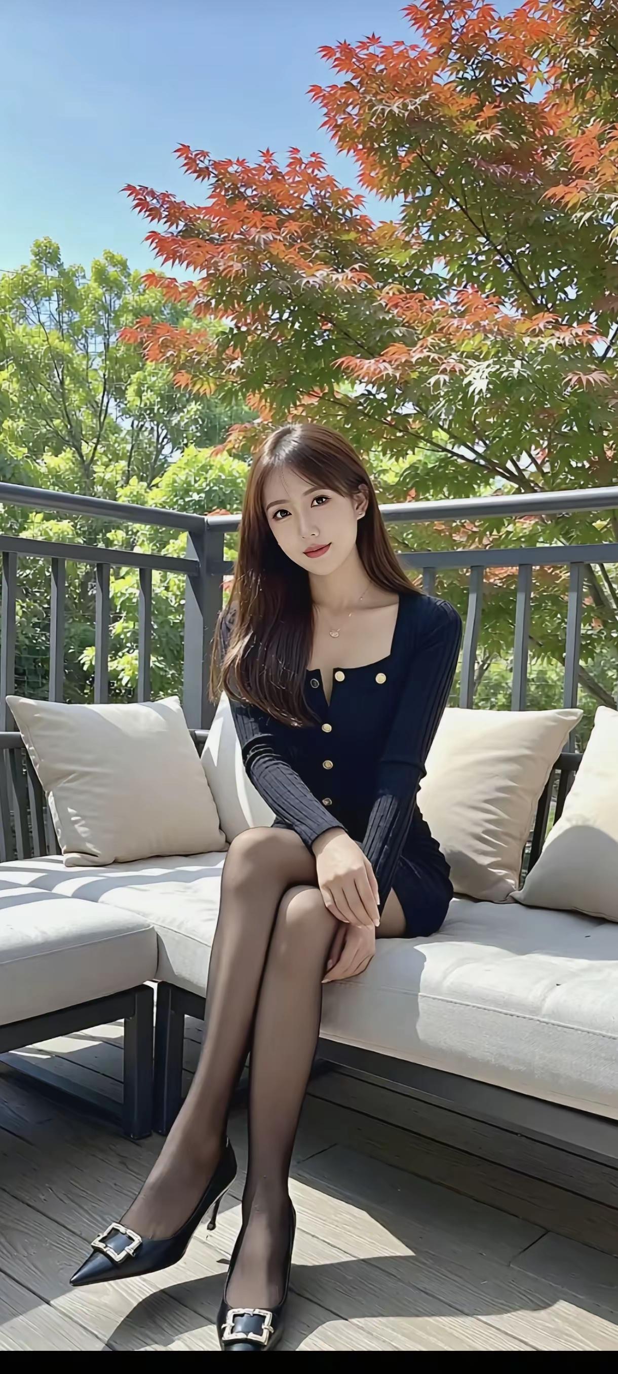 秋日暖阳下,优雅黑裙与红叶相映成趣,尽显迷人风情。