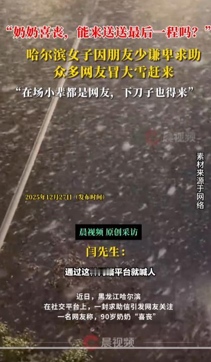 “我奶奶走得很体面,她被很多人爱过。”奶奶去世后,孙女想找人送送,这事搁谁身上都挺难的。“但凡她有一点招,也不会半夜发帖。我怕的不是雪,是孤独。”,“如果没人来,她得多难堪?”这是中国人骨子里的团结。 黑龙江哈尔滨五常市,一位90岁奶奶因高龄离世,按当地习俗被视为“喜丧”。其孙女因亲友稀少、皆不在本地,担心奶奶走得孤单,于社交平台发布一封谦卑求助帖:“能不能,来几个人送送她?” “这世上最重的承诺,是踩着雪、顶着风,说一句‘我来’。”没想到真有人顶着零下二十度的暴雪赴约,睫毛挂霜的浙江小伙追着灵车跑十几公里,本地人闫哥凌晨铲雪开路去殡仪馆。 到场清一色年轻网友,谁都不认识老太太,可鞠躬绕棺时默契得像自家人。 这场风雪中的奔赴,重新定义了“人情”——它不靠血缘维系,却因一句“需要”而真实发生; ”现在人总说网络疏离,可偏偏是这群隔着屏幕的陌生人,把最难兑现的承诺摔在冰天雪地里听响儿。现实版“吐口唾沫就是钉”,比任何热播剧都催泪。