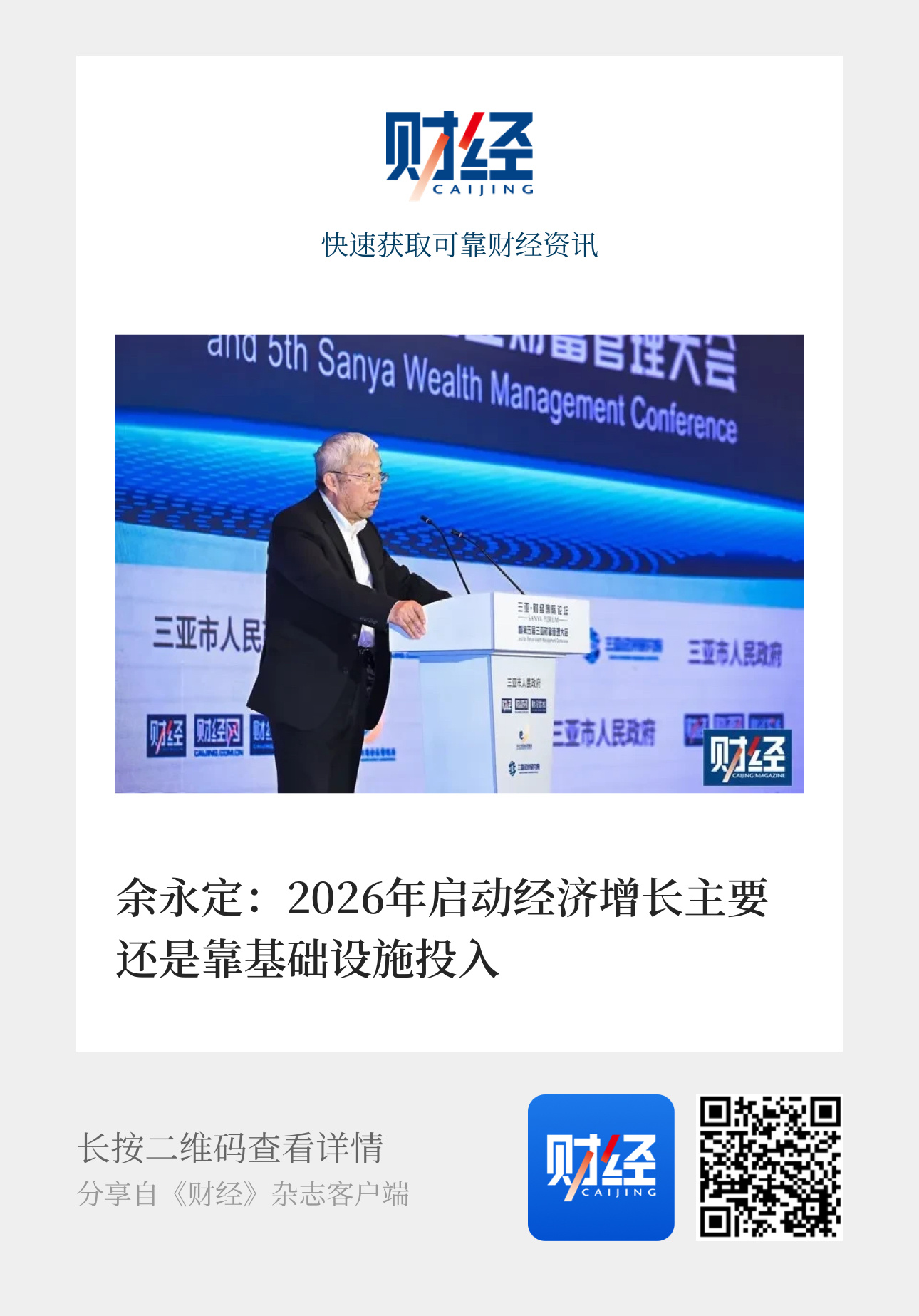 【余永定:2026年启动经济增长主要还是靠基础设施投入】 (财经网 2025年12月28日 09:45 ) 由三亚市人民政府主办,《财经》杂志、财经网、《财经智库》、三亚中央商务区管理局、三亚经济研究院承办的“三亚·财经国际论坛暨第五届三亚财富管理大会”12月27日在海南三亚举行,主题为“海南自贸港未来定位及三亚新机遇”。 12月27日,中国社会科学院学部委员余永定在论坛上表示,在所有普遍接受的增长理论当中,消费都不是经济驱动力,除非消费如健身运动直接提高劳动投资质量。在长期,消费投资不存在非此即彼的矛盾,但是有一点可以肯定,认为消费是长期经济增长的推动力是完全错误的。 余永定表示,作为目前宏观经济调控政策的一部分,刺激消费是非常必要的,但问题是我们必须清楚消费是收入、收入预期和财富的函数,或“永久性收入“的函数。如果收入、收入预期和财富没有重大改善,消费增加的空间有限。作为刺激有效消费的政策,学者们普遍主张发消费券(或者发钱)、降低个人所得税税率、改革社保制度,这三类建议的共同点都是增加居民人均可支配收入,都有道理,也取得了一定成效。但如果社会居民认为收入增长是临时性、过渡性的,并且并未改变他们的“永久性收入”预期,那么这些政策效果都将是有限的。 他进一步指出,历史经验告诉我们,提高基础设施投资增速是解决有效需求不足的有效政策工具,加大基础设施的投资力度,可以取得一举两得的结果。在长期促进经济稳定增长,在短期弥补有效需求不足。增加基础设施投资可以转化为增加居民收入,居民收入的增加导致消费收入增长,并通过乘数效应使收入进一步增加,形成收入增加—消费增加—收入进一步增加的良性循环。由此他认为,2026年启动经济增长主要还是要靠明显增加基础设施投投资。 * 点击链接,收听收看余永定发言实录(全文约4930字):网页链接