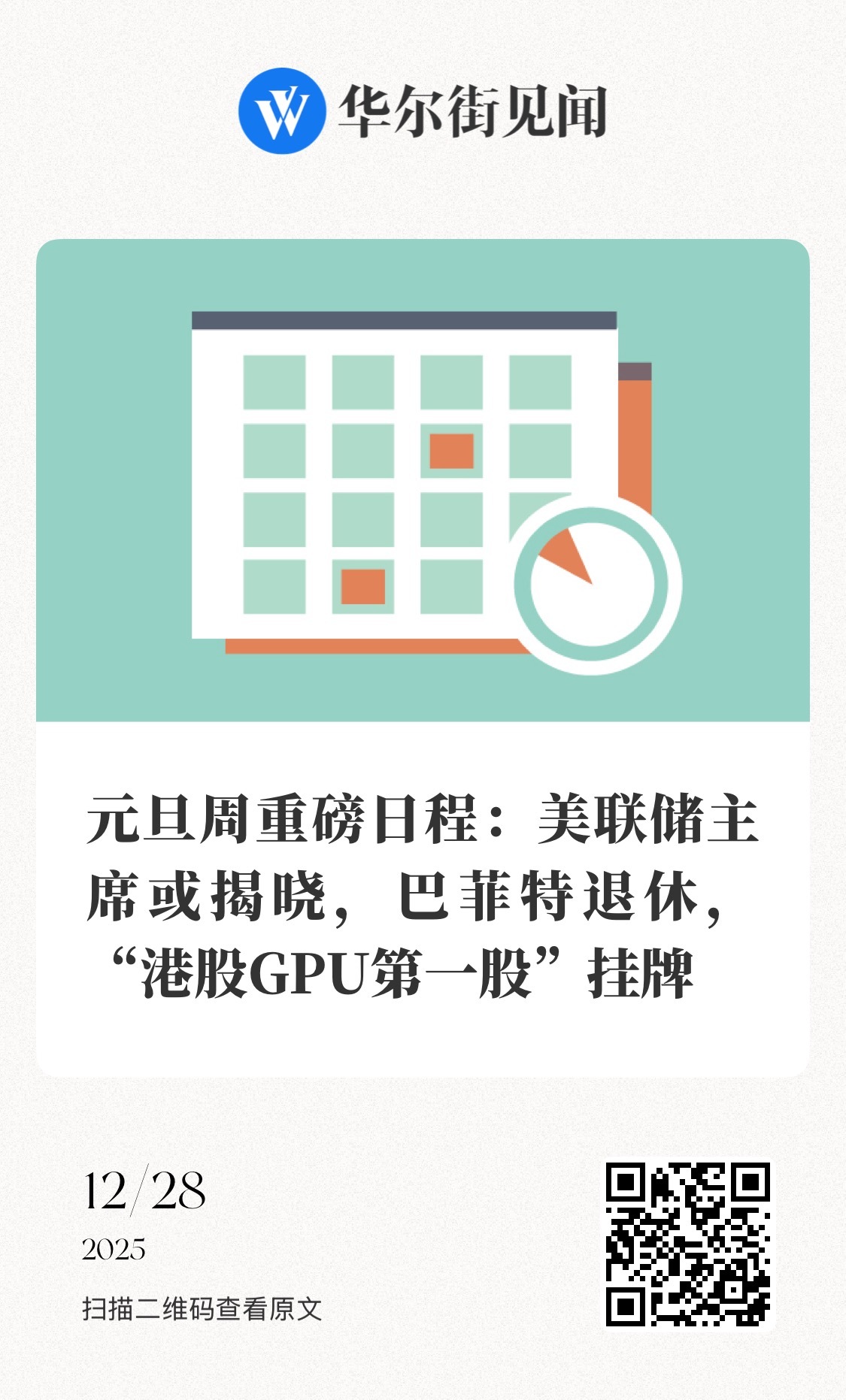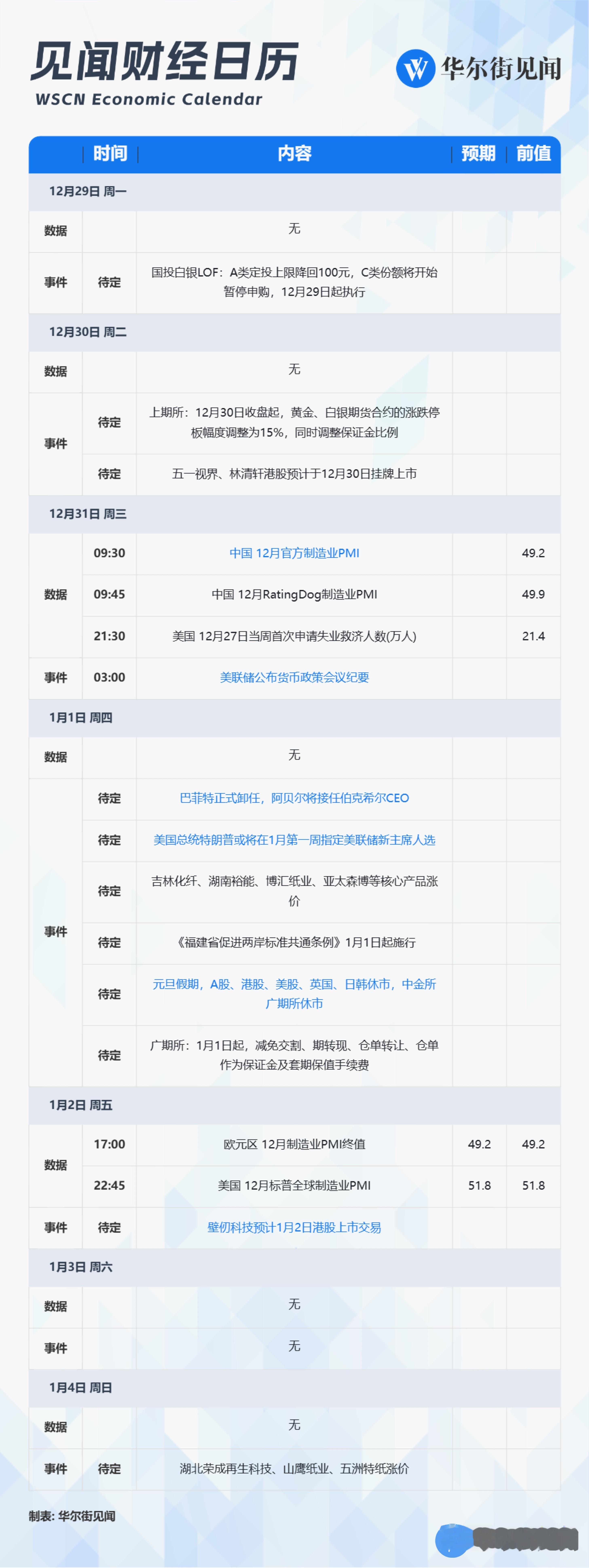 【元旦周重磅日程:美联储主席或揭晓,巴菲特退休,“港股GPU第一股”挂牌】 (华尔街见闻 2025年12月28日) 12月29日 - 01月04日当周重磅财经事件一览,以下均为北京时间: 下周重点关注:元旦假期沪深、美股及商品交易所休市情况,中美PMI数据。美联储货币政策纪要将公布,美联储主席人选或将揭晓,巴菲特正式卸任伯克希尔CEO。“港股GPU第一股”壁仞科技、“Physical AI第一股”五一视界挂牌在即。 此外,国投白银LOF在二级市场价格剧烈波动后再度收紧申购限制。《福建省促进两岸标准共通条例》1月1日起施行。产业端“涨价潮”凶猛,多家造纸企业纷纷提价。 [ 经济指标 ] ▪️ 中国12月官方制造业PMI 12月31日,中国将发布12月官方制造业数据。在11月制造业PMI录得49.2、处收缩区间的基础上,市场关注年末景气度能否进一步改善。中信证券等机构预期,在政策支持下,制造业PMI或延续小幅回升态势。主要看点在于新订单指数反映的内需恢复情况、不同规模企业表现的差异等。 ▪️ 美国12月标普全球制造业PMI 1月2日周五,美国12月标普全球制造业PMI数据将公布。此外,12月29日周一公布美国11月成屋签约销售指数数据,31日周三公布美国12月27日当周首次申请失业救济人数。 ▪️ 美联储公布货币政策会议纪要 12月30日周二将公布的美联储12月政策会议纪要。市场预计,这份纪要将继续揭示联储官员在短期政策路径上的“强烈分歧”。10月纪要显示“大多数”官员认为可能进一步降息,而“数位”官员则认为12月未必适合再次降息25个基点。 [ 财经事件 ] ▪️ 美国总统特朗普或将在1月第一周指定美联储新主席人选 据报道,美国总统特朗普将在1月第一周指定美联储新主席人选。鲍威尔继任者热门人选包括,白宫经济顾问哈塞特以及前美联储理事沃什,以及美联储理事沃勒和鲍曼。 鲍威尔的四年主席任期将于2026年5月届满。(此事件为不确定性事件,推迟公布的可能性较大。) ▪️ 巴菲特正式卸任伯克希尔CEO,由阿贝尔接任 在今年5月伯克希尔·哈撒韦股东大会上,巴菲特宣布,他将在2025年底卸任该公司CEO,副董事长格雷格·阿贝尔(Greg Abel)从2026年1月1日起接任这一职务,同时,巴菲特将继续担任董事会主席。 ▪️ 元旦假期,A股、港股、美股、英国、日韩休市,中金所广期所休市 1月1日至1月4日为元旦假期。 沪、深交易所发布通知,根据中国证监会有关通知要求,现将2026年部分节假日休市安排通知如下。其中元旦:1月1日(星期四)至1月3日(星期六)休市,1月5日(星期一)起照常开市。另外,1月4日(星期日)为周末休市。 中金所、广期所公布2026年部分节假日休市安排:元旦:1月1日(星期四)至1月3日(星期六)休市,1月5日(星期一)起照常开市。1月4日(星期日)为周末休市。 此外,港股、美股、英国、韩股、日股、新加坡、马来西亚也在1月1日休市。日本股市1月2日也休市。 ▪️ 壁仞科技预计1月2日港股上市交易 “港股GPU第一股”壁仞科技已确定其香港IPO发行价区间为每股17.00至19.60港元,计划于明年1月2日挂牌交易,股票代码“6082”。公司手握总价值约8.22亿元的未完成约束力订单,IPO募资将主要用于下一代芯片的研发和商业化。 ▪️ 五一视界、林清轩港股预计于12月30日挂牌上市 “Physical AI第一股”五一视界(51WORLD)于12月18日启动招股。公司全球发售2397.5万股,每股定价30.5港元,若全额行使超额配股权,最高可募资约8.41亿港元,并预计于12月30日挂牌上市。 林清轩拟以每股77.77港元的价格发行H股,预计将于12月30日挂牌上市。 ▪️ 国投白银LOF:A类定投上限降回100元,C类份额将开始暂停申购,12月29日起执行 国投瑞银白银期货证券投资基金(LOF)在二级市场价格剧烈波动后再度收紧申购限制,宣布从12月29日起,将A类基金份额的定期定额投资金额上限重新下调至100元,此前这一额度曾被放宽至500元,以引导套利资金平抑溢价。 该基金短短两个月曾多次调整投资额度,10月20日从6000元调到降到100,12月19日又从100升到500,最新公告又降回100。 国投瑞银白银期货证券投资基金(LOF)发布C 类基金份额暂停申购(含定期定额投资)业务的公告。为保护基金份额持有人利益,国投瑞银白银期货证券投资基金(LOF)C类基金份额将从2025年12月29日开始暂停申购。本基金取消或调整2025年12月29日起的暂停C类基金份额申购(含定期定额投资)业务的具体时间将另行公告。 ▪️ 上期所调整黄金、白银涨跌停板幅度和保证金标准 上期所:自2025年12月30日(星期二)收盘结算时起,黄金、白银期货合约的涨跌停板幅度调整为15%,套保持仓交易保证金比例调整为16%,一般持仓交易保证金比例调整为17%;白银AG2602合约的涨跌停板幅度仍为15%,套保持仓交易保证金比例仍为16%,一般持仓交易保证金比例仍为17%。 广期所:1月1日起,减免交割、期转现、仓单转让、仓单作为保证金及套期保值手续费 广期所:经研究决定,自2026年1月1日至2026年12月31日,我所实施如下手续费减免措施。 一、免收全部期货品种以下手续费:交割手续费;标准仓单期转现手续费;标准仓单转让货款收付手续费;标准仓单作为保证金手续费。 二、全部期货、期权品种套期保值交易手续费减半优惠,按照交易手续费标准直接收取。 三、交易所认定的高频交易者除外。 ▪️ 造纸等行业涨价潮来袭!吉林化纤、湖南裕能、博汇纸业、亚太森博、湖北荣成再生科技、山鹰纸业、五