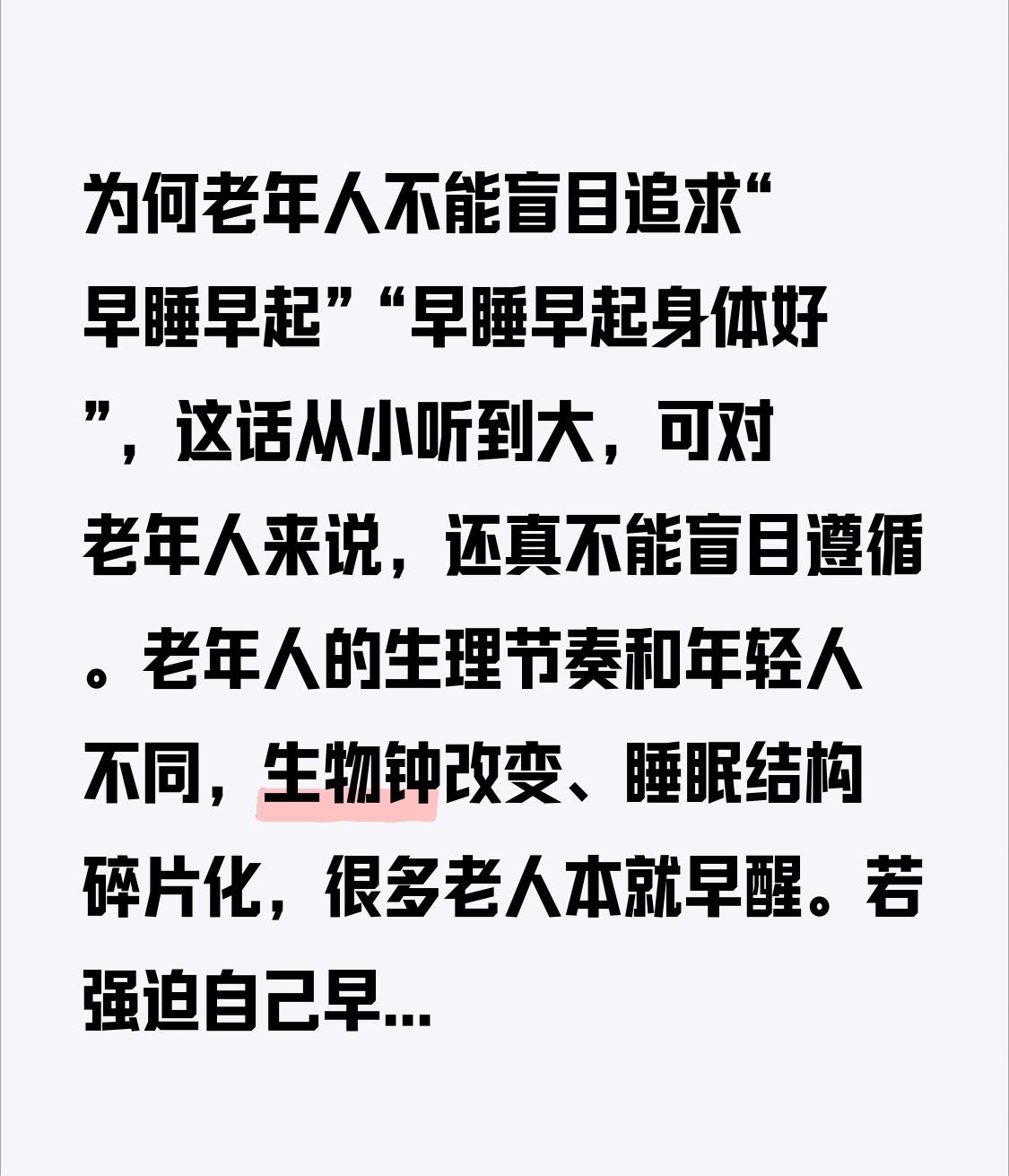 为何老年人不能盲目追求“早睡早起” “早睡早起身体好”,这话从小听到大,可对老年人来说,还真不能盲目遵循。 老年人的生理节奏和年轻人不同,生物钟改变、睡眠结构碎片化,很多老人本就早醒。若强迫自己早睡早起,会打乱原有作息,降低睡眠质量。而且他们睡眠需求没减少,只是表现不同,有人晚上睡不深,有人需午休补充。 另外,疾病和药物也会影响睡眠,像关节疼、呼吸疾病等。强行调整作息,会给身体带来额外压力。其实,生活舒适和心理状态才是健康关键,尊重老人自己的生活习惯,让他们自在才是最好。