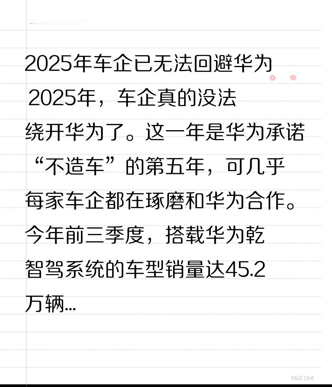 2025年车企已无法回避华为 2025年,车企真的没法绕开华为了。这一年是华为承诺“不造车”的第五年,可几乎每家车企都在琢磨和华为合作。今年前三季度,搭载华为乾崑智驾系统的车型销量达45.2万辆,市场占有率约27.8%,HI模式的合作伙伴也越来越多。 华为设计了一套从浅到深的合作“阶梯”,传统零部件供应模式是基础,华为提供硬件,参与感和话语权有限;HI模式则更深一步。就拿深蓝L07来说,最低13万出头,性价比超高。它有纯电和增程可选,增程版综合续航超1300公里。还搭载华为乾崑智驾,高速驾驶省心。华为在汽车领域影响力越来越大,车企不合作怕是不行咯。