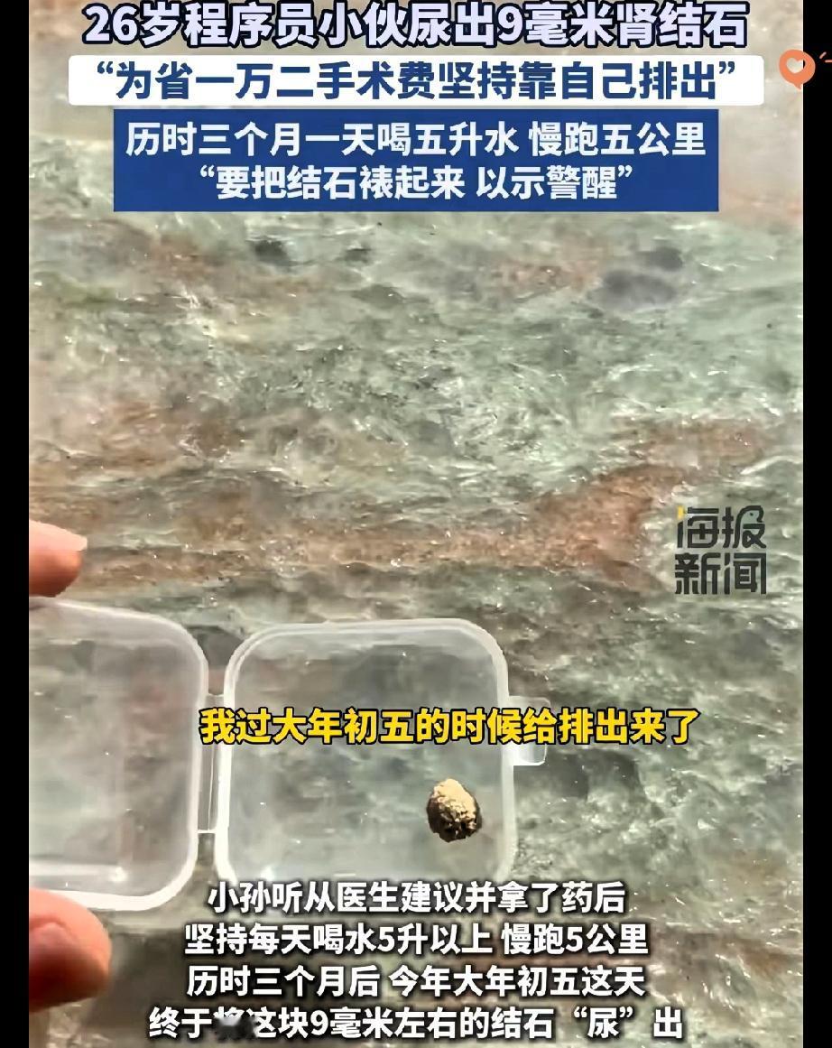 见过狠人,没见过这么狠的! 山东26岁小伙为省一万多手术费,硬是靠每天5升水+5公里慢跑,三个月把9毫米肾结石尿了出来! 要知道8毫米以上结石自然排出概率才20%,医生都直呼少见。 小伙顶着腰腹剧痛,办公桌上摆着大水桶小口猛灌,跑厕所跑到腿软;刮风下雨雷打不动慢跑,靠身体震动帮结石下移。 想放弃时,一想到省下的手术费就咬牙坚持,这股狠劲真不是一般人能比的。 这事儿看着是省钱,实则是年轻人在生活压力下的智慧博弈,既靠毅力又拼身体底子。 但必须提醒,这是个例不是模板,结石位置、体质不同,盲目效仿可能伤身。 你身边有过靠超强毅力省钱又解决麻烦的狠人吗?遇到这种事你会选手术还是保守排石?