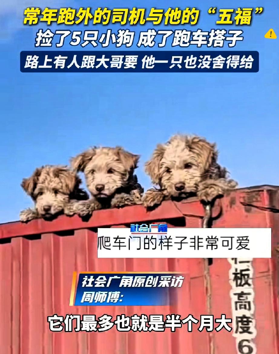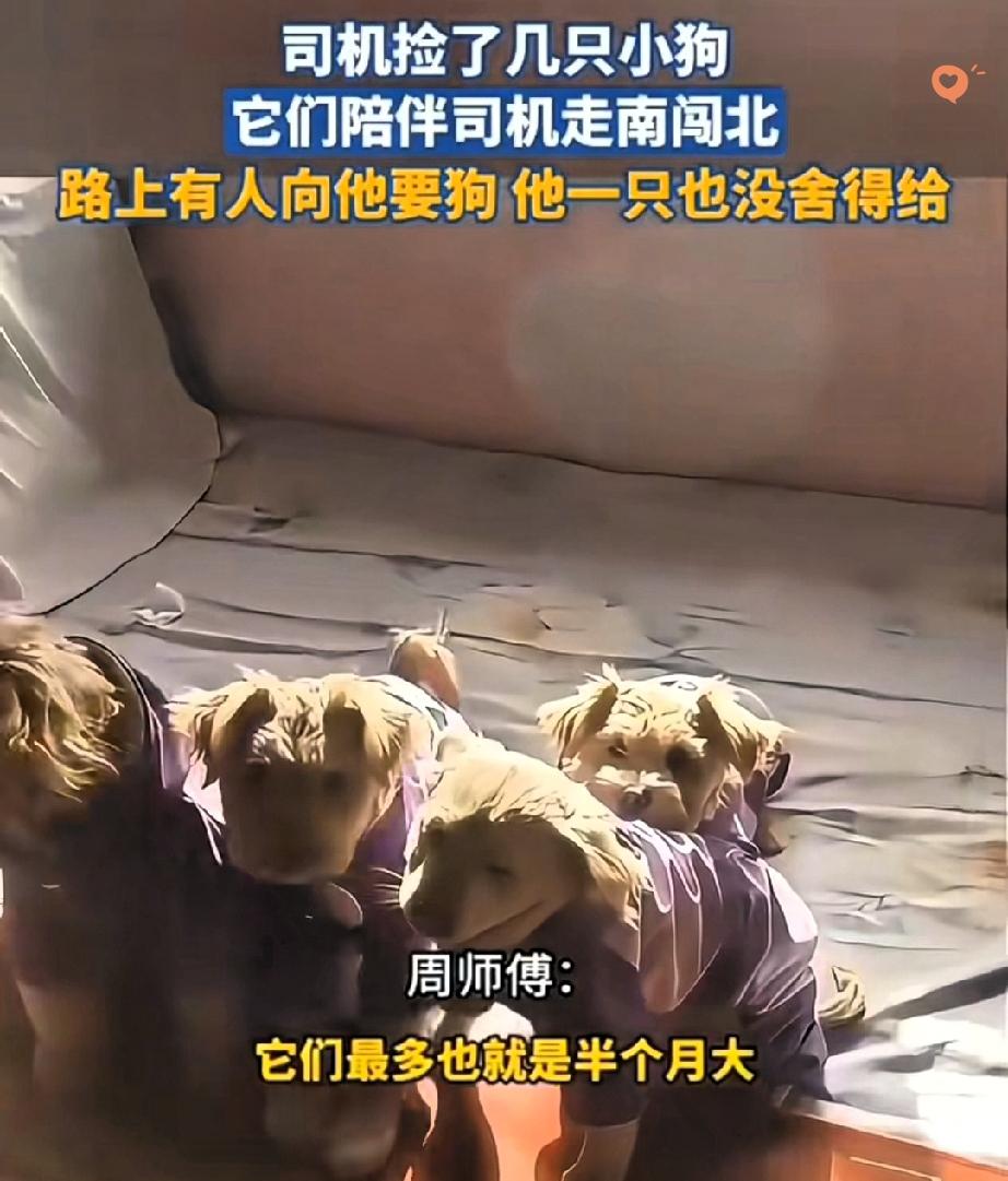 谁说善良不能双向奔赴? 山东烟台货车司机路边捡到半大的流浪小狗,怕它们被车碾压,干脆抱上车当“家人”养,这一善举,竟成了彼此最暖的救赎。 刚捡到的小狗连张嘴吃饭都不会,司机就耐心掰开嘴喂,跑长途时在货车里给它们搭窝,5个月里带着小家伙们走南闯北。 有人出高价想买,他一口回绝:“亲手喂大的,舍不得”。 其实这哪是简单的收养,分明是两个孤独灵魂的相互陪伴。 司机跑长途的寂寞,被小狗的打闹填满;小狗颠沛的命运,被司机的责任接住。 真正的爱从不是交易,而是你给我一个家,我陪你过风雨。 你有没有过和小动物双向治愈的经历?如果遇到流浪毛孩子,你会选择伸出援手吗?