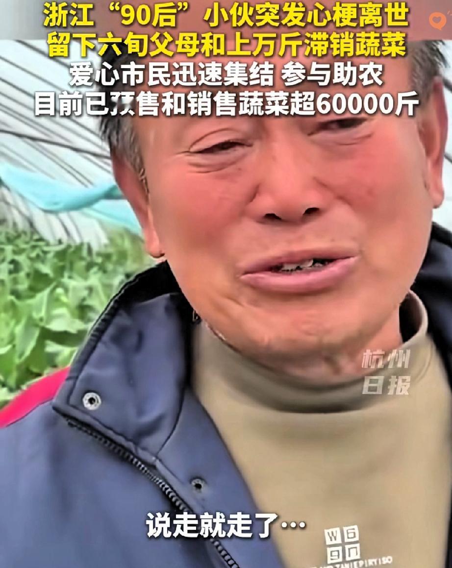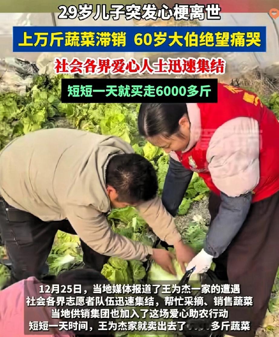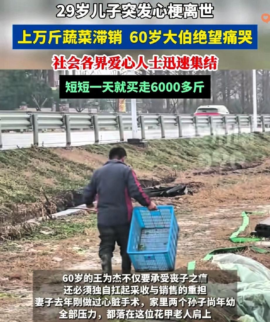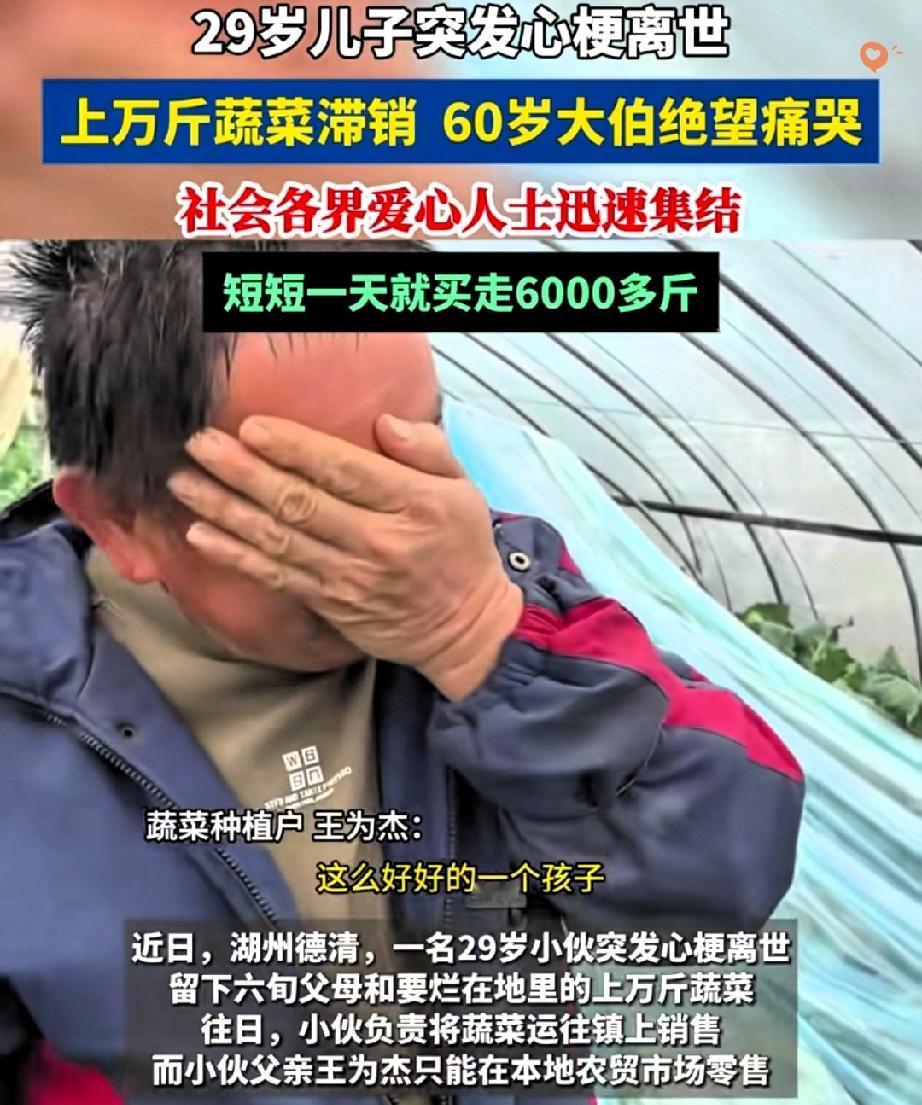 29岁的顶梁柱突然倒下,60岁大伯要扛着丧子之痛,还要眼睁睁看着40亩地里的上万斤蔬菜烂掉? 浙江德清这场突如其来的悲剧,本以为会压垮这个风雨飘摇的家,可人性的温暖总能在寒冬里撕开一道光。 大伯的儿子突发心梗离世,妻子刚做完心脏手术,两个孙子还小,以前靠儿子每天卖三四百公斤蔬菜过日子,现在只能眼睁睁急哭。 但善意从不会缺席,媒体报道后,线上订单挤爆通道,志愿者钻进菜地帮忙采收,企业主动兜底采购,连陌生人都带着米油棉被赶来。 更难得的是大伯没有辜负这份善意,挑掉所有次菜,坚决不让一颗不好的菜流出。 短短一天,6万斤蔬菜有了着落,这哪里是买卖,分明是陌生人搭起的救命桥。 原来善良从不是孤军奋战,而是你伸手我拉一把的默契。 如果你遇到这样的情况,会愿意加入这场爱心接力吗?