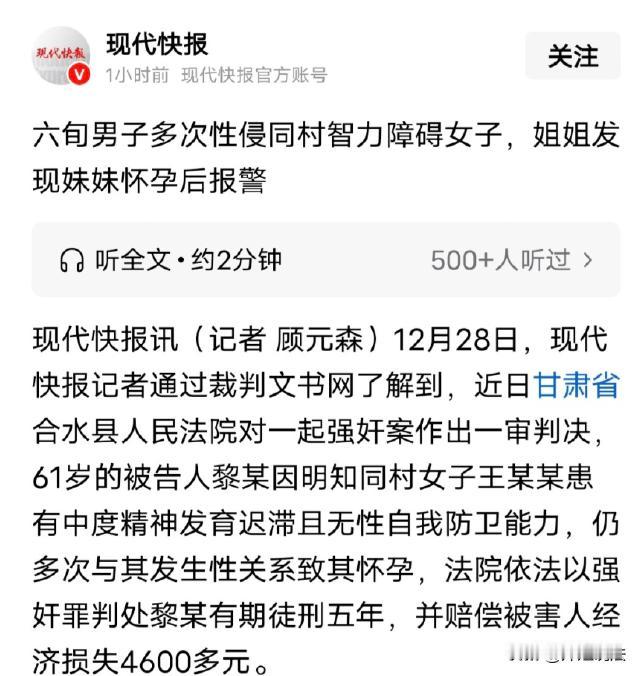 甘肃合水,61岁的黎某与34岁的智力异于常人的女子王某某搭顺风车认识,黎某利用王某某无法认知反抗的弱点,4个月内6次在家中与其发生了关系,致其怀孕。王某某的姐姐发现异常后报了警,并带她做了流产,黎某最终受到法律严惩。 (本信息来源于:现代快报) 2024年七八月,61岁的黎某和34岁女子王某某搭顺风车结识。 当时在顺风车上,黎某和王某某聊了起来。这聊天过程中,黎某那双不老实的眼睛就察觉到王某某智力似乎有些问题。 一般人遇到这种情况,多少会有点同情心,可这黎某呢,心里却打起了坏主意。 2025年3月18日后,在接下来的4个月里,黎某仗着王某某无法认知反抗,6次在家中侵犯她。 王某某只能默默承受着这无尽的痛苦,她根本不知道发生了什么,也不知道该如何反抗,只能任由黎某肆意妄为。 黎某完全不顾王某某的智力状况,利用她的弱点实施侵犯,这简直就是丧心病狂,毫无人性可言。 时间一天天过去,王某某的身体出现了异常。 她怀孕了,肚子一天天大了起来。 可她自己根本不知道这是怎么回事,也不知道该怎么办。 还是王某某的姐姐细心,发现了妹妹的异常。 姐姐追问王某某,可王某某智力有问题,根本说不清楚。 姐姐心里着急,又心疼妹妹,便报了警,还带着妹妹去做了流产手术。 黎某还以为自己做得神不知鬼不觉,还在那里逍遥自在。 可法网恢恢,疏而不漏,民警很快就把他给抓住了,他的恶行终于被揭露在了阳光下。 黎某的行为,是否构成强奸罪呢? 黎某说王某某没有明确反抗,不能算强奸。 王某某智力异于常人,无法认知反抗,这并不影响黎某行为的定性。 根据《刑法》第二百三十六条规定,以暴力、胁迫或者其他手段强奸妇女的,处三年以上十年以下有期徒刑。 黎某利用王某某的智力缺陷,在4个月内6次侵犯她,这完全符合强奸罪的构成要件。 他的这种行为,就是典型的违背妇女意志,强行与妇女发生性关系,必须受到法律的严惩。 他这就是垂死挣扎,王某某的智力状况根本不影响他行为的恶劣性质,法律不会放过他的。 王某某因为黎某的侵犯,不仅身体受到了伤害,还做了流产手术,这期间的医疗费、护理费等都是实实在在的损失。 根据《民法典》第一千一百六十五条规定,行为人因过错侵害他人民事权益造成损害的,应当承担侵权责任。 黎某的侵权行为给王某某造成了损害,他必须承担赔偿责任。 法院判决他赔偿王某某4600多元,这是合理合法的。 最终,法院综合考虑了黎某认罪认罚等情节,判决他犯强奸罪,判处有期徒刑5年,赔偿王某某4600多元。 您对这件事有什么看法呢?是不是也觉得法律应该严惩这种欺负弱者的行为呢?