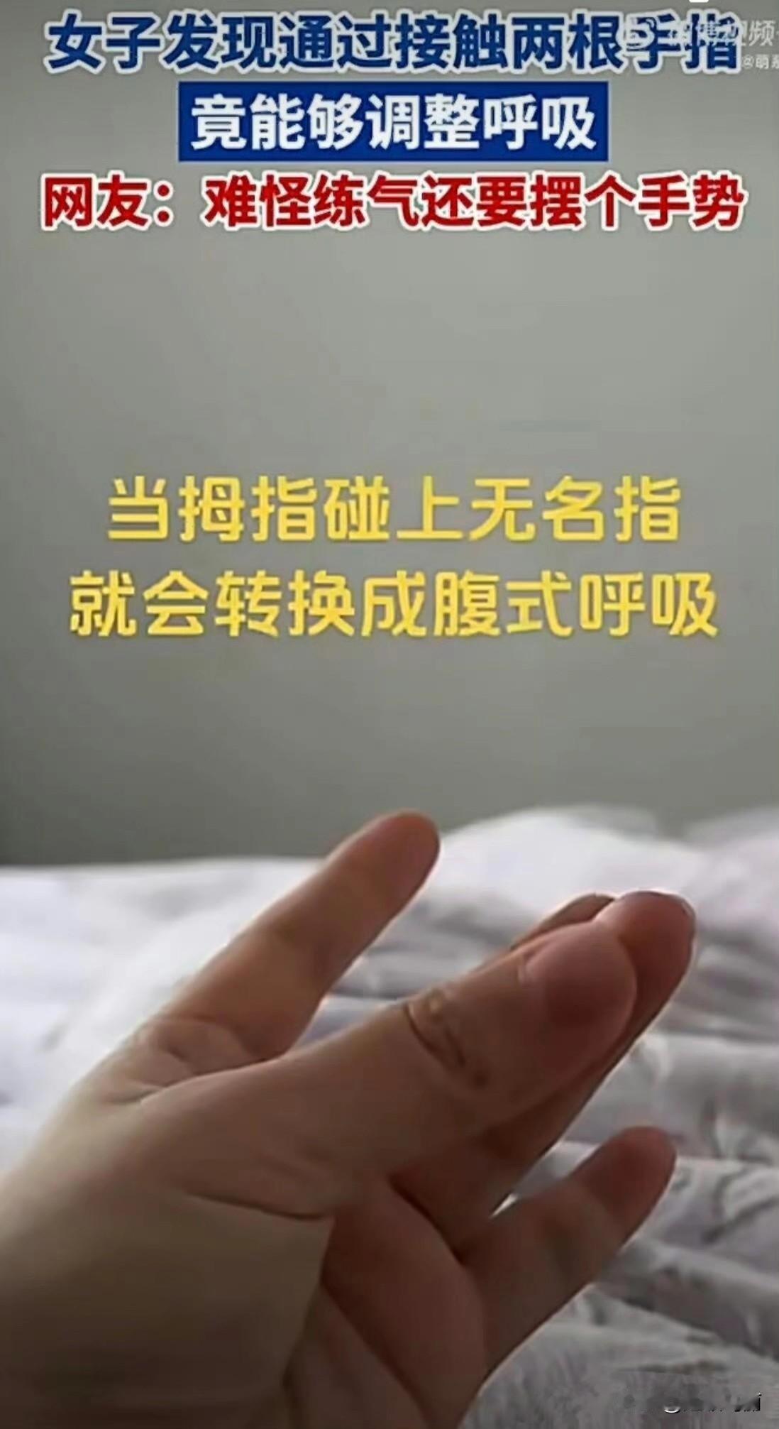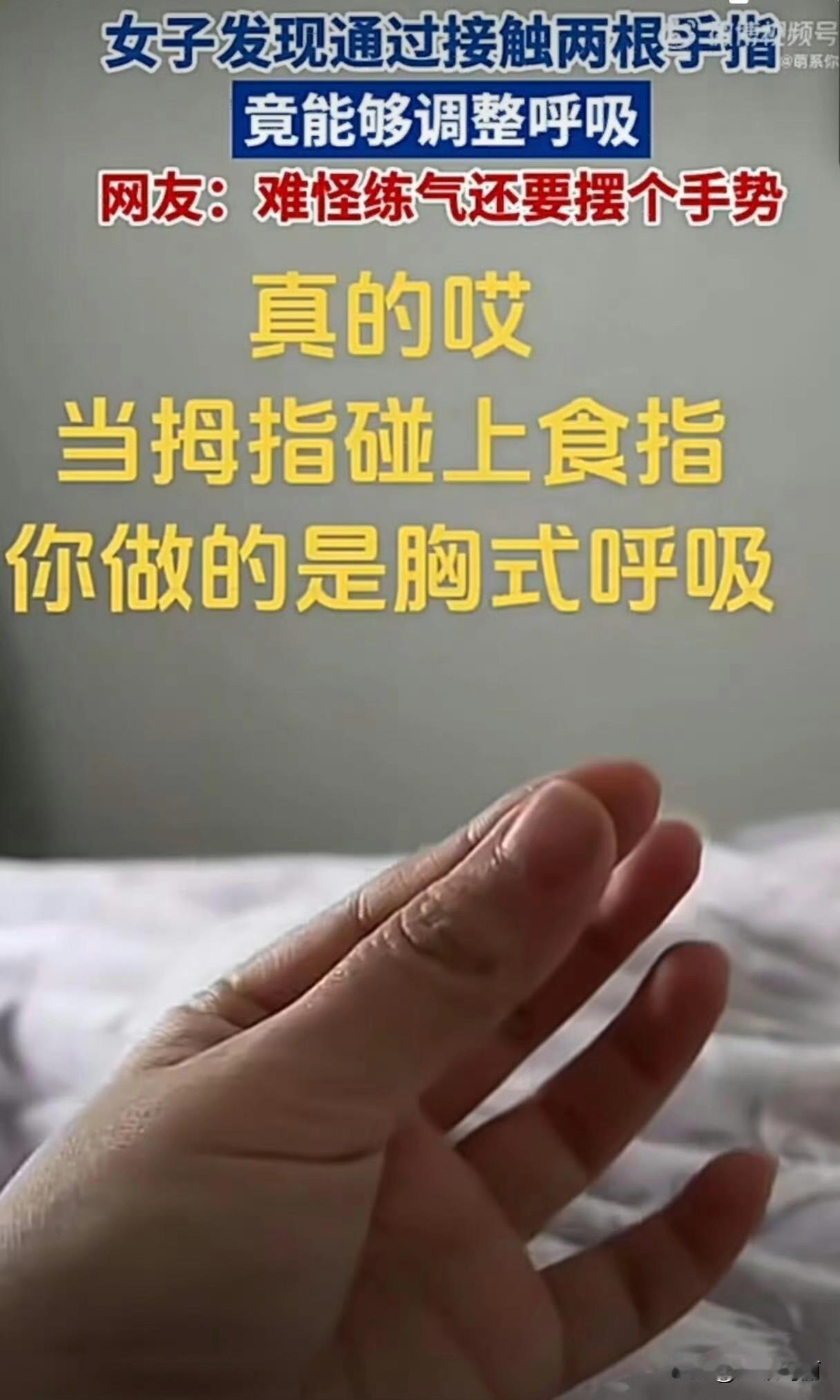 人体这么神奇的吗? 拇指捏着食指就是胸式呼吸 拇指捏着无名指就变成了腹式呼吸了