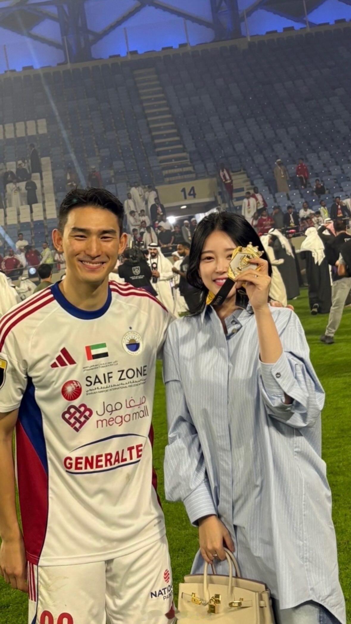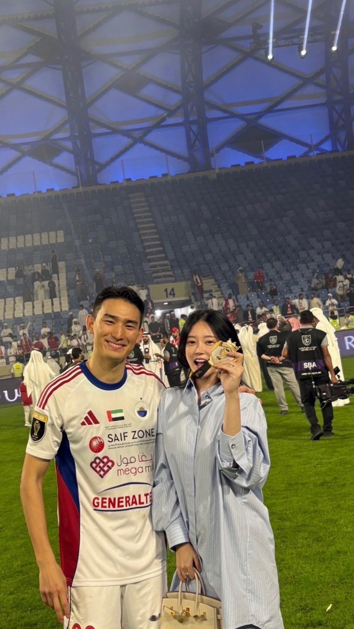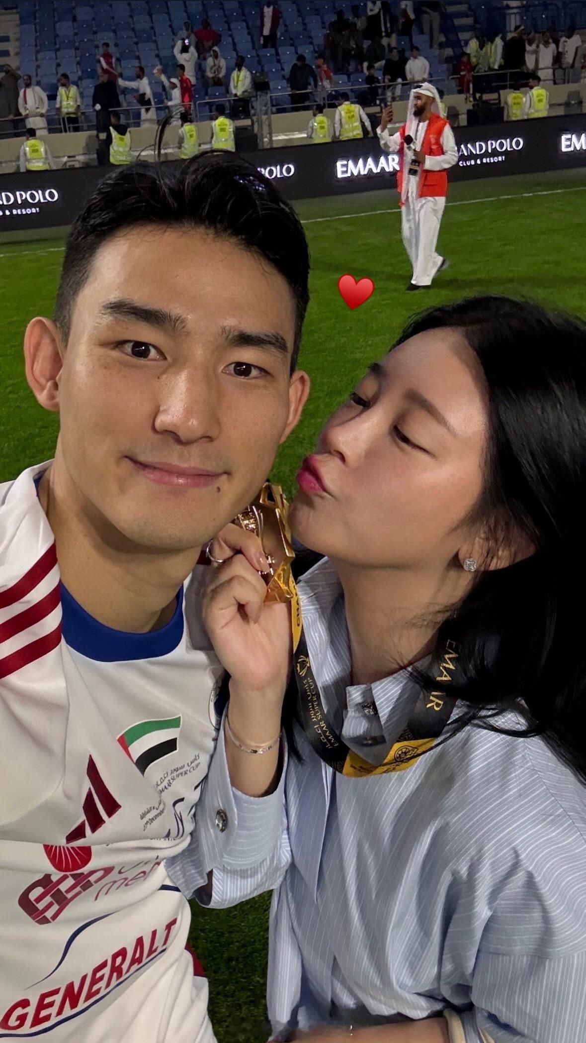 在阿联酋踢球的韩国国脚曹侑珉和妻子T-ara朴昭妍庆祝冠军。🏆 T-ara朴昭妍 t-ara