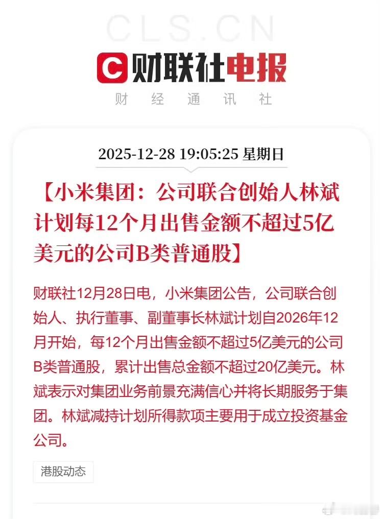 看到了减持的新闻,我身边有很多米东(包括我自己)肯定或多或少会有恐慌情绪,但其实真没必要首先斌总是明年 12 月才开始减持,而且是分 4-5 年减持,提前一年预告 恰恰是对股东负责的态度斌总都 57 岁了,想休息也是正常的,雷总不仅没有减持还在增持,大家就不用恐慌(从这点也能看出:雷总真是太稳了,这么多年都没减持,佩服)明年内存的价格还很不乐观,而小米大量数码产品(包括汽车)都要用到内存,所以明年也确实不会轻松,但这个影响是针对全行业的,大家都会涨价当然,如果大家还是担心的话,那斌总减持的我全接了(狗头)