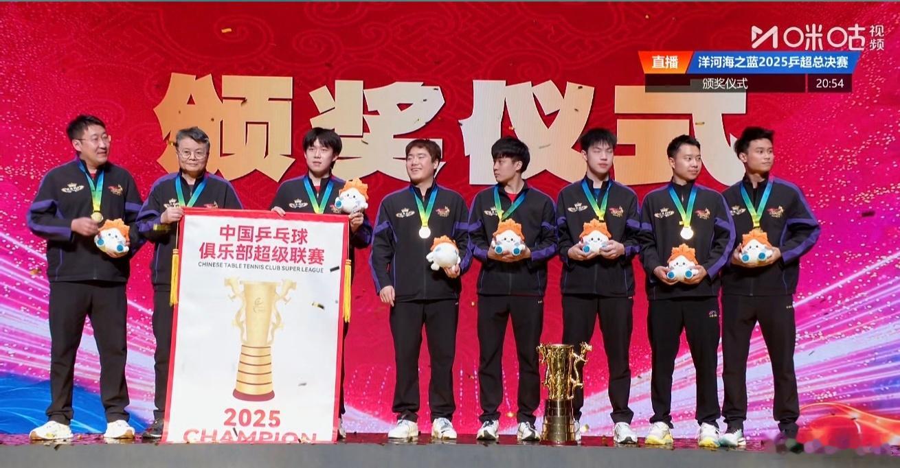 恭喜王楚钦,恭喜梁靖崑,恭喜林昀儒,恭喜山东魏桥。未来继续高歌猛进,再创辉煌!山东魏桥捧起男团冠军奖杯秦志戬为山东魏桥颁发冠军旗