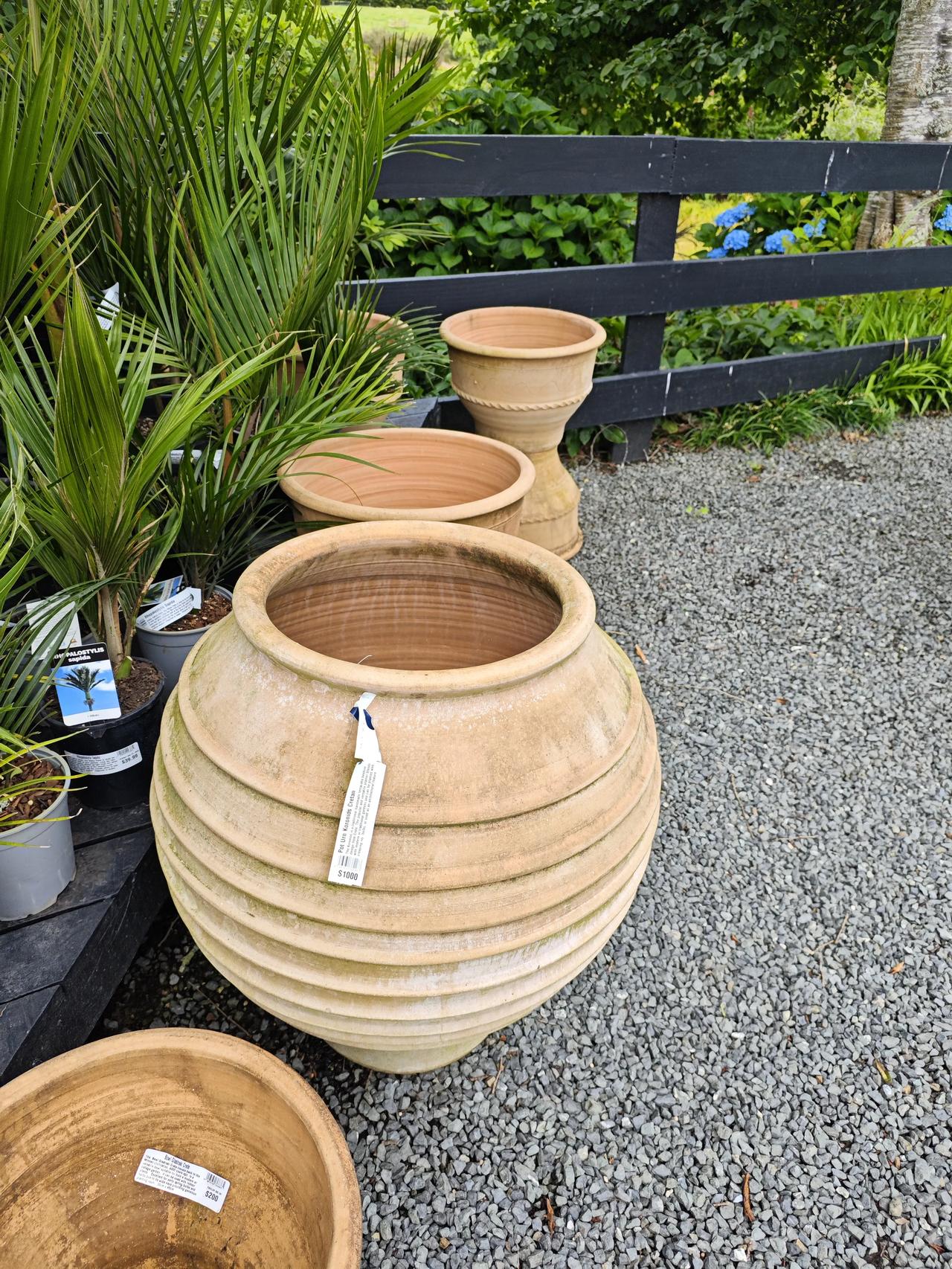 你能相信吗? 从陶波湖回来的路上,女儿说路过一处园艺场,进去看看能不能买盆花…… 园艺场就在高速路附近,就像很普通的一个农场,各种花卉,琳琅满目,她们转着寻找喜欢的花卉,我则被这里的陶制花盆给惊到了…… 图一这么个双耳陶罐,高度七八十公分,上口直径不到30公分,上大下小,标价是1600纽币,合人民币六七千啊…… 图二这个陶罐,比图一小一些,肚子大一点,标价1000纽币,人民币4000多…… 咱们不懂,就这么个土窑烧的陶罐,估计在国内就一二百吧,他们为什么卖得这么贵?[捂脸][捂脸][捂脸]