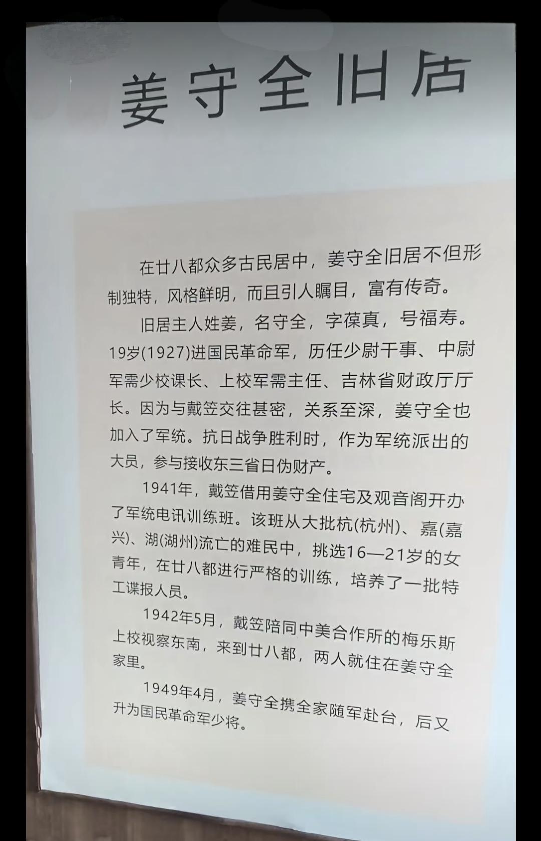 戴笠利用这幢老宅开办了一期女特工训练班,主要培养女电讯员。详情见图四姜守全旧居说明。