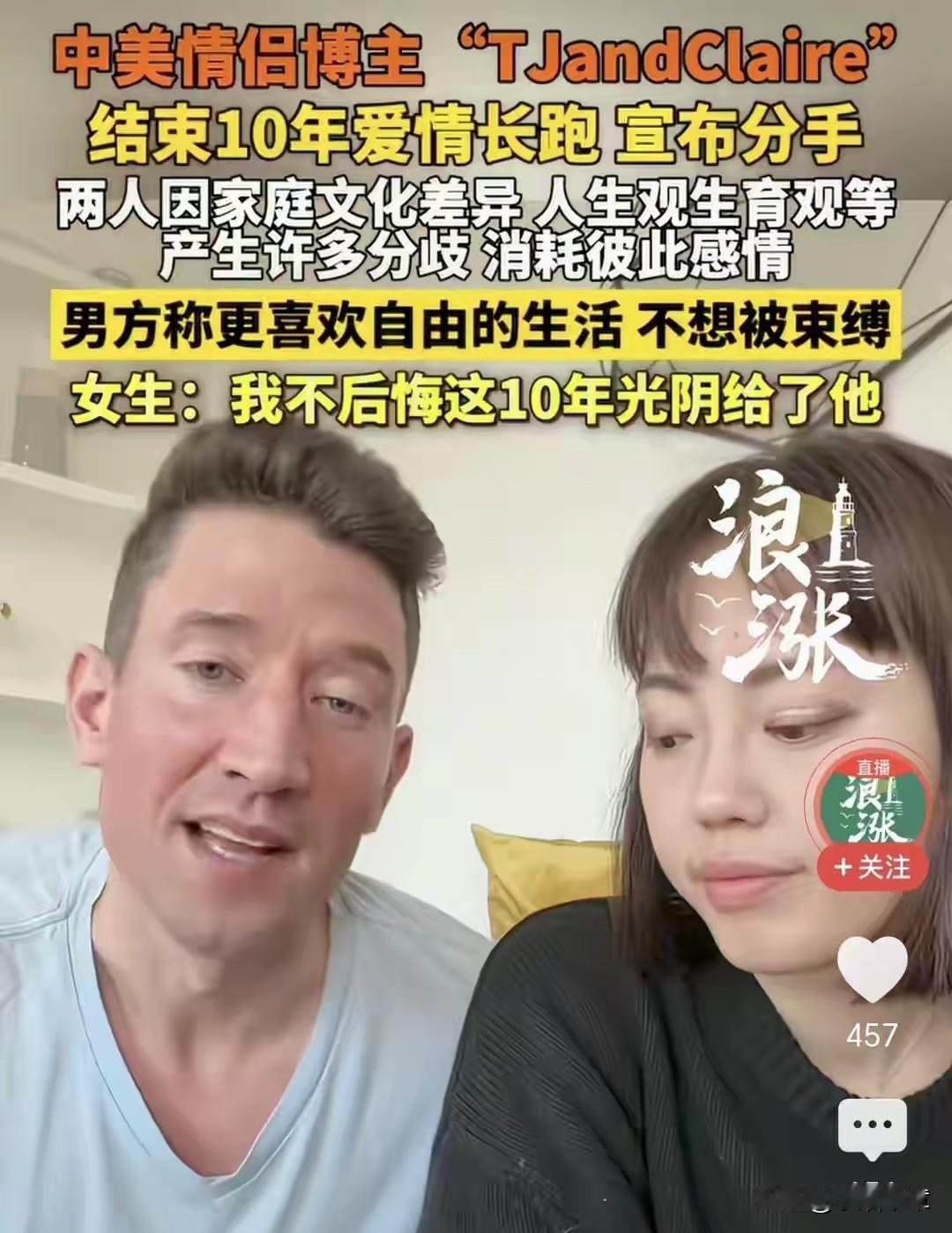 十年跨国恋落幕,爱与自由的距离 一对跨国夫妻离婚了,Claire和TJ的故事结束了,他们曾是恩爱的情侣,大家都觉得他们很配,可是现在分开了。 Claire是江西人,TJ是美国人,也有人说他是英国人,网名是老六,大家都叫他老六,挺有意思的,他们和平离婚了,好聚好散那种。Claire好像有点不舍,也觉得累了,TJ说他还爱着Claire,但是他更想要自由,两个人想法不一样了。他们谈了十年恋爱,Claire从二十岁到三十岁,人生zui好的十年,给了这段感情。 一开始他们很浪漫,Claire很活泼,特别自信,TJ很幽默,经常逗Claire开心,他们经常一起旅游,到处玩,特别开心,文化不一样,反而觉得新鲜。后来,Claire开始有点忧郁,好像不太开心,她说想要稳定,她想要一个家,可是TJ不想结婚,他想要自由,不想被婚姻绑住,这成了他们分开的理由。Claire想要让爸妈放心,想有个家,TJ觉得自由更重要。 结婚这件事,TJ一开始就没想过,只是想谈恋爱,Claire主动求婚的,她想要稳定,想有个保障。TJ不想要小孩,Claire想要小孩,受传统观念影响,觉得应该有孩子。生活方式也不一样,TJ喜欢自由自在,Claire想把事业搞好,想以后能照顾家里人,中国父母都希望女儿能稳定下来,而TJ觉得,自己不应该为父母养老负责,Claire接受不了,觉得应该孝顺父母,观念差太多了。 大家都在想,这到底是怎么一回事,为什么会这样,其实有很多原因,文化不一样,中国人外国人,想的东西不一样,对家庭的看法也不一样。价值观也有区别,对生活方式,对人生目标,他们有根本上的分歧,没办法调和。人是会变的,随着年龄增长,想法也会变,他们两个的需求不一样了,很难在一起。跨国婚姻本来就很难,长期异地,文化差异,各种问题,都会让矛盾越来越多。 很多人看完这个故事,都会去想,跨国恋是不是真的很难,文化差异,价值观差异,真的是个大问题,婚姻到底是什么,需要两个人想法一致,目标一致,一起努力才行。尊重彼此的选择很重要,想追求自由,或者想过安稳日子,都没错,只是选择不同,最后,人总是会变的,恋爱的时候,两个人都在成长,有时候,成长速度不一样,关系就失衡了。