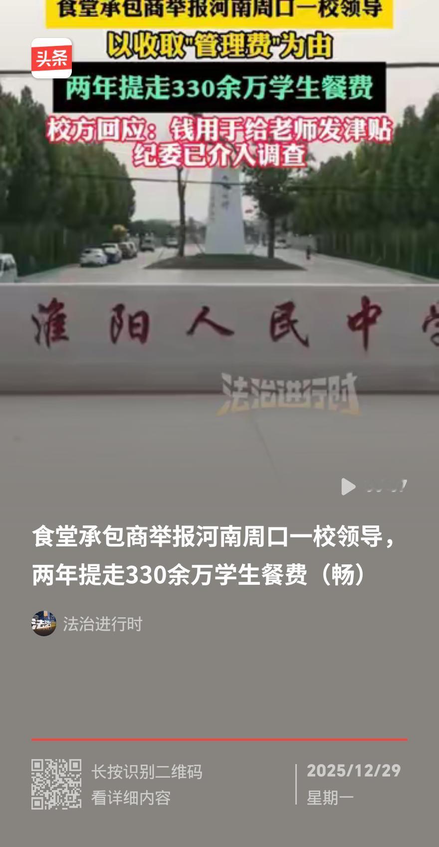 学生餐费变“唐僧肉”?河南食堂老板实名举报,两年被榨330万 河南一位大姐承包学校食堂,本想靠三千学生每天20元的三餐餐费赚点辛苦钱,没想到竟成了校领导的“摇钱树”,两年被强收330多万管理费,忍无可忍的她选择实名举报。 当初签合同,白纸黑字写着管理费按4.5%收取。大姐实打实投入,装修后厨、添置设备、招聘厨师保洁,还专门组织食品安全培训,一心想给孩子做热乎干净的饭菜。 可合同刚执行没多久,校领导突然变脸,硬要把管理费涨到15%。大姐拿着合同据理力争,直言这是违约,自己根本扛不住。领导却放出狠话:要么交钱,要么走人。 前期投入全砸在了食堂,大姐只能咬牙答应。此后两年,她每天提心吊胆,一边保障三餐供应,一边凑钱交返点。算账时才发现,这两年竟被拿走330多万。要知道,20元管三餐本就没多少利润,高额抽成逼得她只能压缩成本。 面对举报,校方辩称钱用于发放教师津贴,还承认15%的管理费违规。但明眼人都清楚,不管钱用在哪,单方面撕毁合同、强收高额管理费的行为,早已触碰底线。 根据相关规定,食堂管理费不得超过餐费总额的5%,且必须写入合同,不得私自变更。这种利用职权压榨商户、克扣学生餐费的行为,不仅违约,更涉嫌权力寻租,必须严惩! (全文约480字) 要不要我帮你提炼这篇快讯的核心观点清单,方便你后续发评论区?校园食堂贪腐 家长吐槽食堂 小学食堂贪腐