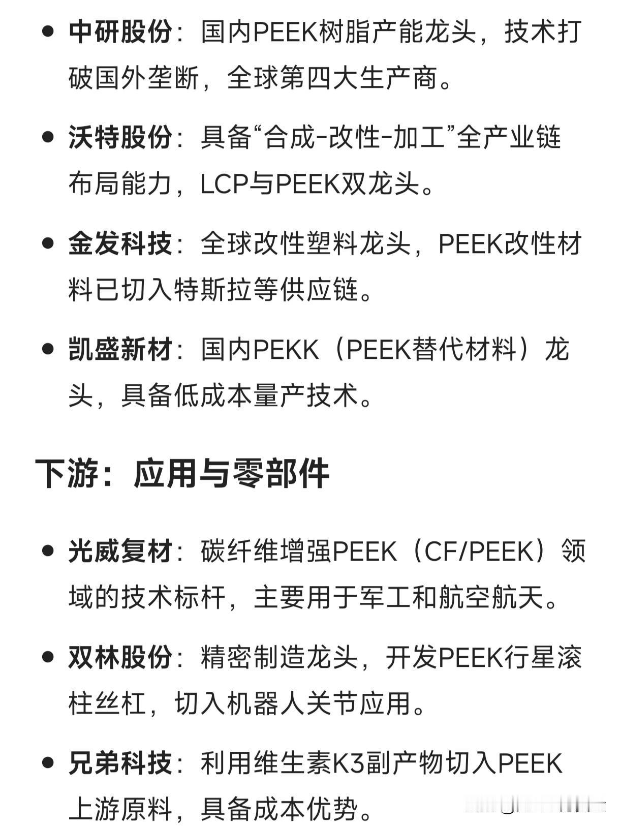 PEEK材料产业链的龙头企业 上游:核心原料与单体(DFBP) 中欣氟材:全球最大的PEEK关键单体(DFBP)生产商,产能及成本控制领先。 新瀚新材:全球主要的DFBP供应商之一,深度绑定国际化工巨头。 中游:树脂合成与改性 中研股份:国内PEEK树脂产能龙头,技术打破国外垄断,全球第四大生产商。 沃特股份:具备“合成-改性-加工”全产业链布局能力,LCP与PEEK双龙头。 金发科技:全球改性塑料龙头,PEEK改性材料已切入特斯拉等供应链。 凯盛新材:国内PEKK(PEEK替代材料)龙头,具备低成本量产技术。 下游:应用与零部件 光威复材:碳纤维增强PEEK(CF/PEEK)领域的技术标杆,主要用于军工和航空航天。 双林股份:精密制造龙头,开发PEEK行星滚柱丝杠,切入机器人关节应用。 兄弟科技:利用维生素K3副产物切入PEEK上游原料,具备成本优势。