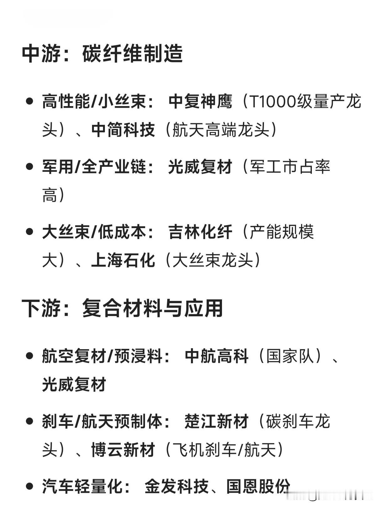 碳纤维产业链各环节的龙头企业汇总 上游:原材料与设备 原丝(大丝束): 吉林碳谷(全球产能领先) 原丝(小丝束/军用): 光威复材(实现全系列国产化) 生产设备: 精工科技(国内整线设计制造龙头) 中游:碳纤维制造 高性能/小丝束: 中复神鹰(T1000级量产龙头)、中简科技(航天高端龙头) 军用/全产业链: 光威复材(军工市占率高) 大丝束/低成本: 吉林化纤(产能规模大)、上海石化(大丝束龙头) 下游:复合材料与应用 航空复材/预浸料: 中航高科(国家队)、光威复材 刹车/航天预制体: 楚江新材(碳刹车龙头)、博云新材(飞机刹车/航天) 汽车轻量化: 金发科技、国恩股份