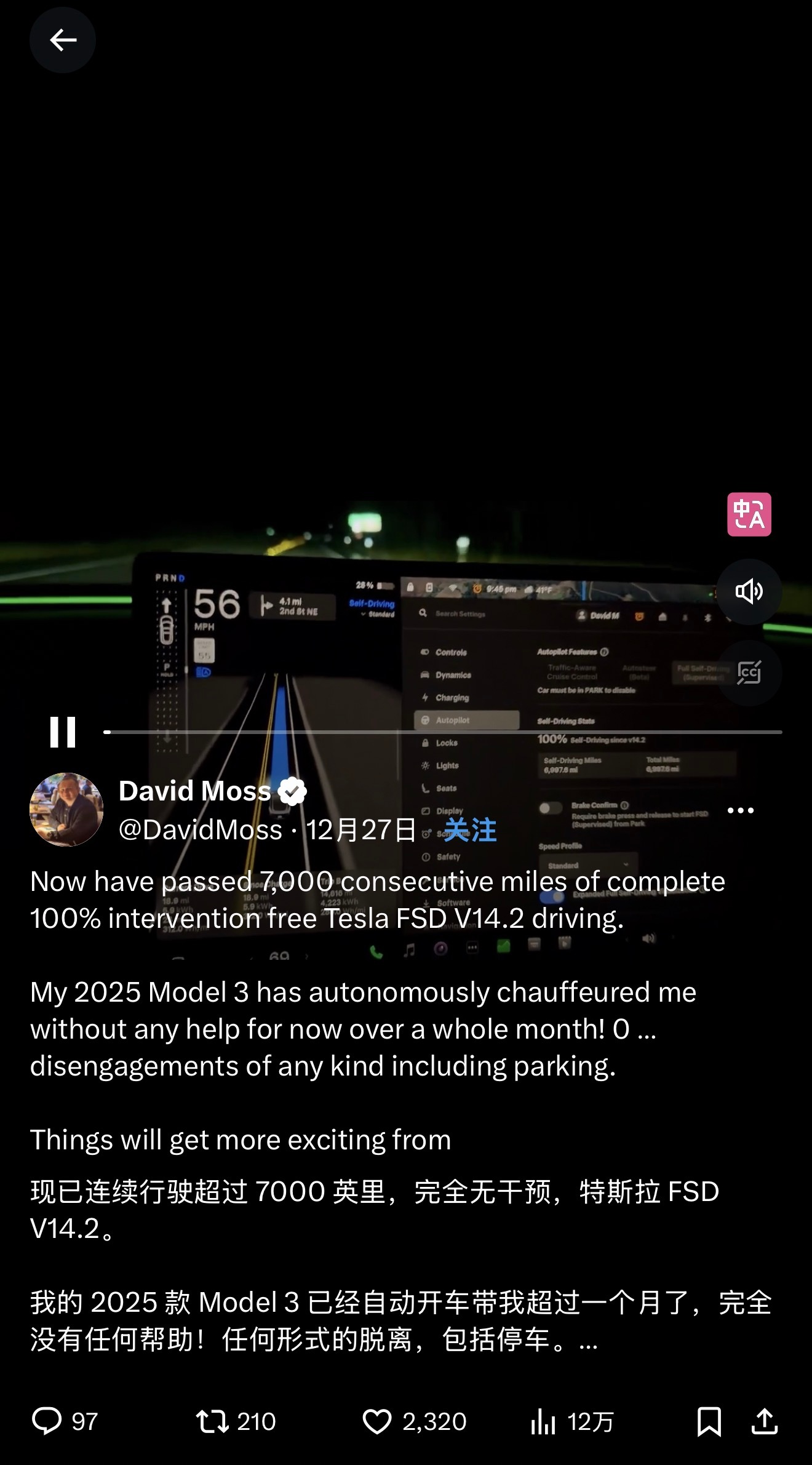 外网这位老哥,FSD开了7000英里,无接管和干预,有点猛。