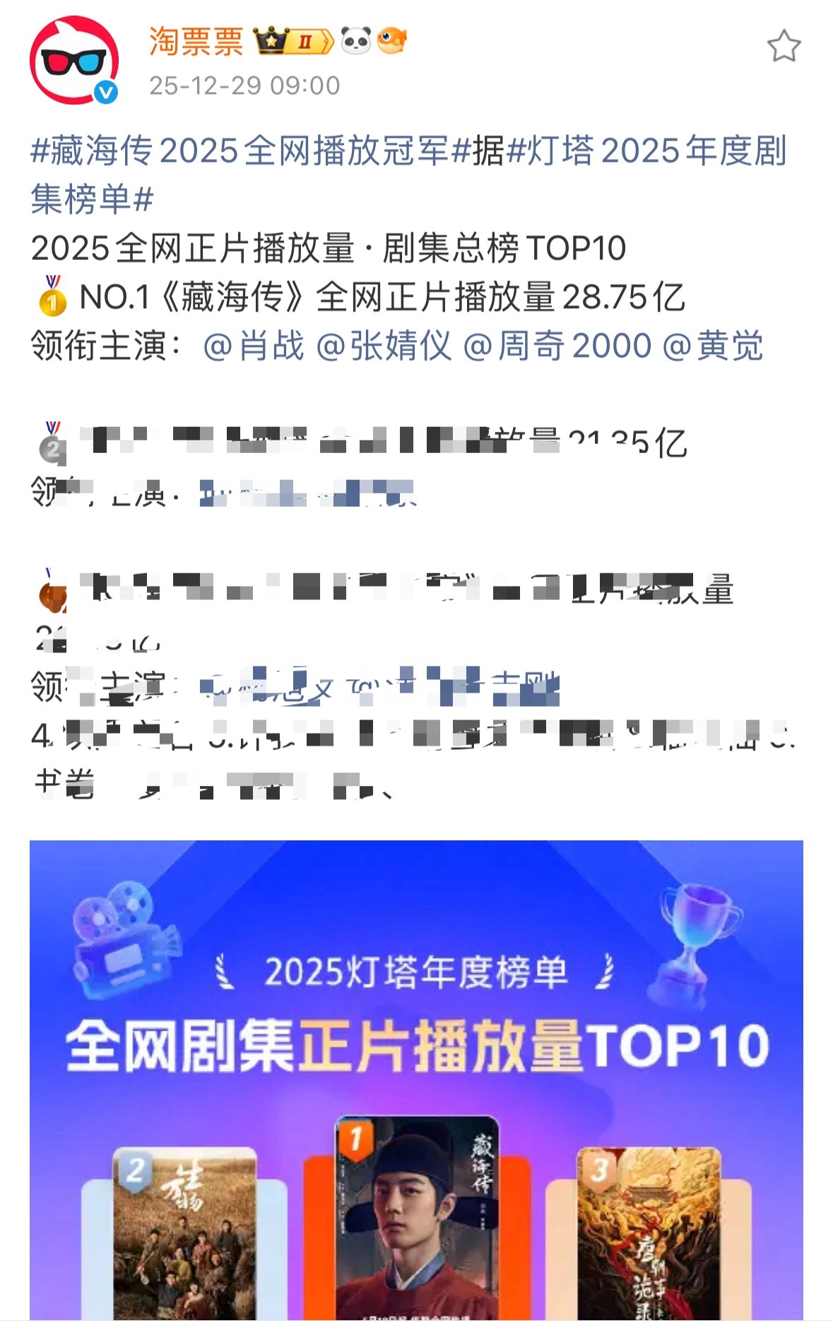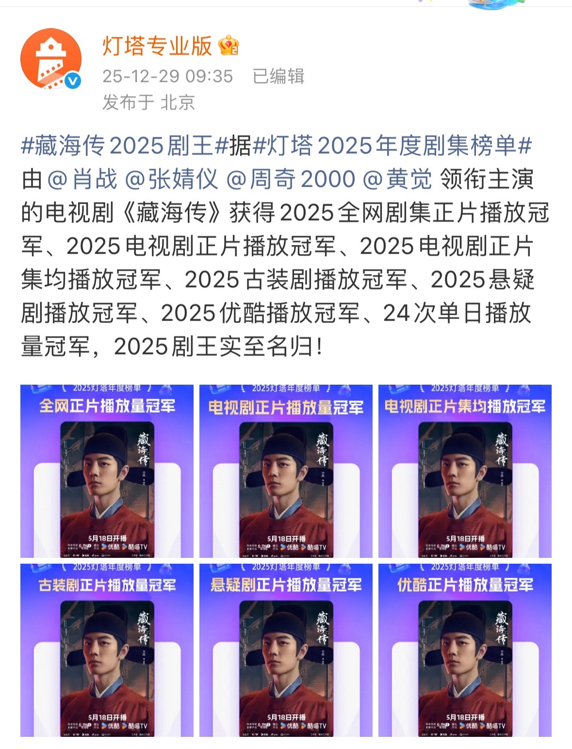 根据灯塔2025年度剧集榜单显示,肖战藏海传2025全网播放冠军,同时《藏海传》唯一七榜认证现象级大爆剧👍🏻