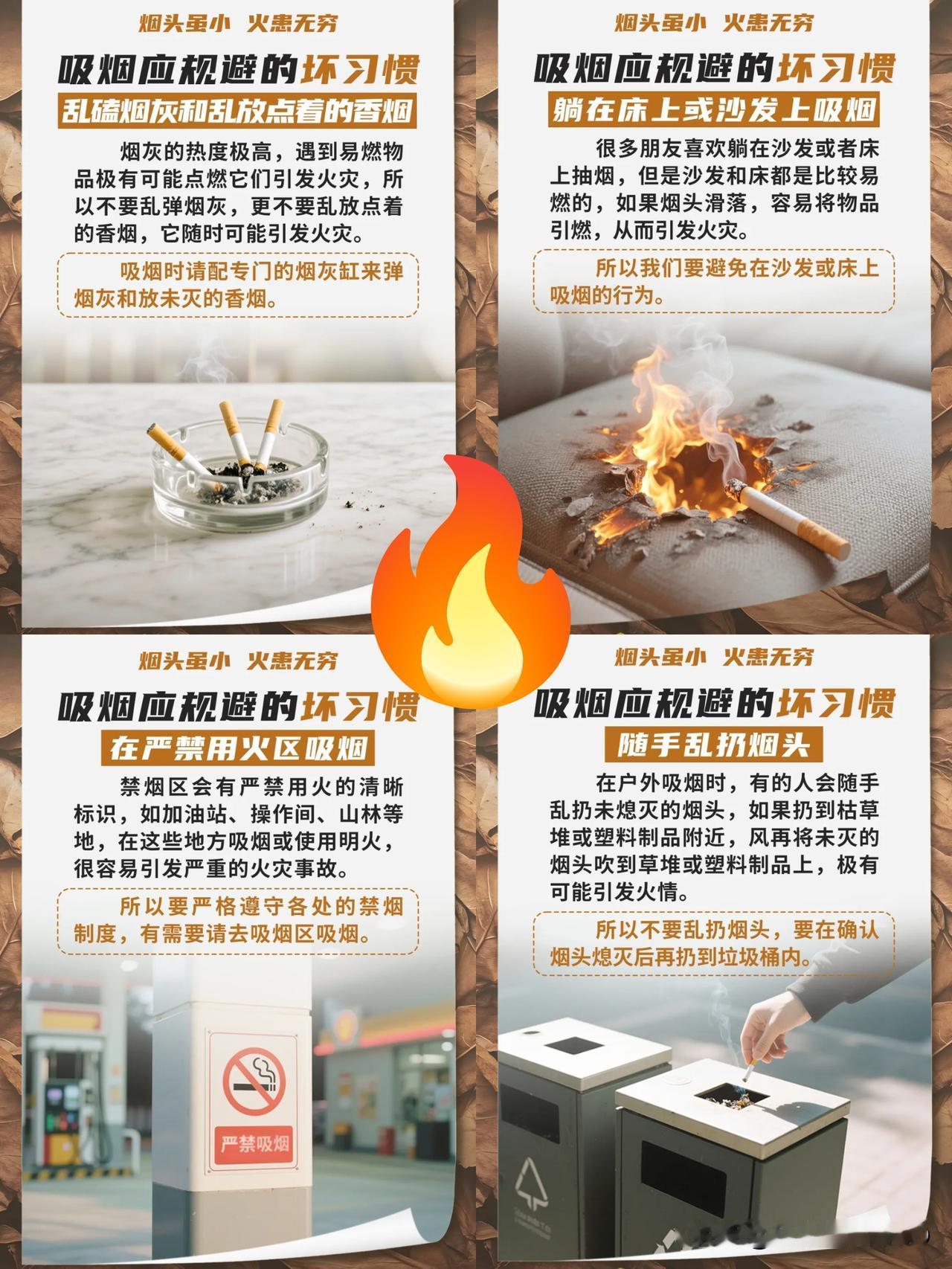 吸烟...害己,更害百姓! 一根吸剩的烟头,可燃1-4分钟,引发的火灾超18%。 前有4月份发生在辽宁辽阳白塔区三里厨娘饭店的重大火灾,造成22亡3伤,直接经济损失超2500万元,目前已证实火灾的直接原因系顾客王某随意丢弃未熄灭的烟头。 后有11月份发生在香港新界大埔区宏福苑的五级大火,造成161亡79伤,直接经济损失约60亿港币,广泛质疑为建工工人丢弃烟蒂所致,目前尚在调查当中。 千里之堤,溃于蚁穴。大家要做到防患未然、防微杜渐,拒绝因一颗小小的烟头而引发出触目惊心的惨案。