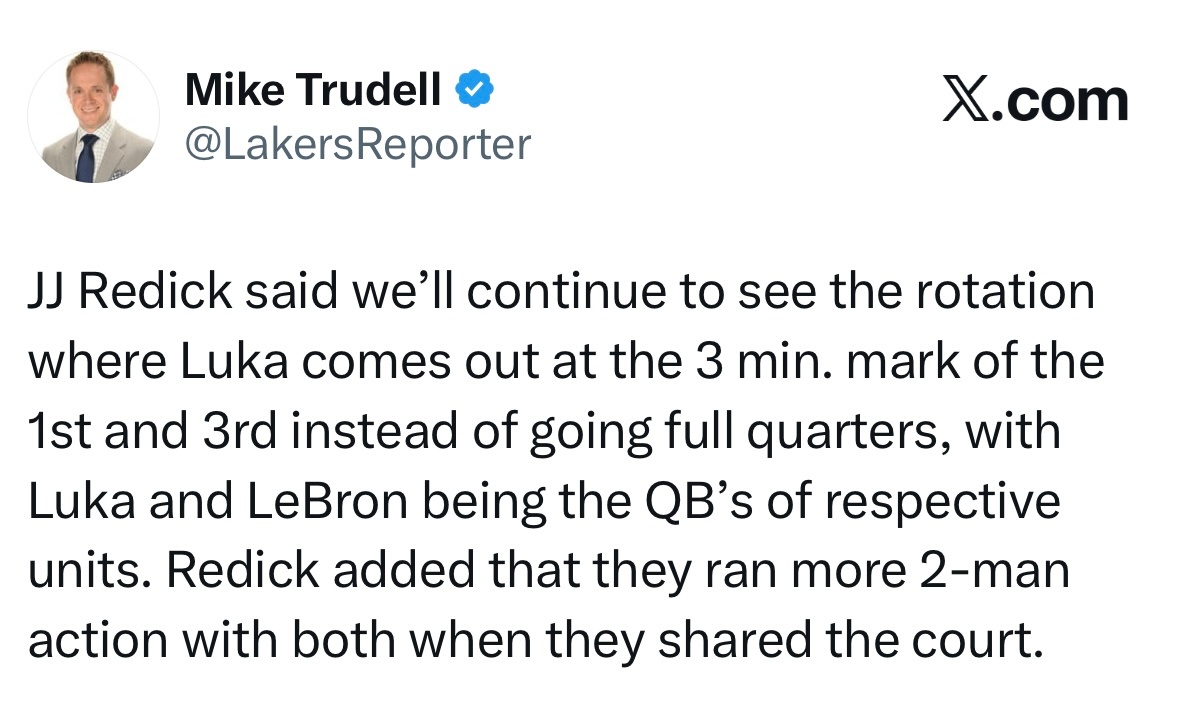 雷迪克表示,球队会沿用当前的轮换安排:东契奇将在首节和第三节还剩3分钟时下场休息,而非打满整节;东契奇和勒布朗则会分别担任各自阵容的战术发起点。雷迪克还补充道,在两人同时登场时,球队为他们设计了更多的二人配合战术。