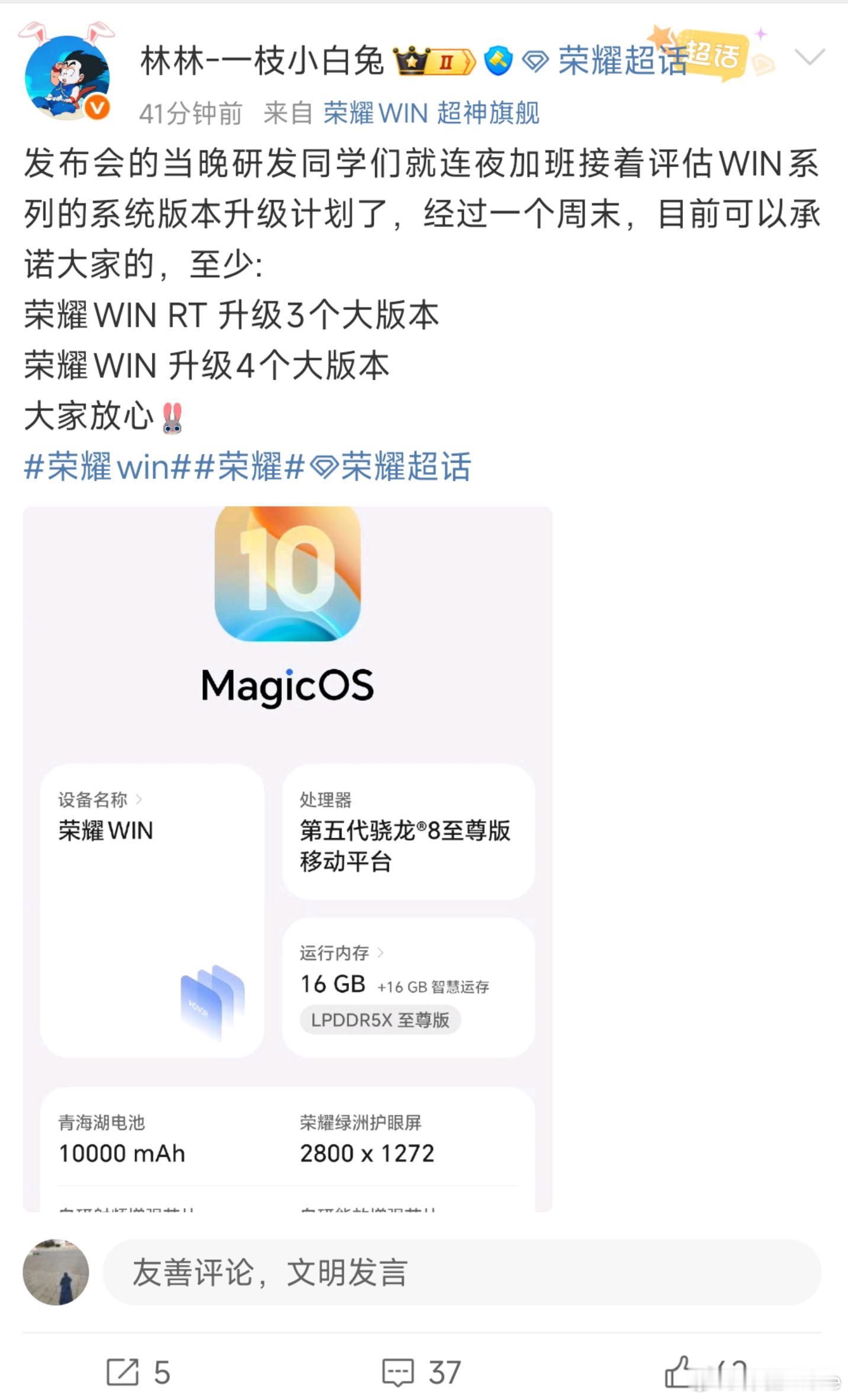 荣耀WIN系列系统版本升级计划:荣耀WIN至少升级4个大版本,WIN RT至少升级3个大版本。这就正常多了。最好就是发布会不提这档子事,直接宣传两个大版本肯定挨喷。