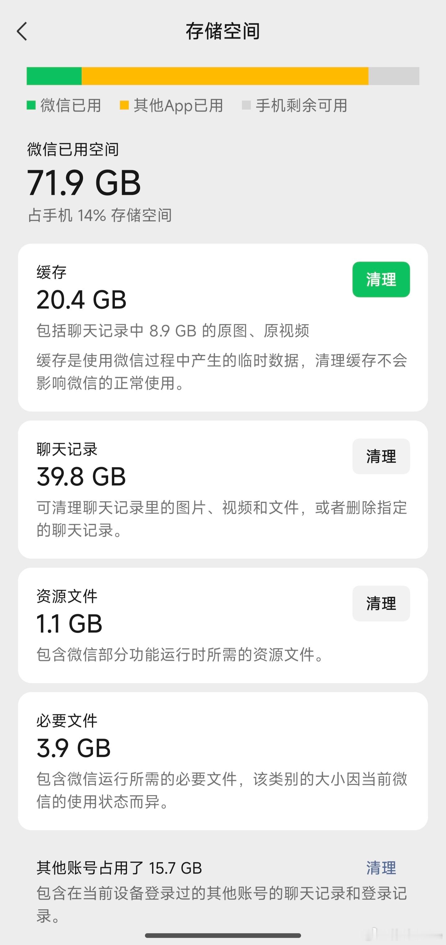微信回应占用存储空间微信派:微信占用空间在40GB以上的用户,聊天记录平均占比达70%。我一个工作号,一个生活号,总共占用120GB,这还是最近三年的,23年之前的聊天记录都保存在电脑上了。如果一直不备份清理,多大闪存都不够微信用的。