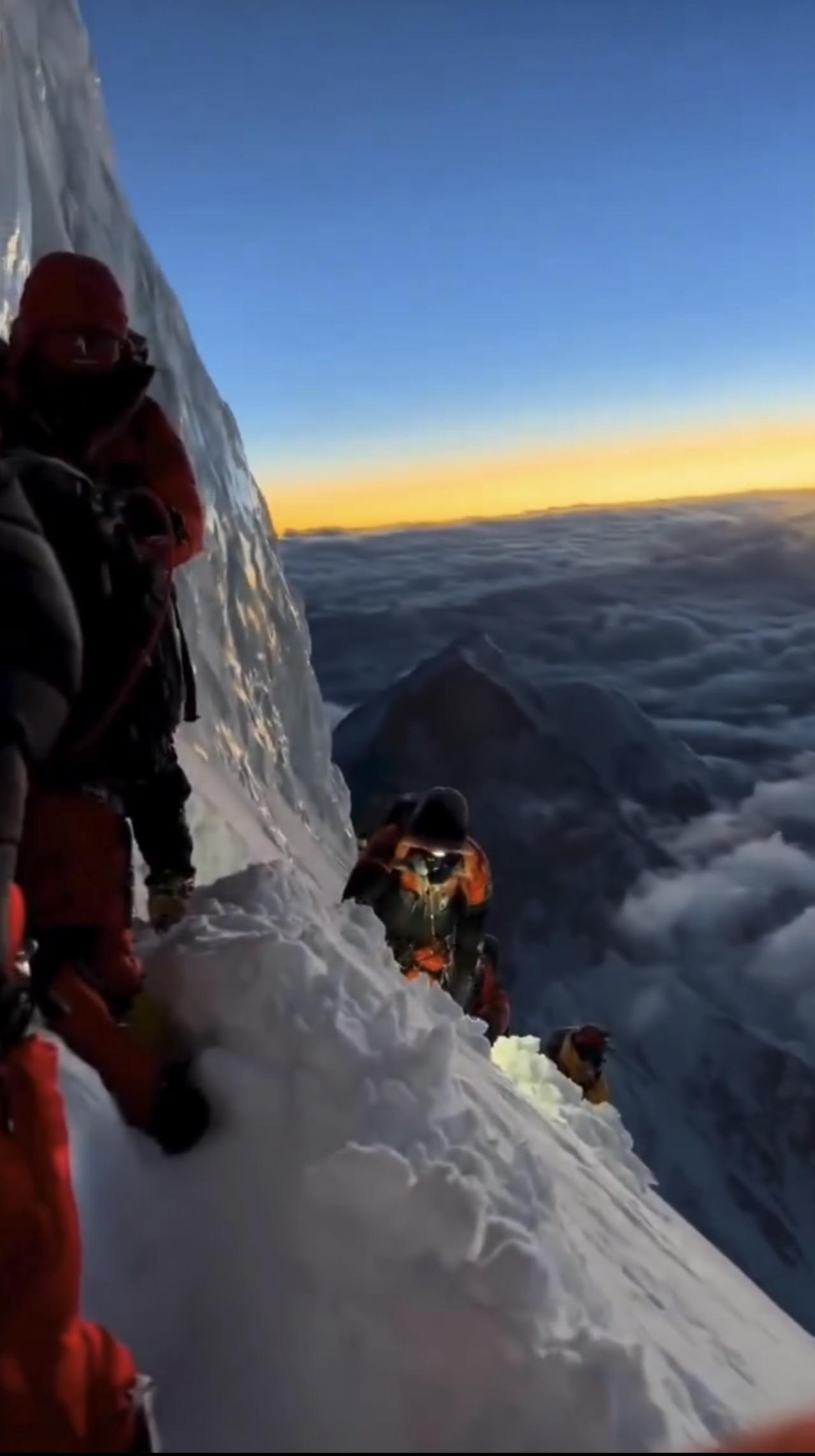 毫无疑问,这是世界上最危险的路 它就是K2的“横切瓶颈” 想象一下,你已经爬到海拔8200米以上,空气稀薄得每喘一口气都像在拼命,腿也沉得像灌了铅。这时候,前方出现一道巨大的冰墙,十几层楼那么高,表面全是裂缝,随时可能整个塌下来。你得贴着这面冰墙的脚下,往左横着走大约100米,才能绕过去继续往山顶冲。这段横切,就是登山圈里人人谈之色变的“瓶颈”(The Bottleneck)。 为什么叫瓶颈?因为这里地形像个漏斗,所有想从经典的阿布鲁齐路线登顶的人,都得挤在这条窄窄的雪槽里通过。上面吊着成吨的冰塔(serac),下面是五六十度的陡冰坡,一滑下去就是几百上千米的坠落。最要命的是,你没法躲,也没法跑——只能老老实实排队,一个一个挂在固定绳上慢慢挪。 很多人选择半夜出发,就是想在天亮前、太阳还没把冰烤化之前赶紧过。可一旦队伍太多,或者前面有人动作慢、固定绳没铺好,就只能干等着。有时候一等就是好几个小时,就那么暴露在冰崩随时可能砸下来的地方。那种感觉,大概就像站在一栋摇摇欲坠的高楼底下,等着它随时往你头上倒。 2008年夏天,就在这段路发生了K2历史上最惨的一次事故。那天好几支国际队伍抓住一个难得的好天气窗口一起冲顶,结果因为固定绳铺得晚、队伍拥堵,很多人都下午很晚才到顶。下撤时天已经黑了,瓶颈上方的巨大冰塔突然接连崩塌,几波冰崩直接把固定绳砸断,把人卷走。当天一共11名攀登者丧生,其中有好几位都是经验非常丰富的高手。那之后,瓶颈的名声就更“响”了。 到现在,每年夏天K2高峰期,还是能看到类似的照片:长长的队伍像蚂蚁一样排在雪坡上,头顶是白花花的冰崖,看得人直冒冷汗。有人说,爬K2真正难的不是技术,而是你能不能接受这种完全无法控制的风险——大自然随时可能甩你一巴掌,而你连还手的资格都没有。 这就是K2的瓶颈,一段只有几百米却浓缩了所有极端登山残酷本质的路。很多人正是被这种地方吸引,才一次次往K2跑;也正是这种地方,让K2永远保持着“野蛮之山”的称号。