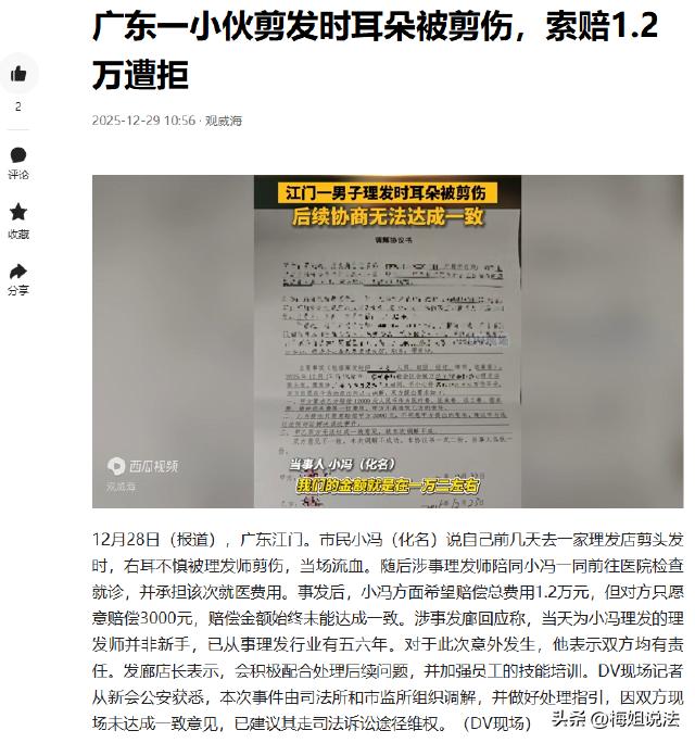 广东江门,一小伙小冯去理发店剪头发,结果右耳被理发师剪伤,当场就流血了,之后理发师陪小冯去医院,还承担了费用,可事后小冯索赔1.2万,对方只愿赔3000元,双方没谈拢。涉事发廊称理发师不是新手,双方都有责任,店长会配合处理并加强培训,记者了解到,事件由司法所和市监所调解,因未达成一致,建议走司法诉讼维权。 据观威海报道,12月28日消息,小冯前几日去理发店剪发,没想到右耳被剪伤流血。理发师马上陪他去医院,还付了医药费。小冯觉得损失大,索赔1.2万,可对方只肯赔3000元,双方僵持不下。 小冯本来想着剪个头发,让自己精神精神,高高兴兴走进理发店。谁能想到,这理发师一剪刀下去,直接把他右耳给剪伤了,血就流下来了。 小冯当时又疼又惊,心里别提多委屈了。理发师倒也没含糊,赶紧陪着小冯就往医院跑,还把医药费给垫上了。 小冯觉得自己受了这么大罪,后续肯定还有不少麻烦,比如可能得请假休息,耽误工作,还有精神上的折磨啥的,所以就跟理发店索赔1.2万。他觉得这要求也不算过分,毕竟自己受了伤,多要点赔偿也是应该的。 但理发店那边可不这么想,他们觉得小冯要的赔偿太多了,只愿意赔3000元。这差距可太大了,双方就这么僵持上了,谁也不肯让步。 发廊那边也出来说话了,说他们这理发师可不是新手,都有五六年经验了,这意外是双方都有责任。还说店长会配合处理后续的事,还打算加强员工培训,以后避免类似的事再发生。 发廊说双方都有责任,这种说法合理吗? 从一般情况看,理发师在操作过程中造成顾客受伤,理发师存在明显过错,应承担主要责任。 但如果小冯在理发过程中有突然乱动等不配合行为,那小冯可能也要承担一定责任。 不过目前没有信息表明小冯有不配合情况,所以发廊说双方都有责任不太合理。 记者从新会公安那边了解到,司法所和市监所组织了调解。这调解过程也挺不容易的,两边都有自己的想法,都不肯轻易妥协。 司法所和市监所的工作人员也是费了不少口舌,想把这事给平了。可最后还是没达成一致,两边都不满意这个调解结果。 调解只是解决纠纷的一种方式,没成功也不意味着就没办法了。 司法所和市监所就建议小冯走司法诉讼途径,通过打官司来维权,让法院来判这事到底该怎么解决。 这事闹到要打官司的地步,小冯心里也挺犯难的。他本来就想简简单单剪个头发,没想到惹出这么大麻烦。现在又要打官司,他既担心自己能不能赢,又怕打官司太麻烦,耗费太多时间和精力。 理发店觉得理发师不是故意的,而且也积极配合小冯去医院,还付了医药费,已经做得挺好了。小冯要那么多赔偿,他们实在接受不了。他们也在想,要是真打官司,自己会不会败诉,要赔更多钱。 从法律层面来说,这理发师在理发过程中造成小冯右耳受伤,这明显是侵犯了小冯的健康权。 根据《民法典》第一千一百六十五条规定,行为人因过错侵害他人民事权益造成损害的,应当承担侵权责任。 理发师在操作过程中没有尽到合理的注意义务,导致小冯受伤,存在过错,所以理发师应该承担赔偿责任。 如果理发师是受发廊雇佣,那发廊要承担责任吗? 根据《民法典》第一千一百九十一条规定,用人单位的工作人员因执行工作任务造成他人损害的,由用人单位承担侵权责任。用人单位承担侵权责任后,可以向有故意或者重大过失的工作人员追偿。 理发师是在为发廊工作过程中造成小冯受伤的,所以发廊要先承担赔偿责任,之后如果理发师有故意或者重大过失,发廊可以向理发师追偿。 小冯索赔1.2万,这个数额合理吗? 如果小冯因为受伤产生了医疗费、误工费、护理费、交通费等实际费用,还有精神损害抚慰金等,把这些都加起来,如果达到或者超过1.2万,那小冯的索赔就是合理的。 但如果实际损失没这么多,小冯索赔1.2万就可能得不到支持。 作为服务行业的理发店,出了事,也要积极面对,主动承担责任,而不是一味地推诿扯皮。 您对这件事有什么看法呢?