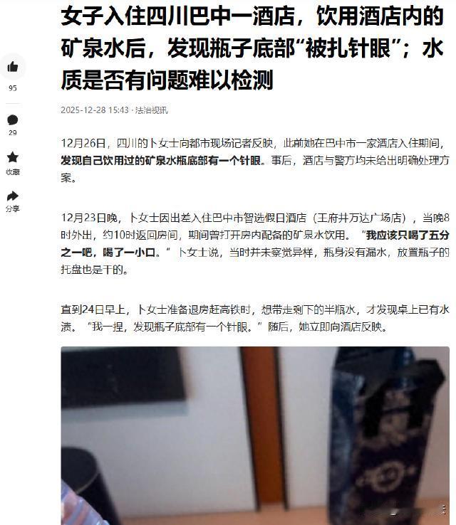四川巴中,出差的卜女士入住某假日酒店,当晚喝了房内配备的矿泉水,早上退房时发现桌上水渍,一捏瓶子,底部竟有个针眼。卜女士向酒店反映,酒店称监控显示无人进入房间,不清楚瓶子是怎么破的,监控也已经交给警方了。卜女士报了警后,民警因她没身体不适表示立不了案,卜女士还向酒店集团的总部投诉了,却没得到回复,也难找专业机构检测水质,事情陷入僵局。 据法治视讯2025-12-28日报道:12月23日晚上,卜女士因为工作出差,来到了四川巴中,她入住的是某假日酒店,这酒店看着还挺正规,卜女士也没多想,就安心住下了。 到了房间,卜女士有点口渴,看到桌上放着酒店配备的矿泉水,就顺手拿起来喝了几口。当时她也没觉得这水有什么不对劲的地方,喝完就继续忙自己的事了。 24日早上,卜女士准备退房。她收拾东西的时候,不经意间看到桌上有一滩水渍。 这水渍是从哪来的呢?她拿起桌上的矿泉水瓶,用手一捏,感觉有点不对劲。仔细一看,瓶子底部竟然有个针眼!这针眼细小又隐蔽,不仔细看还真发现不了。 卜女士心想这水她昨晚可是喝过了呀,这针眼会不会是有人故意扎的?这水里会不会被注入了什么不好的东西?她赶紧联系了酒店的前台。 酒店前台接到卜女士的反映后,也挺重视,马上就去查了监控。 过了一会,告诉卜女士,监控显示在她入住期间,没有人进入过她的房间,所以他们也不清楚这瓶子到底是怎么破的。而且,酒店已经把监控视频提供给了警方。 卜女士听后,心里感觉更没底了,她觉得这事可不能就这么算了,万一这水真的有问题,那可就麻烦大了。 于是,她报了警。卜女士把情况跟民警详细地说了一遍,还把剩下半瓶有针眼的矿泉水交给了民警,她期待着警察能帮她查明真相,给她一个说法。 民警说,因为卜女士目前没有出现身体不适的症状,所以这事目前还算不上是一个案件,没办法立案调查。 民警还告诉卜女士,要是她觉得这水有问题,而且自己留了样本的话,可以向市场监管部门反映。 卜女士听了民警的话,她觉得这水有问题,可又没办法证明,现在民警又不管,这可咋办呢? 她想了想,于是,她又向酒店的总部进行了投诉。 然而,让卜女士更加无奈的是,她左等右等,始终没有收到总部的任何回复。 这还不算完,卜女士还发现,自己想找个专业机构来检测一下这瓶水的质量,也是困难重重。 她问了好多人,都不知道该找哪个机构,也不知道检测流程是怎样的。 这事情一下子就陷入了僵局,卜女士不知道该怎么办才好。 酒店一直强调监控显示没人进房间,所以不是他们的问题,让卜女士去找民警,民警又因为卜女士没有身体不适的症状,无法立案,让卜女士去找酒店或者市监局。 双方就这么互相推诿,把卜女士夹在中间,让她左右为难。 卜女士现在每天都在为这件事烦恼,她不知道这瓶有针眼的水到底有没有问题,也不知道自己接下来该何去何从。 她只希望相关部门能够重视起来,尽快查明真相,给她一个合理的交代,保障她作为消费者的合法权益。 从法律层面来看,民警称卜女士没身体不适立不了案,这有一定依据但也不完全绝对。 依据《刑事诉讼法》规定,公安机关立案需满足有犯罪事实、需要追究刑事责任等条件。 卜女士这事,目前没有证据表明有人实施了危害她健康的犯罪行为,且她未出现身体不适,从表面看似乎不符合刑事立案标准。不过,这并不意味着这事就该被忽视。 酒店称监控显示无人进入房间,就认为不是自己的责任,这种做法也不妥。虽然监控没拍到有人进入,但不能排除其他可能性,酒店有保障消费者安全的义务,不能简单推诿。 根据《消费者权益保护法》第十八条规定,经营者应当保证其提供的商品或者服务符合保障人身、财产安全的要求。对可能危及人身、财产安全的商品和服务,应当向消费者作出真实的说明和明确的警示,并说明和标明正确使用商品或者接受服务的方法以及防止危害发生的方法。 酒店提供的矿泉水出现针眼,这明显存在安全隐患,酒店有责任保障消费者使用安全,不能以监控没显示为由就推脱责任。 卜女士若觉得水有问题且留样本,可向市监局反映,市监局有职责对商品质量进行监管,卜女士向其反映情况,有助于进一步查明水质是否有问题。 建议卜女士先保留好相关证据,把有针眼的矿泉水瓶、与酒店沟通的记录等保留好。 然后按照警方建议,向市场监管部门详细反映情况,配合市场监管部门进行调查。如果市场监管部门调查后发现问题,可依据相关法律法规追究酒店责任,维护自身合法权益。