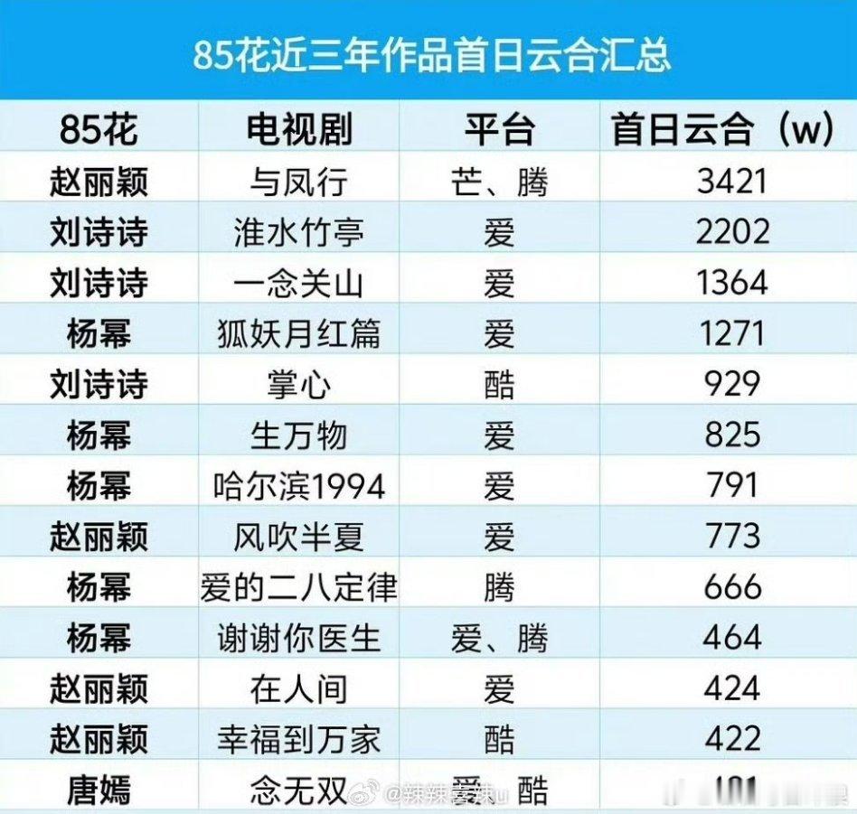85花近三年作品首日云合:赵丽颖与凤行第一,刘诗诗淮水竹亭/一念关山第二和第三,杨幂狐妖月红篇第四。