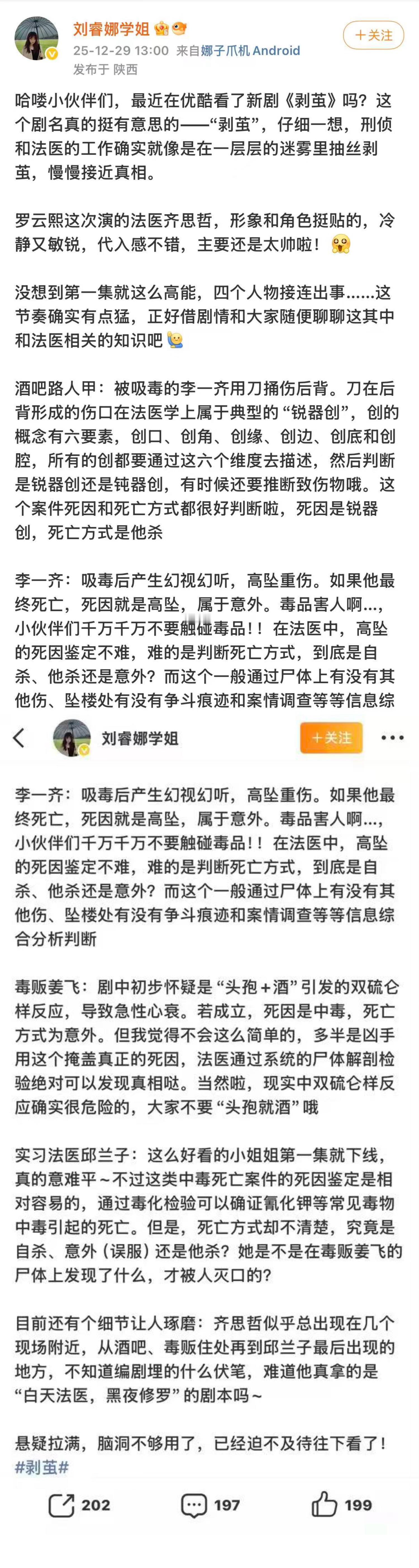 剥茧给法医学学生划重点了 原来专业法医也在追《剥茧》!近日,两位法医发博,对剧中验shi等戏份给予肯定还借此科普法医知识。法医表示罗云熙饰演的法医齐思哲,专业形象令人信服。第一案“洛丽塔sha 人事件”中,du 贩姜飞shi 体初判为意外死亡,齐思哲却从shi 体温度、shi 斑等细节层层分析,纠正死亡时间推断,还锁定头孢药物来源,排除嫌疑;实习法医邱兰子急性氰化物中du ,齐思哲迅速推断du 物入体时间途径,指明侦查方向,洗清自己嫌疑。第二案“夺命漏斗蛛”中齐思哲一眼识别危险漏斗蛛也展示了他敏锐的洞察力……肯定了《剥茧》作为一部以法医为核心的刑侦剧,在专业细节方面的呈现剧中镊子夹皮肤碎屑、显微镜下观细胞异变等专业操作特写,细节满满。从计算湿度推算死亡时刻,到依据肺叶藻类锁定抛shi 地点,知识点十分硬核。该剧严谨程度获法医背书,堪称给法医学学生期末划重点,剥茧 真的太绝了!2025娱乐年终盘点