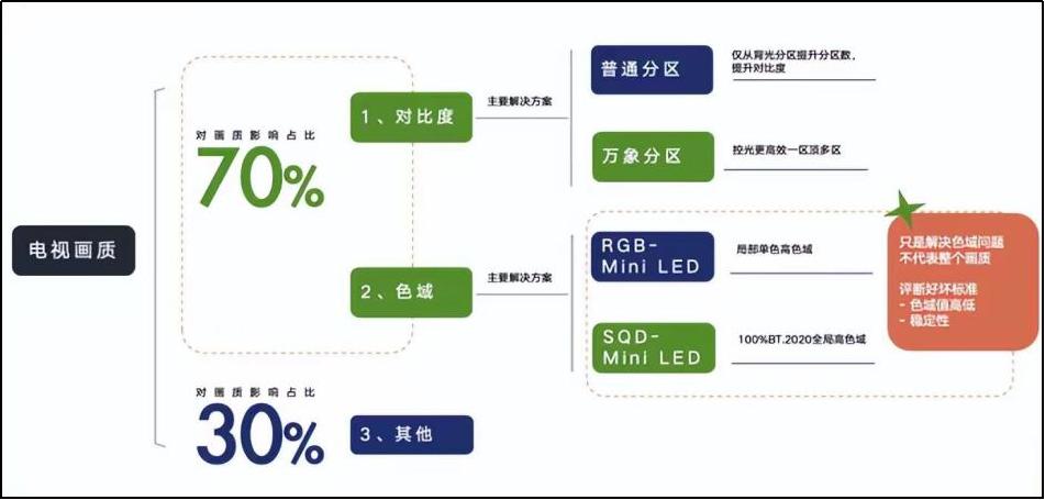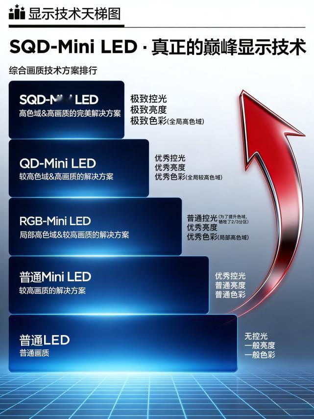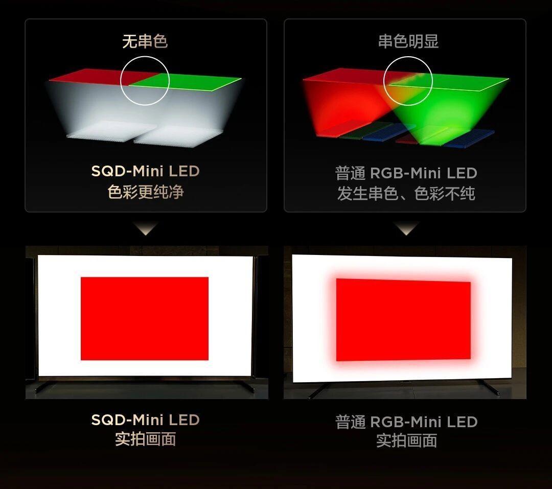 年度电视显示技术盘点,SQD技术揭开画质真相 开篇先问一下,你们觉得电视想要好画质,核心是什么? 近年来,电视行业掀起了一场关于高画质的技术竞赛。尤其各大厂商纷纷将提升亮度,分区和色域做为重点,尤其会把高画质和高色域划等号,试图吸引大家的目光。然而,高色域真的等于高画质吗? 还在看色域数值高低来选电视的话,我劝你们可要擦亮眼睛好好研究一下画质好的密码到底是什么,再做决定! 事实上,对画质的影响因素有很多,高色域只是画质的一部分,真正决定画质好坏的核心在于画面对比度,亮度和屏幕也是影响画质的因素。高对比度意味着画面中亮部更耀眼、暗部更深邃,能够呈现出通透、立体、富有层次感的视觉效果。如果是单纯追求高色域,却忽视了对比度和色彩稳定性,可能最终得到的画质也不尽人意。 今年Mini LED显示技术跨越式进步,让很多人分不清如何选?先给大家看一个天梯图,初步了解一下普通->优秀->极致的画质攀升路径。 就拿今年两大显示技术路径来说,SQD-Mini LED和RGB-Mini LED两条不同的技术路径,对画质的呈现效果都会有很大的不同。 从市场的反馈和一些显示大V的测评来看,SQD-Mini LED从“局部高色域”到“全局高色域”的技术突破,重新定义了画质的标准。 1. RGB-Mini LED技术原理和先天缺陷大揭秘 你们都知道三原色吧?对的就是红、绿、蓝,三原色,不同的组合方式,成就了自然界的多姿多彩。 传统的RGB-Mini LED技术采用红、绿、蓝三颗灯珠组合发出白光,理论上可以实现较高的色域覆盖率目前可以达到97%BT.2020,在色彩纯度上表现优异。然而,这种技术存在以下明显缺陷: 1)色彩稳定性差:这种发光原理,在纯色画面下可以呈现纯净的色彩。但在显示复杂画面时,RGB三色灯珠的光线容易相互干扰,导致串色、偏色和色晕问题,画面细节模糊不清。 2)控光能力有限:RGB-Mini LED需要三颗灯珠组成一个背光分区,分区数量大打折扣,控光精度低,对比度表现平平,画面的细节和立体感受限。 3)色彩有衰减:因为RGB的R也就是红色,衰减的速率会高于绿色和蓝色,所以长时间使用可能红色会慢慢变淡,画面色彩会受影响。 2. SQD-Mini LED:全科状元型画质王者 与RGB-Mini LED的发光原理不同的是,SQD-Mini LED技术更追求长时间的色彩稳定,和多画面的色彩饱和度统一,它通过纯净的白光激发超级量子点材料的特性,再经过超级蝶翼华曜屏幕的晶粹高色阻发出纯净的红、绿、蓝三原色光。 可以实现: 1)100%全局高色域:无论显示单色还是多色画面,SQD-Mini LED都能保持100% BT.2020的色域值,色彩表现稳定且精准,避免了RGB-Mini LED在复杂场景下的色域值大幅下降问题。 2)无串色、无偏色:单芯片设计避免了RGB三色光的干扰,画面色彩纯净、准确,这是色彩真实的关键,可以还原更极致的色彩。 3)更精准的控光能力和更高的对比度: 控光精度是决定画质立体感的关键,而SQD-Mini LED在这一领域远超RGB-Mini LED。SQD-Mini LED采用万象分区技术,通过聚核光芯、聚光透镜、微距OD设计和控光算法的系统性解决方案,实现了“一区顶多区”的控光效果。在相同成本下,SQD-Mini LED的背光分区数量可以达到RGB-Mini LED的3倍,控光更精准,不容易有溢光漏光的问题,对比度可以大幅提升,从而让画面更立体更清晰。 4)全球最薄机身:实现更极致的超薄质感 由于SQD-Mini LED采用单灯珠直发白光的特性,无需预留较长的混光距离,结合微距OD技术,可以在兼顾画质的通知实现2厘米的全球最薄机身,这种极致的纯平一体化超薄设计,是很多年轻家庭最喜欢的,能够和简约的装修风格更好的融为一体。 选电视可不是只用一两天,谁也不想选一台全能型的高画质电视,SQD-Mini LED技术无疑是更靠谱的选择。怎么选电视不踩雷装修你家电视每天都开吗?怎么样让自己保持快乐的心情电视智能好用实用