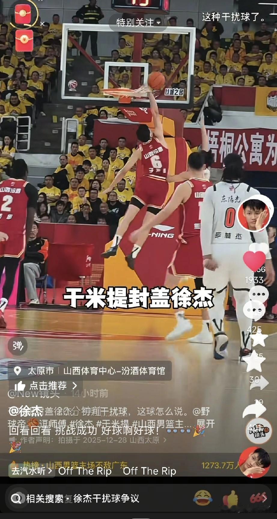 面对裁判的不公判罚,徐杰不语,只是一味好球!于米提封盖徐杰这球,是属于好帽,还是干扰球呢? 通过回放画面可以看到,徐杰上篮的时候,虽然被于米提帽到了,但于米提在帽到之前,是先触碰了篮网。 这种盖帽,我怎么记得规则里是干扰球呢?难道盖帽允许防守球员触碰篮网?那以后在进攻球员上篮的时候,防守球员一个个站在篮下,伸手用篮网把篮框遮住,直接不让球进就好了。 徐杰看到裁判这样的判罚,显然也是很无语,而且裁判还是看过录像后才做出的判罚,属于明着黑了。