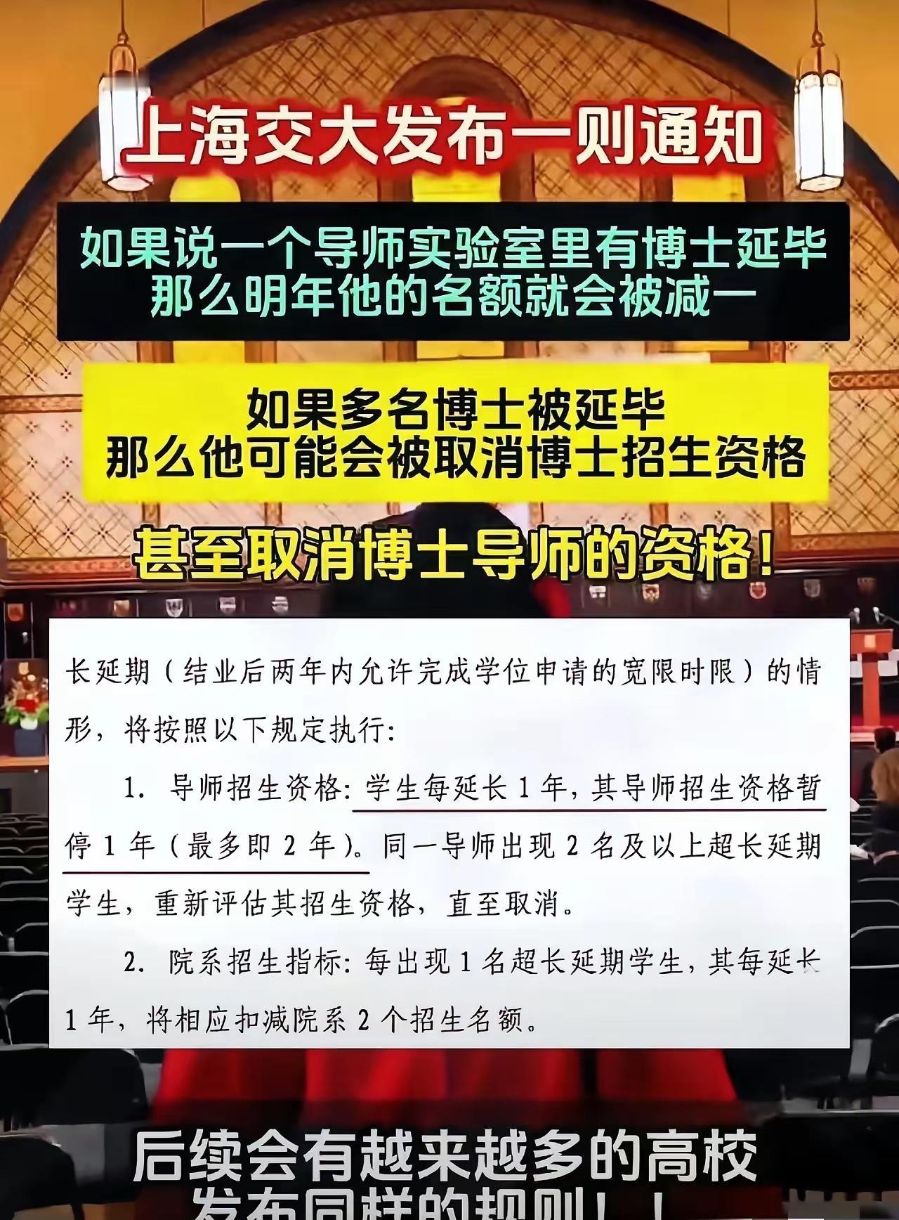 上海交大发了一则通告,把所有的在校老师吓得一批,因为通告说,博士生每延长一年,来年这位导师的招生资格就停招一年,如果两年停招,那么就要评估这位老师是否适合招收学生了,可能要停止他的博士生导师招生资格。这个就太有杀伤力,因为看谁还敢把学生当牛马,无限期延长读博期间为自己所用这招确实挺管用。 你身边有没有这样的人?读博读到头发快掉光,过年回家不敢跟亲戚碰面,就怕被问“啥时候毕业啊”。有个朋友跟我吐槽,他博五那年,实验室的门禁卡都换了三代,师妹从刚入学的小姑娘,熬成了能独当一面的师姐,他的毕业论文还卡在“再改改”的阶段。不是他不努力,是导师总说“这个项目做完就送你走”,结果项目一个接一个,他成了实验室里最资深的“劳动力”。 这种事儿以前真不少见。博士生想毕业,导师的点头比啥都重要。有些导师心里打得明白,学生多留一年,实验有人盯,论文有人写,申请项目还能搭个手,等于白捡个靠谱的帮手。学生呢?敢怒不敢言,毕竟毕业证捏在人家手里,只能硬着头皮熬。家里父母着急,自己夜里焦虑,可对着导师还得赔笑脸,这种憋屈劲儿,没经历过也能想象到。 上海交大这通告一出来,等于给这种僵局来了个“急刹车”。你想啊,导师要是还拖着学生不让毕业,来年就招不了新生。对搞学术的来说,招不到学生就像农民没了种子,团队断了档,再想做研究就难了。要是连着两年招不了,连博导的头衔都可能保不住,这可是砸饭碗的事儿,谁还敢冒这个险? 不过话说回来,也有人犯嘀咕。有个搞基础研究的老师就说,他们做的课题,有时候一个实验就得等两三年出结果,哪能说毕业就毕业?要是为了不耽误招生,硬逼着学生匆匆忙忙写论文,那论文质量能有保证吗?到时候学生拿着水论文毕业,找工作受影响,甚至影响整个学科的名声,这损失可比延期大多了。 还有学生担心,会不会有导师反过来“催命”?本来课题还能再打磨打磨,出个更好的成果,结果导师天天盯着“别延期”,逼着赶紧答辩。就像蒸馒头,本来再等十分钟就能发得又大又软,非要提前开盖,最后蒸出个硬邦邦的疙瘩,吃着硌得慌。 但不管怎么说,这政策总算让学生能喘口气了。以前是学生求着导师“放自己一马”,现在至少有个规矩在那儿,导师得掂量掂量后果。那些藏着“多留一年多干活”心思的,估计也得收敛收敛。至于可能出的问题,慢慢调整就是了,总比看着学生一年年耗着,青春全耗在无尽的“延期”里强。 各位读者你们怎么看?欢迎在评论区讨论。