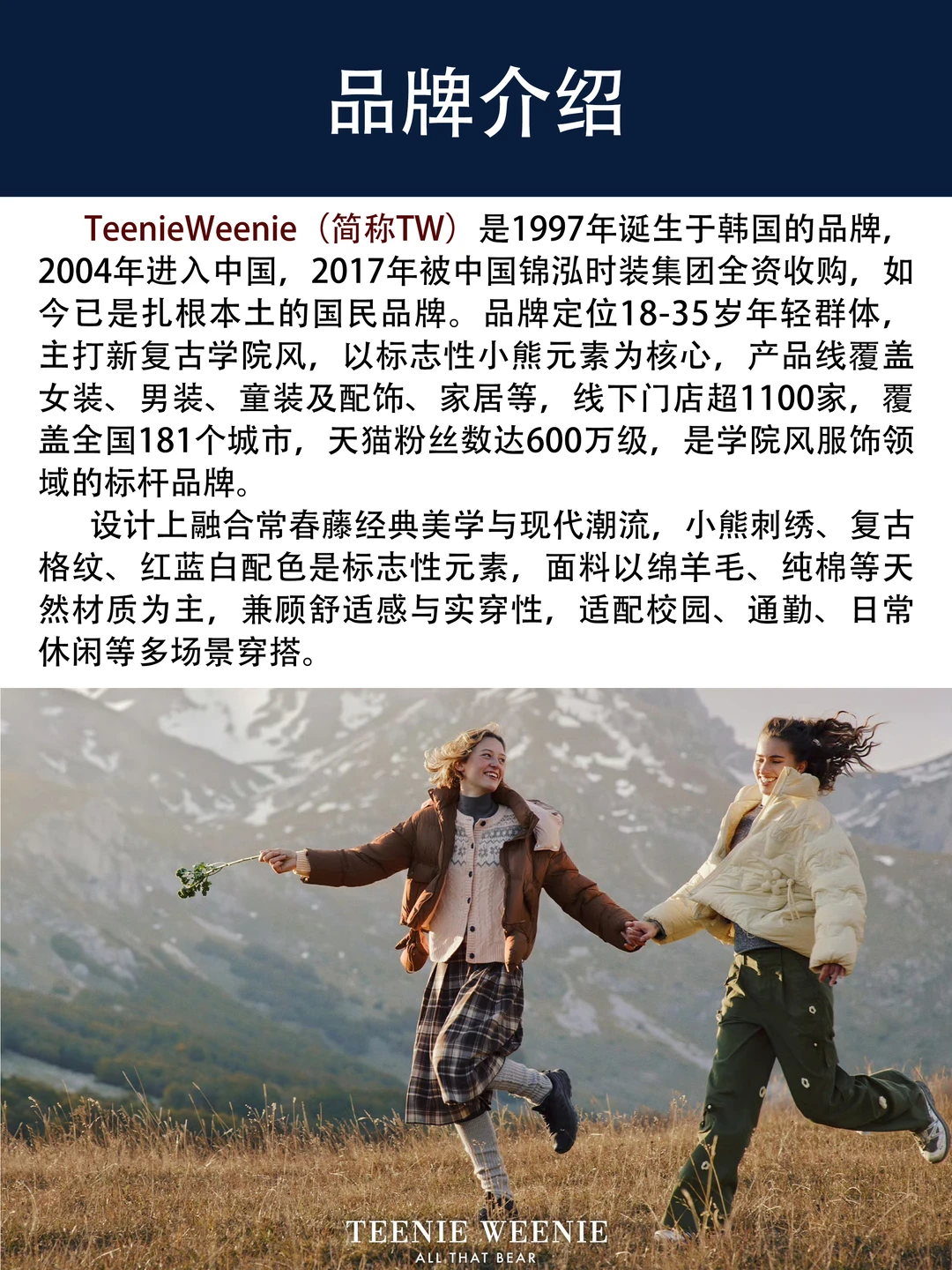 1997年诞生于韩国,2004年进入中国,2017年成为中国锦泓集团旗下品牌,如今线下门店超1000家,线上全渠道覆盖,是新复古学院风的标杆品牌。以熊家族IP为灵魂,从服饰延伸到配饰、家居等生活场景,妥妥的国民级青春品牌~