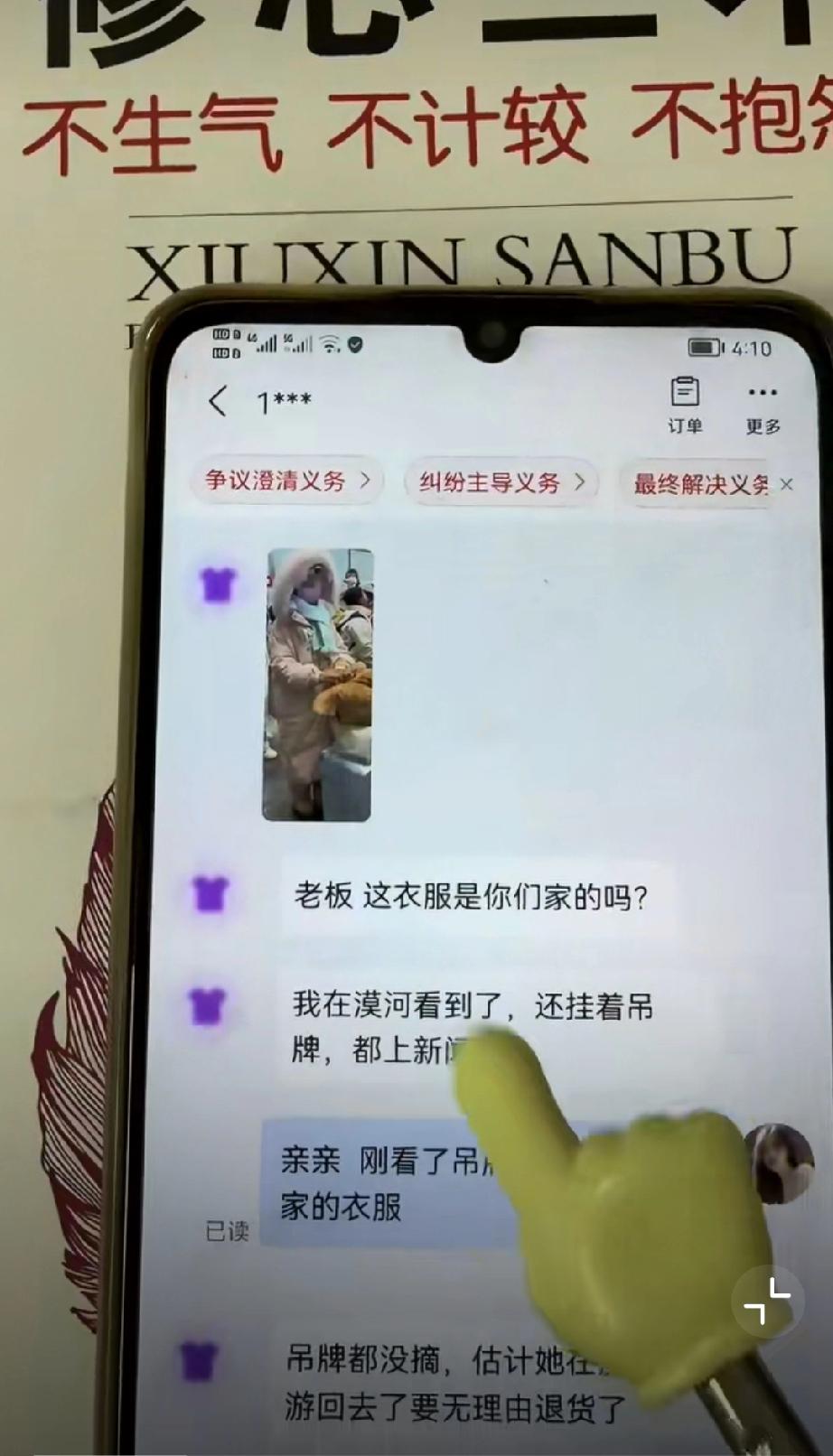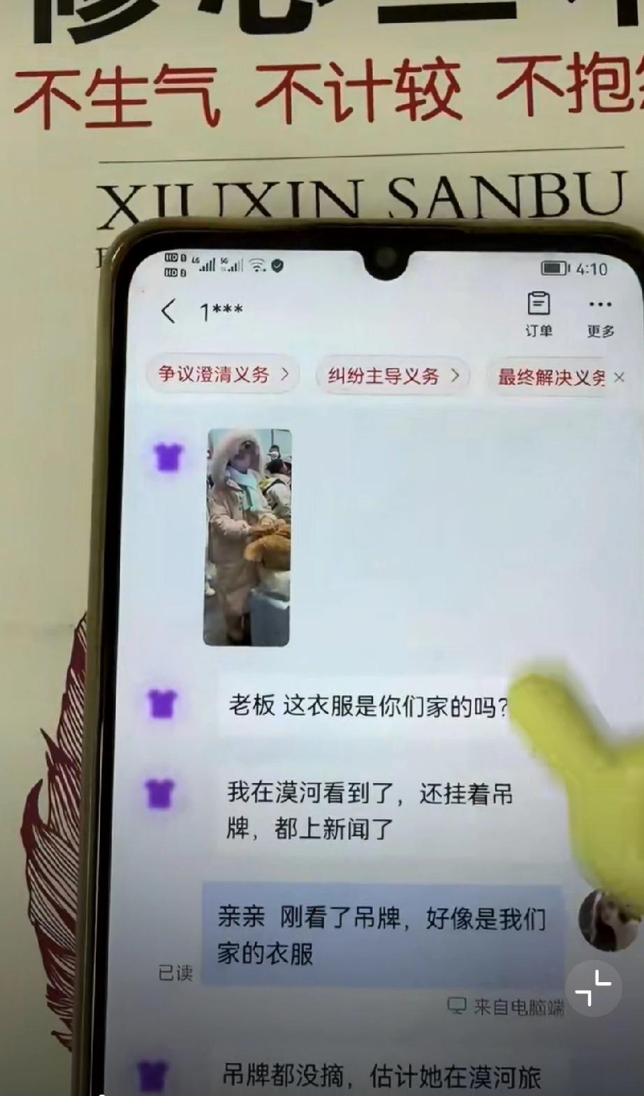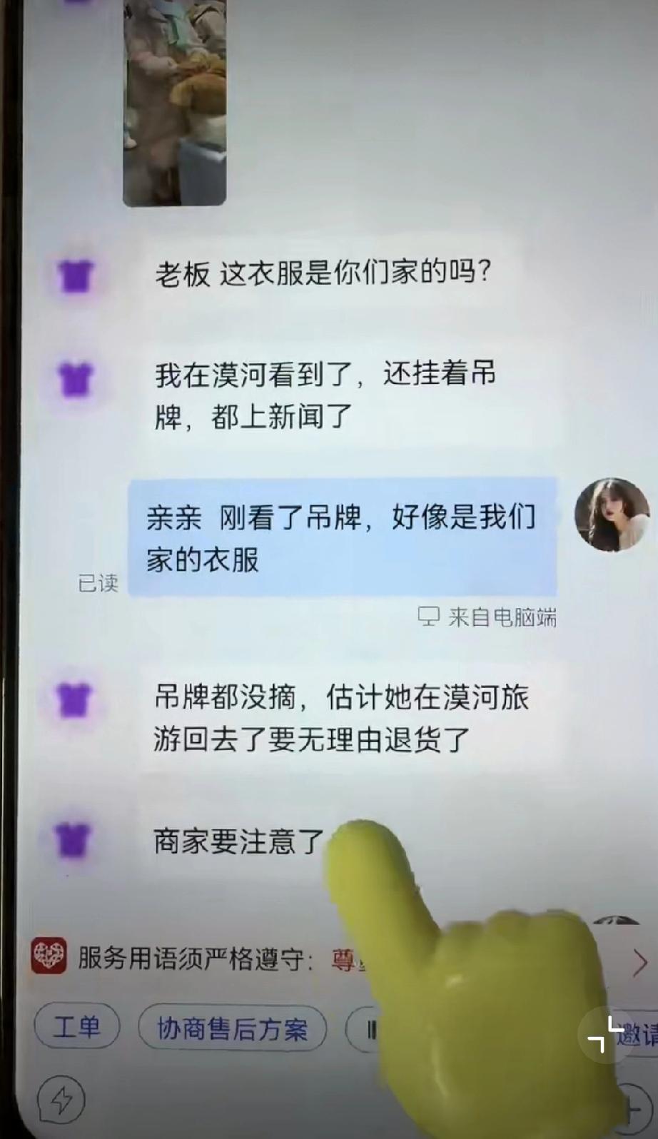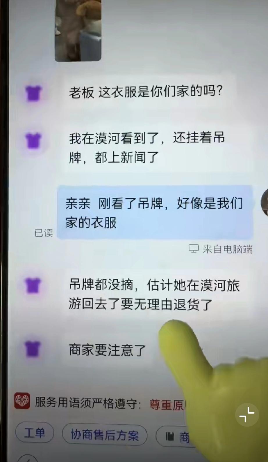 网友漠河旅游时发现一女子穿带有吊牌的衣服,他拍下后发给商家防备其穿后退款。最近看到一种无耻的套路:去某地旅游前,事先在网上下单几件衣服,地址写旅游目的地,然后人都不用带衣服,到了后不去吊牌直接穿,旅游完直接退货...这无耻程度我以为是开玩笑,没想到真有人这么干![捂脸]漠河冬季旅游 东北漠河旅游 黑龙江漠河旅游