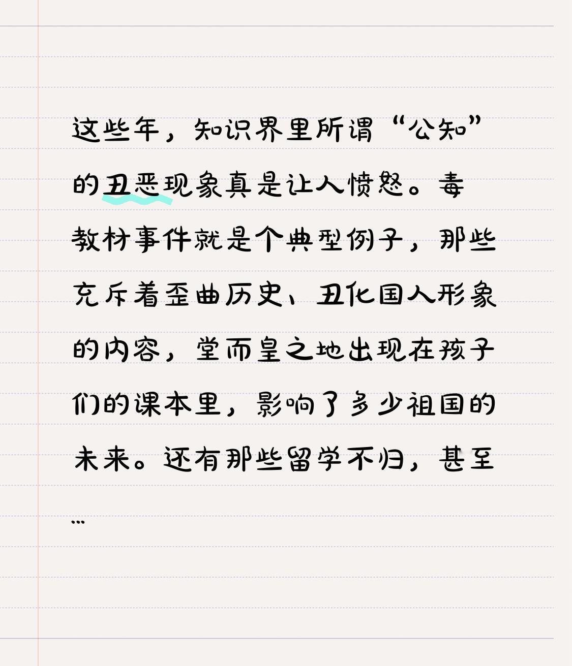 这些年,知识界中所谓“公知”的丑恶行径着实令人愤慨。毒教材事件便是典型例证,那些满是歪曲历史、丑化国人形象的内容,竟堂而皇之地现身于孩子们的课本之中,不知影响了多少祖国的未来。 还有那些留学后不归国,甚至反过来诋毁自己国家的人,他们就是藏在内部的“内鬼”“汉奸”。他们享用着国家培养的资源,却为了一己私利,干着损害国家利益的勾当,简直是民族的败类。 我们必须警惕这些人,绝不能让他们的不良思想继续荼毒社会,要让真正热爱祖国、传播正能量的人引领知识界的风气。否则,若殖民思想占领校园思想文化阵地,培养出来的所谓“才子”将会误国叛党害民!