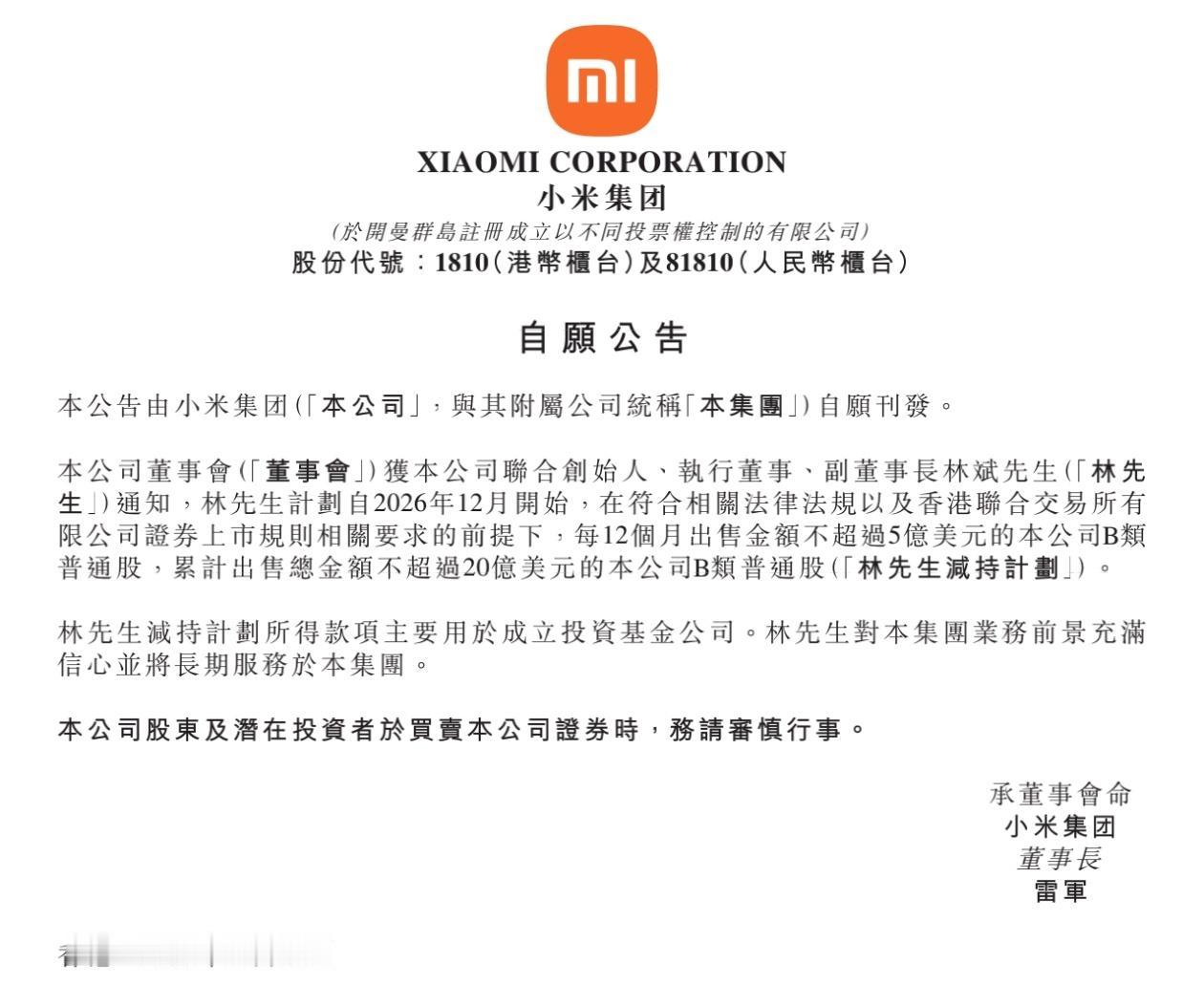 又被小米集团和雷军刷屏了,这次不是因为小米汽车,而是因为副董事长林斌要大幅度减持小米集团股票。 小米集团发布公告,说林斌计划在2026年12月起减持小米股票,每年减持不超过5亿美元,累计减持不超过20亿美元。按现在的汇率,每年差不多减持35亿元,累计减持140亿元左右。 减持的钱说是用于成立投资基金公司,还强调林斌对小米集团业务前景充满信心,也不会辞职。 这个金额确实太大了,消息一出对小米股价的冲击肯定是难以避免的。 我们注意到,最近不管是小米集团还是雷军都在回购或者增持。11月雷军就通过他的全资公司增持了260万股,每股价格38.58港元,算下来花了1亿港元左右。 小米集团也在积极回购股票,单单11月份就回购了超过2500万股,这还是减去了用于激励员工的新发行股票数量之后的。 在12月份,小米集团仍然在大幅度回购股票。从12月1日到12月29日期间,就有16天公布了回购公告,累计回购数量达到了7245万股。目前小米集团股价是什么情况,大家都了解。 此时林斌计划减持,很难不造成负面影响。林斌作为小米的二当家,职务是副董事长。这个副董事长也不能管总,也不能管人,也管不了具体业务,更管不了钱,也就是在董事会举举手,鼓鼓掌,主要还是务虚。 如果是这种情况,那么林斌减持,成立基金公司找点事做,也到可以理解了。【来自懂车帝车友圈】