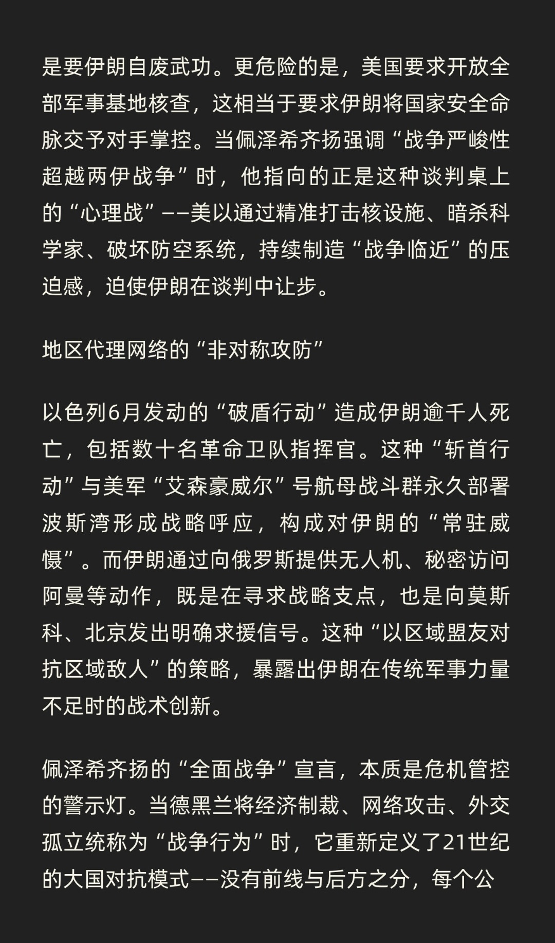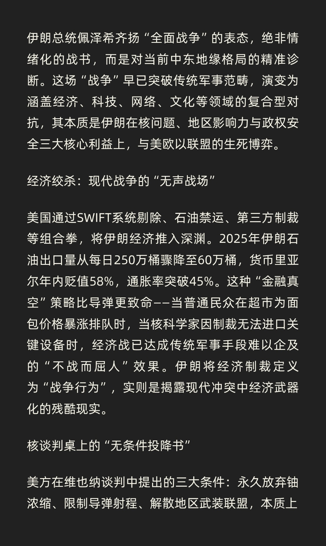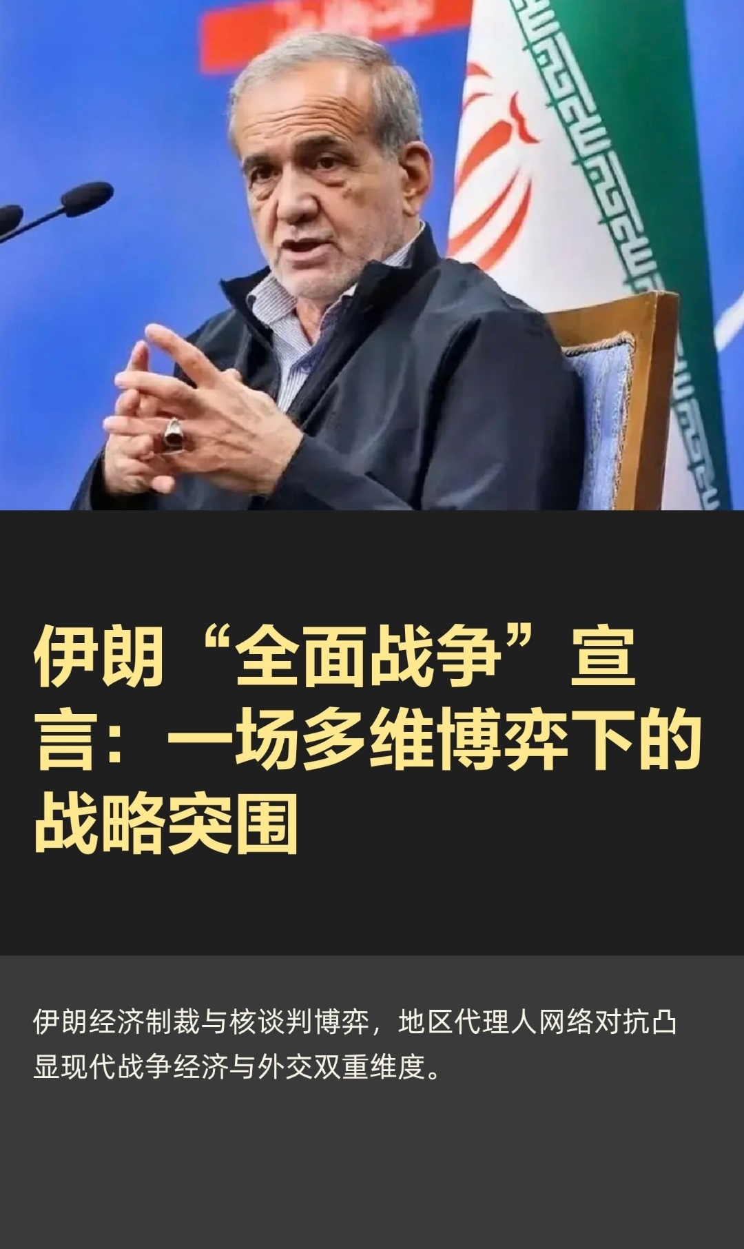 | 伊朗总统佩泽希齐扬“全面战争”的表态,绝非情绪化的战书,而是对当前中东地缘格局的精准诊断。这场“战争”早已突破传统军事范畴,演变为涵盖经济、科技、网络、文化等领域的复合型对抗,其本质是伊朗在核问题、地区影响力与政权安全三大核心利益上,与美欧以联盟的生死博弈。美国通过SWIFT系统剔除、石油禁运、第三方制裁等组合拳,将伊朗经济推入深渊。2025年伊朗石油出口量从每日250万桶骤降至60万桶,货币里亚尔年内贬值58%,通胀率突破45%。这种“金融真空”策略比导弹更致命——当普通民众在超市为面包价格暴涨排队时,当核科学家因制裁无法进口关键设备时,经济战已达成传统军事手段难以企及的“不战而屈人”效果。伊朗将经济制裁定义为“战争行为”,实则是揭露现代冲突中经济武器化的残酷现实。美方在维也纳谈判中提出的三大条件:永久放弃铀浓缩、限制导弹射程、解散地区武装联盟,本质上是要伊朗自废武功。更危险的是,美国要求开放全部军事基地核查,这相当于要求伊朗将国家安全命脉交予对手掌控。当佩泽希齐扬强调“战争严峻性超越两伊战争”时,他指向的正是这种谈判桌上的“心理战”——美以通过精准打击核设施、暗杀科学家、破坏防空系统,持续制造“战争临近”的压迫感,迫使伊朗在谈判中让步。以色列6月发动的“破盾行动”造成伊朗逾千人死亡,包括数十名革命卫队指挥官。这种“斩首行动”与美军“艾森豪威尔”号航母战斗群永久部署波斯湾形成战略呼应,构成对伊朗的“常驻威慑”。而伊朗通过向俄罗斯提供无人机、秘密访问阿曼等动作,既是在寻求战略支点,也是向莫斯科、北京发出明确求援信号。这种“以区域盟友对抗区域敌人”的策略,暴露出伊朗在传统军事力量不足时的战术创新。佩泽希齐扬的“全面战争”宣言,本质是危机管控的警示灯。当德黑兰将经济制裁、网络攻击、外交孤立统称为“战争行为”时,它重新定义了21世纪的大国对抗模式——没有前线与后方之分,每个公民都是战士,每台离心机都是战场。这场博弈的最终走向,将取决于伊朗能否在内部团结与外部支援间找到平衡点,更取决于美欧以联盟是否愿意为短期战略利益付出长期对抗的代价。中东的火药桶,正等待新的变量点燃或熄灭。