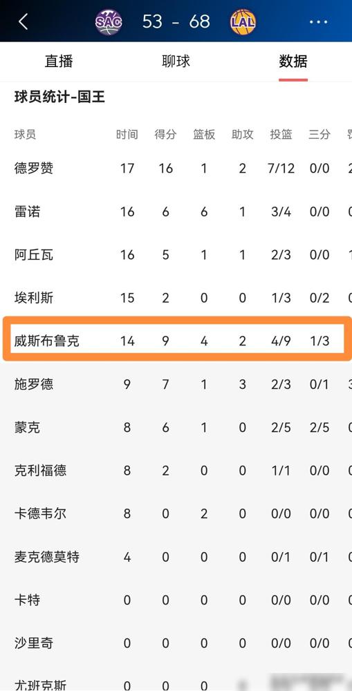 国王球星威斯布鲁克真是太反常了!在今天国王客场挑战湖人的上半场比赛中,威少显得有些斗志不足,他在首发出战的14分钟里,投篮9中4,其中三分球3中1得到9分4篮板2助攻1抢断,出现了4次失误,他的场上正负值为-9。 老实说,这场重回洛杉矶的戏码,威少这种慢热甚至带点“疲软”的状态,真的让很多期待他大爆发的球迷扑了个空。 按理说回客场打老东家,他那种哪怕手感不行也要在身体对抗上赢回来的性格,今天居然没看到。 最让我揪心的其实是那4个失误,短短14分钟就送出这么多球权,这在快节奏的强强对话里太致命了。 感觉他今天在场上的专注度并不高,正负值掉到-9也说明他在场时,球队的节奏确实被打乱了。 我总觉得,威少打球是极其看重情绪反馈的,今天这种“心不在焉”可能说明他还没找到那种兴奋点。 相比以往遇到湖人就跟打了鸡血一样的拼劲,今天这半场表现确实有点过于“温柔”了。 可能也是因为随着赛季推进,这种所谓的“复仇”心态在慢慢淡化,但也说不准是不是身体状态没调整好。 但我还是觉得,如果威少找不回那种横冲直撞的能量感,他在场上的威慑力确实会打不小的折扣。 希望下半场他能赶紧紧紧发条,哪怕数据没那么亮眼,起码要把那个充满活力的威少给带回来啊。