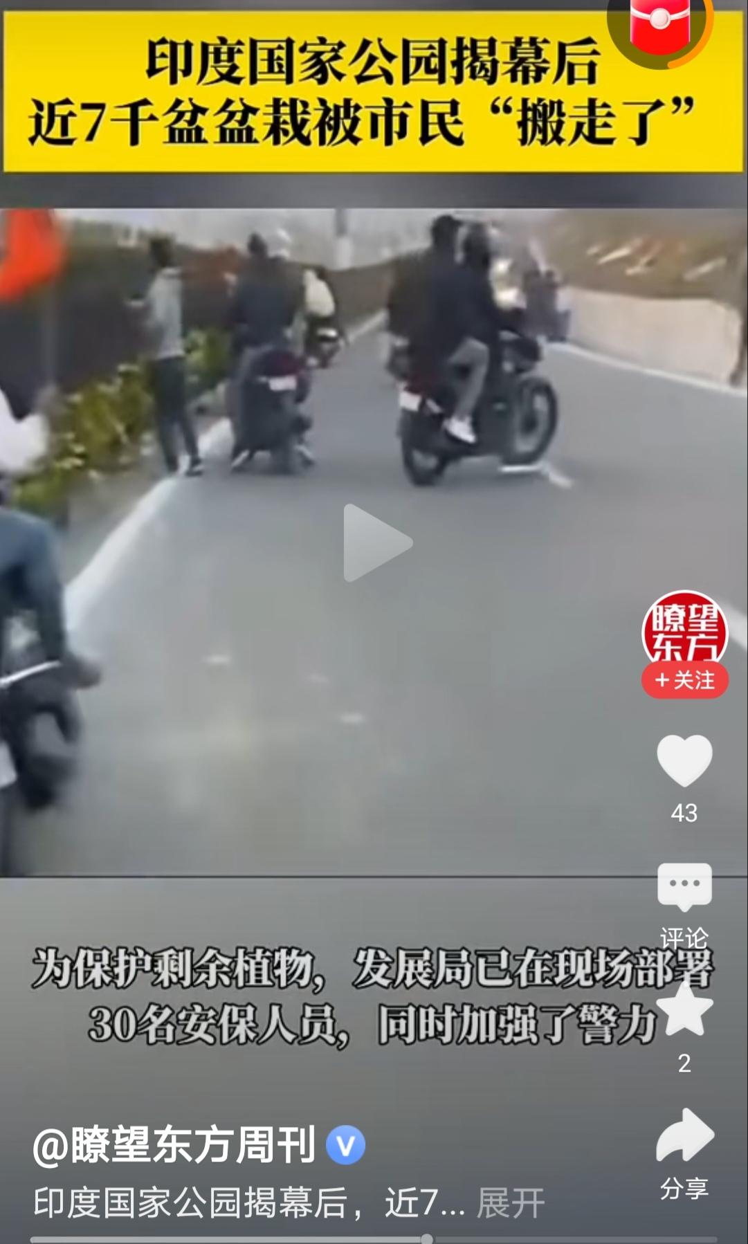 印度国家公园揭幕后,近7000盆盆栽被市民“搬走了” 近日,在印度勒克瑙“国家励志公园”开园后24小时内,该活动一项价值600万卢比(约合47万元人民币)的园艺项目中近7000盆盆栽被民众纷纷拿走了。 12月27日,据《印度时报》报道,勒克瑙发展局官员表示,盗贼行为从25日印度总理莫迪为该公园揭幕活动后不久就开始了,为保护剩余的植物,发展局已在现场部署30名安保人员,同时加强警力。 其实,这种违法行为很有印度特色。近期,印度刚发生了一名护士酒店找人敲错门,被3名男子拉进房间灌酒侵害。令人惊讶的是这3名男子其中两人是银行职员,另一人还是某顶尖大学硕士研究生,属于高学历的知识分子还干出这种违法行为。可见,印度民众的法律观念淡薄,对法律缺乏足够的认知、尊重和遵守意识,这也许是造成严重社会问题的根本原因之一。
