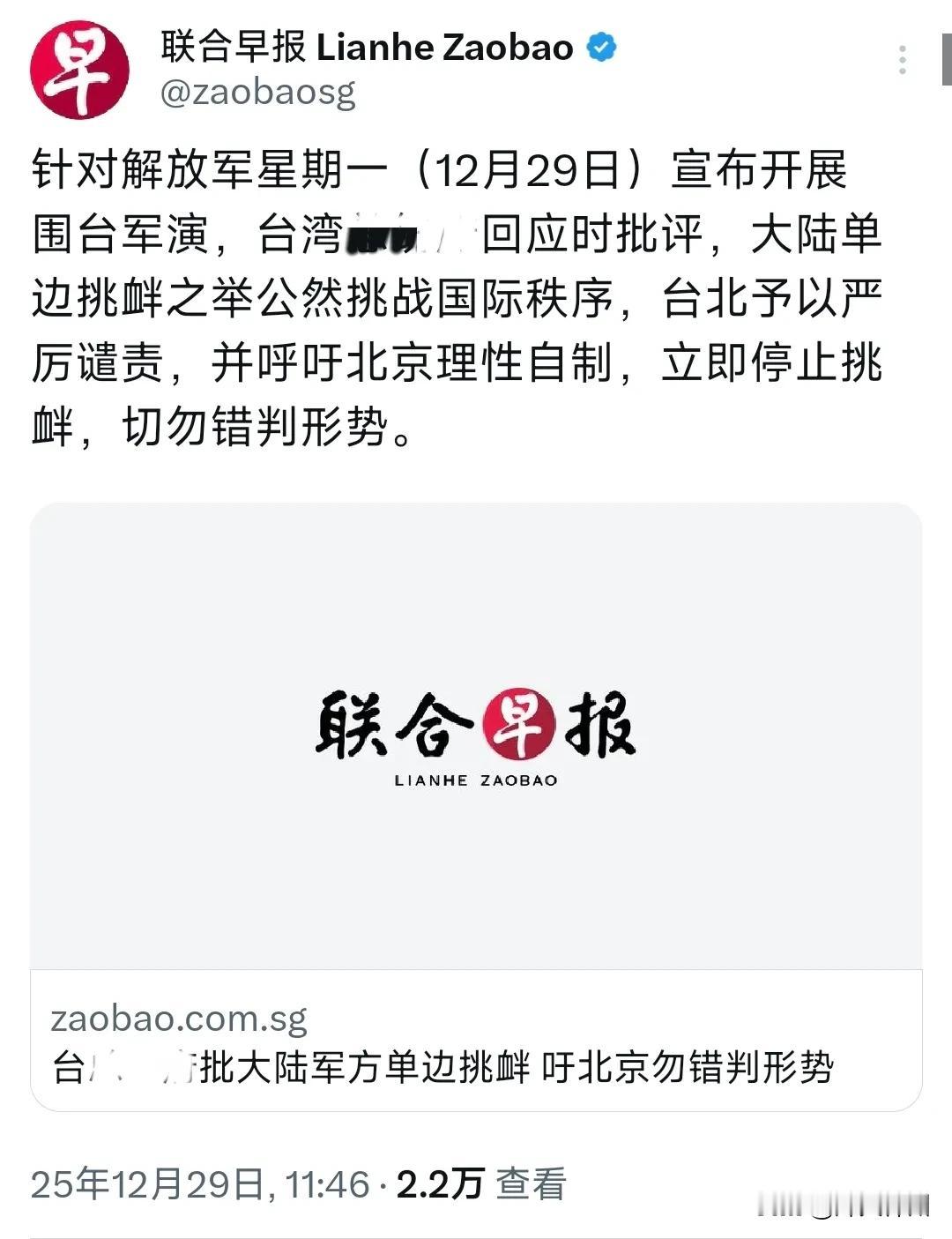 新加坡联合早报今天(12月29日)报道:“针对解放军星期一(12月29日)宣布开展围台军演,赖清德当局回应时批评,大陆单边挑衅之举公然挑战国际秩序,台北予以严厉谴责,并呼吁北京理性自制,立即停止挑衅,切勿错判形势。” 评几句: 解放军开展围台军演,是捍卫国家主权、震慑“台独”分裂势力的正义之举,却被赖清德当局扣上“挑衅国际秩序”的帽子,这一说法毫无道理。 什么是国际秩序?联合国宪章明确规定的主权领土完整原则,才是国际秩序的基石。“台独”分裂行径,才是破坏台海和平稳定、践踏国际秩序的根源所在。 赖清德当局一边依附外部势力,一边叫嚣“谴责”,不过是故作强硬的政治秀。要明确的是,“台独”分裂行径,注定没有出路!