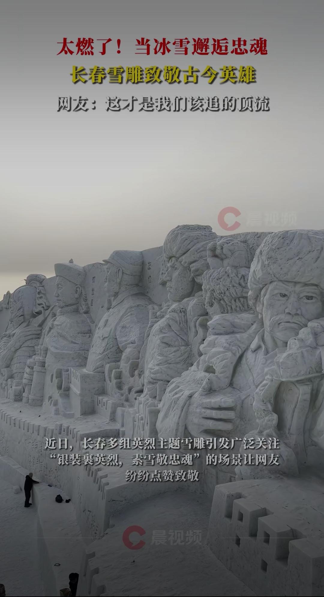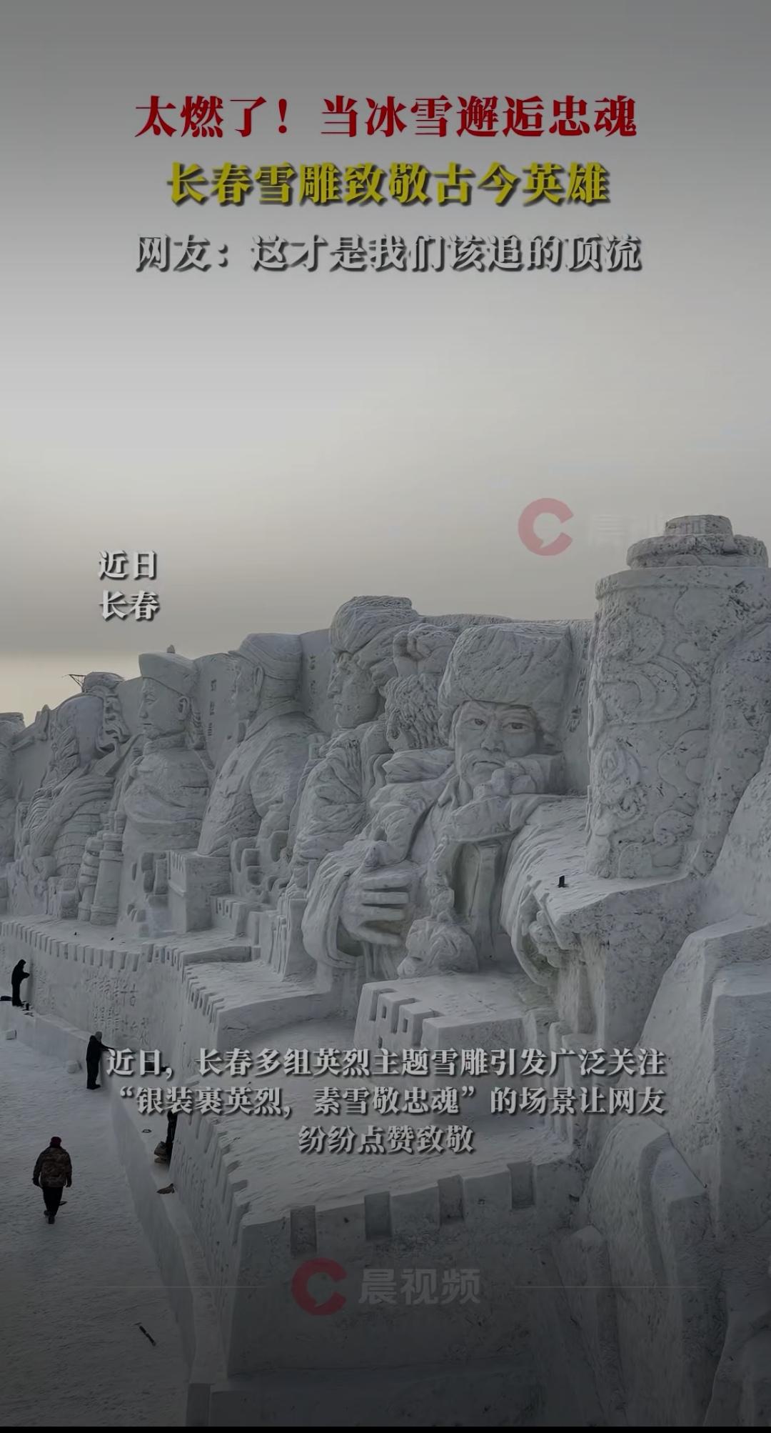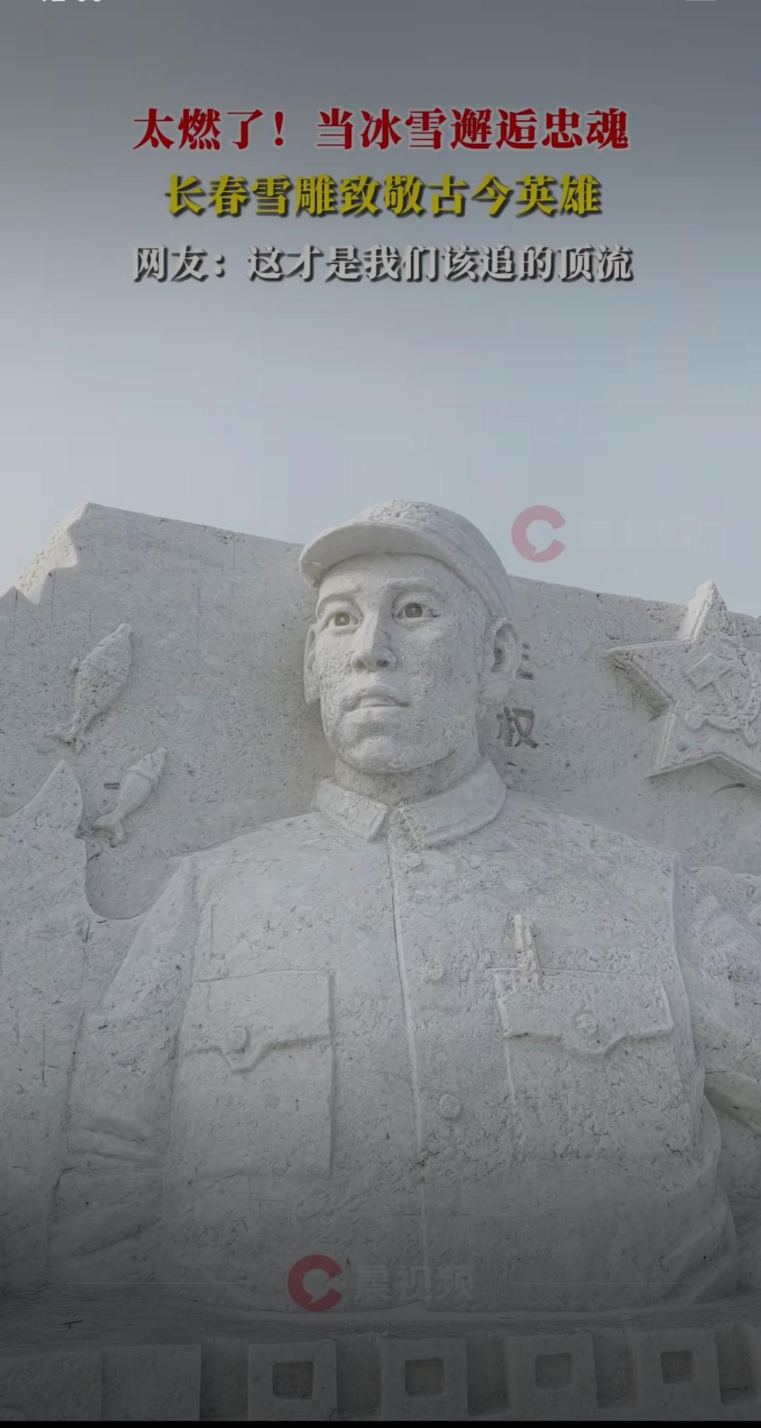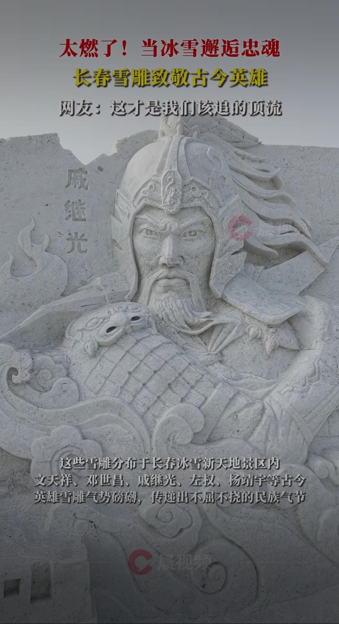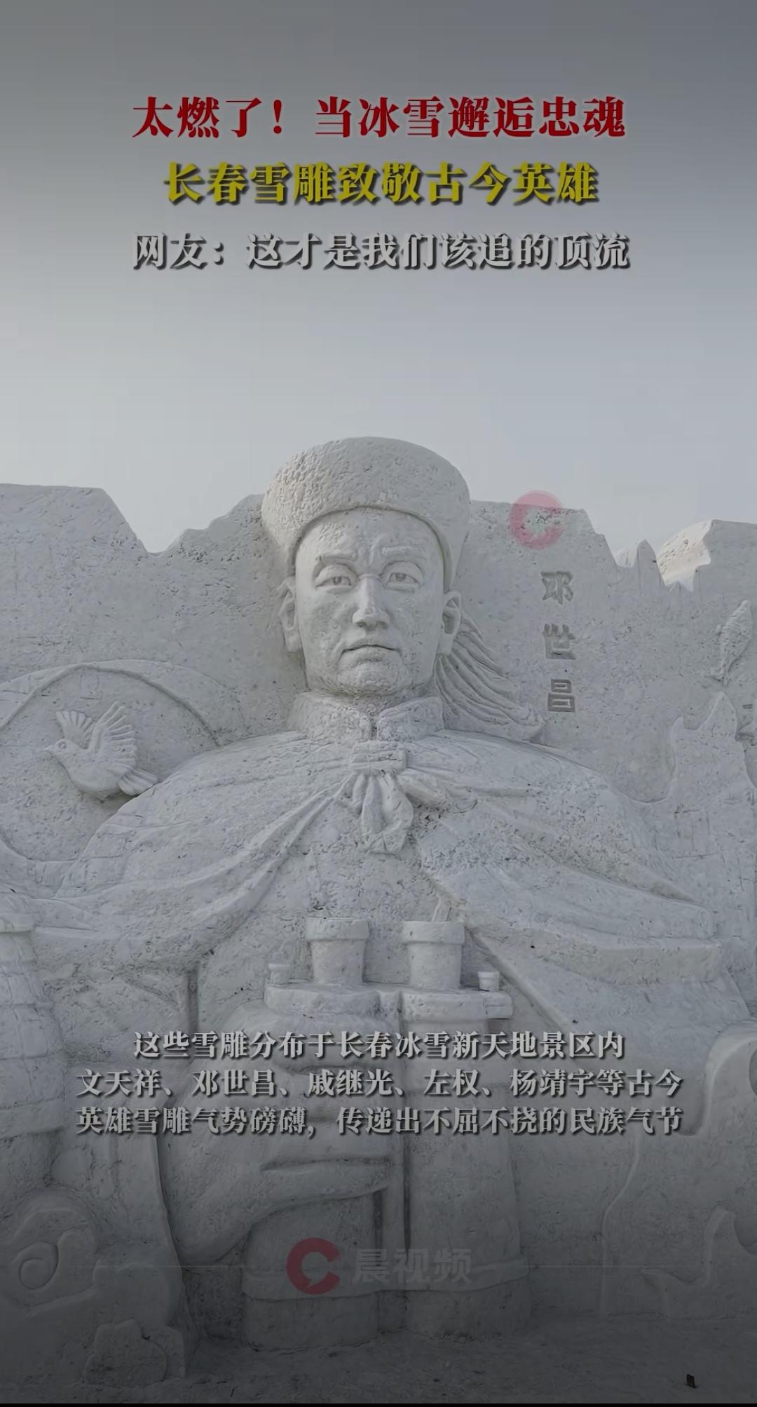 太燃了!长春冰雪里的忠魂群像,这才是刻进骨子里的顶流!以雪为媒、致敬英魂 当冰雪邂逅忠魂,当匠心致敬英雄,长春冰雪新天地里的一座座雪雕,瞬间戳中了无数中国人的泪点与燃点!文天祥昂首挺立,一身正气凛然,“人生自古谁无死”的呐喊仿佛穿透风雪;邓世昌怒目圆睁,仿佛仍在甲午海战的波涛里挥剑冲锋;戚继光身披铠甲,目光如炬,镇守着家国安宁的防线;左权、杨靖宇的身影挺拔刚毅,白山黑水间的抗日烽火,在冰雪雕琢中熠熠生辉。 这些雪雕不是冰冷的雕塑,而是滚烫的民族魂。它们没有流量明星的精致妆容,却有着震撼人心的力量;它们没有哗众取宠的噱头,却让每一个驻足的人肃然起敬。当网红明星的八卦占据热搜时,这些英雄的名字,才是我们最该铭记的“顶流”——是他们用血肉之躯筑起长城,用铮铮铁骨撑起民族脊梁,换来了如今的山河无恙、岁月静好。 网友们的评论戳中人心:“这才是我们该追的星!”“冰雪为媒,致敬忠魂,看得人热血沸腾!” 是啊,真正的偶像,从来不是那些昙花一现的流量,而是这些为国家、为民族奉献一切的英雄。长春这场冰雪之约,不仅是一场视觉盛宴,更是一次深刻的精神洗礼——它让我们明白,英雄从未远去,他们的精神,永远在中华儿女的血脉里传承。 当你站在这些英雄雪雕前,你最想对他们说一句什么?