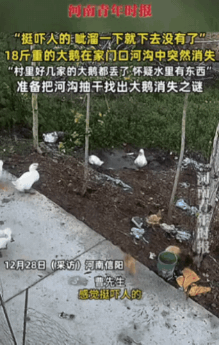 解释不清了!河南一只18斤大鹅去河沟喝水,结果下一秒,大鹅突然在水里扑腾,呲溜一下,就没有了踪迹,鹅主人回来后,感觉很不可思议,而且村里好几家的大鹅都丢了,怀疑水里有东西,准备把河沟抽干,找出大鹅消失之谜,鹅主人坦言:反正挺吓人的,没敢下去! 这事儿发生在河南信阳,鹅主人姓曹。按他说的,11月初的一天,他家那只快20斤的大鹅去门口河沟喝水,没成想监控里就看到大鹅在水里扑腾了几下,嗖地一下就没影了。更怪的是,村里不止他一家,好几户养的家禽都这么莫名其妙没了。 曹先生觉得邪乎,就想着把河沟水抽干看看究竟。这事儿一传到网上,好多人都好奇,水里难不成藏着啥大家伙?结果等真把水抽干了,就找到大鹅的尸体,浑身是伤,可水里连个可疑的影子都没见着。 这时候就有人开始琢磨不对劲了。有网友翻出曹先生发的监控视频,发现大鹅被拖下去的那几秒,画面糊得厉害,可其他时候都挺清楚。曹先生说是监控像素不行,但这解释听着有点勉强。更巧的是,曹先生自己是搞装修的,之前社交媒体账号没多少人看,自从发了大鹅消失的视频,点赞关注一下就上去了,抽水的时候还开了直播,不少人瞅着就像在凑热度。 还有时间线也有点说不通。曹先生说大鹅11月9号没的,可视频是12月底才发出来的,中间隔了快俩月。他解释说是一开始没找到大鹅,后来朋友提醒才发上网,可网友觉得这间隔太长,难免让人多想。甚至有人猜,会不会是提前绑了绳子把大鹅往水里拽,故意弄出这么个玄乎事儿。 说实在的,农村丢个家禽本来不算啥新鲜事,可这事儿被这么一折腾,就变了味。要是真有啥不明生物,抽干水总能留点痕迹;要是人为的,那这戏演得也太刻意了。现在网络上想靠稀奇事博眼球的不少,可真真假假混在一起,就容易让大家看糊涂。 各位读者你们怎么看?欢迎在评论区讨论。