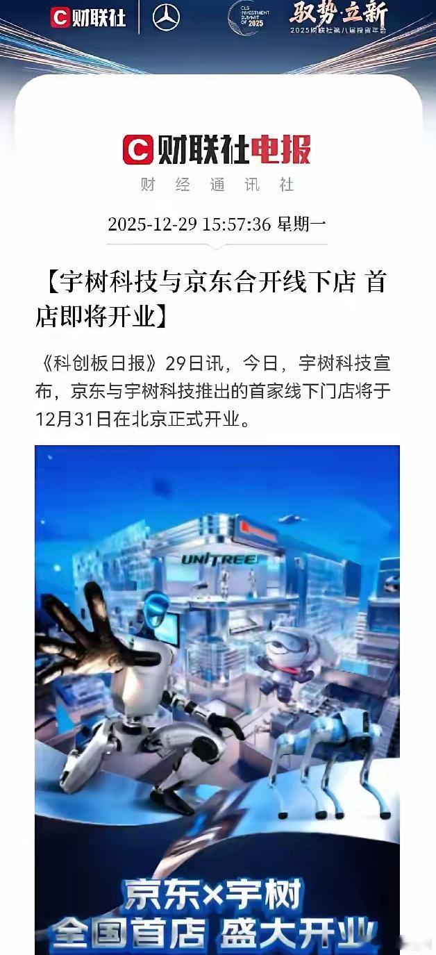 宇树科技联手京东放大招!人形机器人又迎来了大利好消息!不出意外的话,明日人形机器人板块有望继续大爆发,持仓机器人的股民们要乐开花了下午3点57分,《科创日报》最新消息,今日,宇树科技宣布,京东与宇树科技推出了首家线下门店将于12月31日在北京正式开业,这个消息是重大利好,对于机器人板块是火上浇油了,宇树科技与京东合作开设首家线下门店,其意义远超单纯的开一家店,而是人形机器人产业迈向商业化、大众化的关键一步,宇树科技机器人在京东强大的线下引流下,人形机器人将会获取最大化的曝光和消费者体验流量,这将会极大地提升人形机器人的品牌形象和公众认知,宇树科技有望从科技公司正式向消费级科技品牌公司转型,这将为未来家庭配备人形机器人打好基础,这对于宇树科技来说是重大利好!对于整个人形机器人产业都是重大利好!
