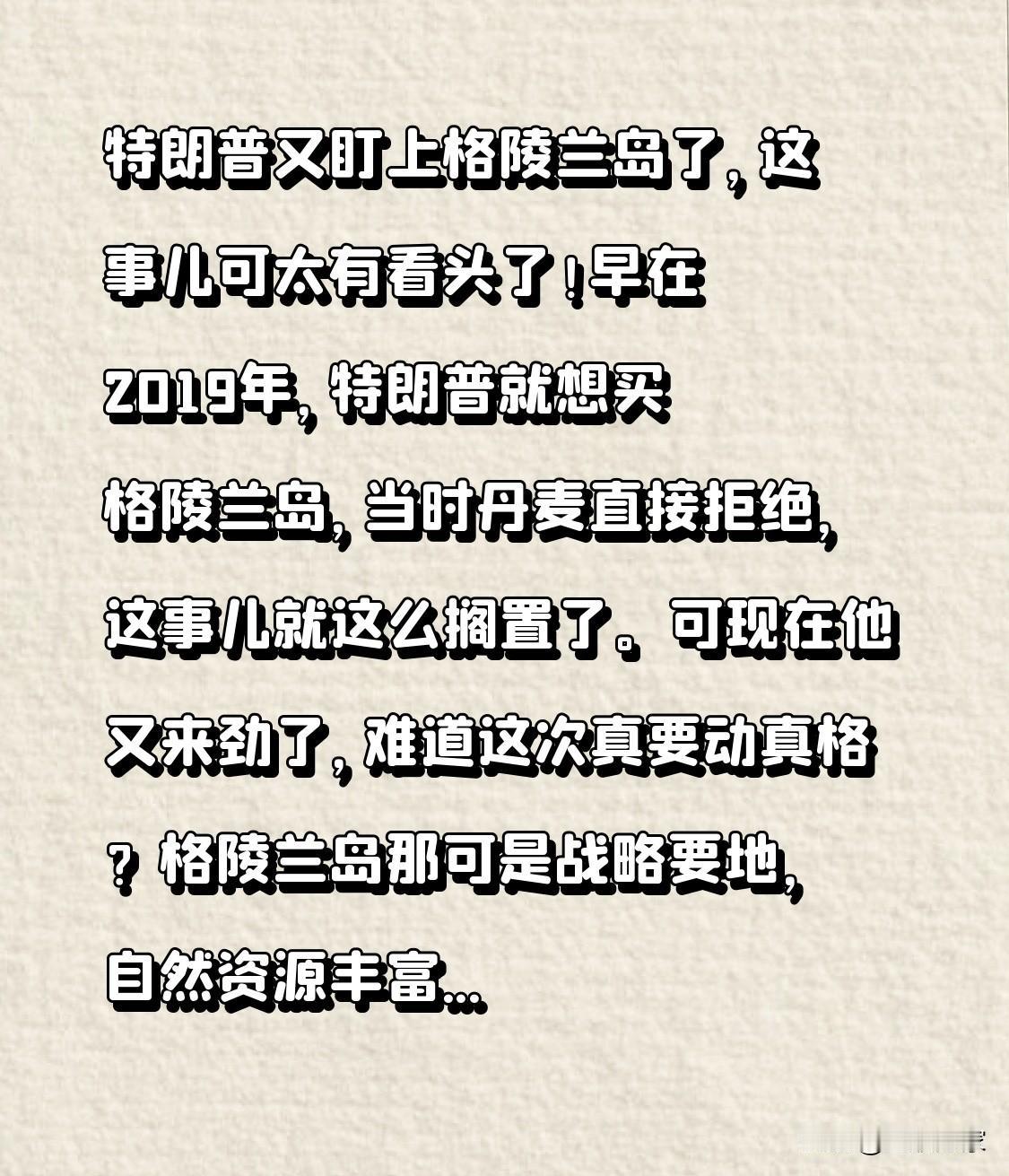 特朗普又盯上格陵兰岛了,这事儿可太有看头了!早在2019年,特朗普就想买格陵兰岛,当时丹麦直接拒绝,这事儿就这么搁置了。可现在他又来劲了,难道这次真要动真格? 格陵兰岛那可是战略要地,自然资源丰富,有石油、天然气还有各种矿产。美国要是拿下它,在北极地区的影响力肯定大增。不过丹麦也不会轻易放手,毕竟这是自己的“地盘”。特朗普这次是故技重施,还是真有大动作,真让人摸不着头脑。 大家觉得特朗普这次能如愿拿下格陵兰岛吗?这背后又会有怎样的政治博弈?美国和丹麦又会擦出怎样的火花? 美国占格陵兰岛 格陵兰岛现状 格陵兰地位 格陵兰地缘战略 格陵兰危机 格陵兰岛历史 格陵兰地图 格陵兰岛问题 格陵兰岛历史 格陵兰地图 格陵兰岛问题 格陵兰旅游 格陵兰岛冰 夺取格陵兰岛 西格陵兰岛